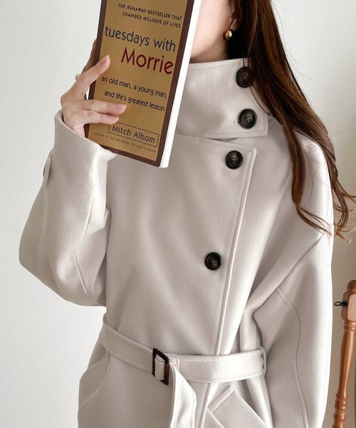 印象的なスタンドカラーのニットモッサロングコート。