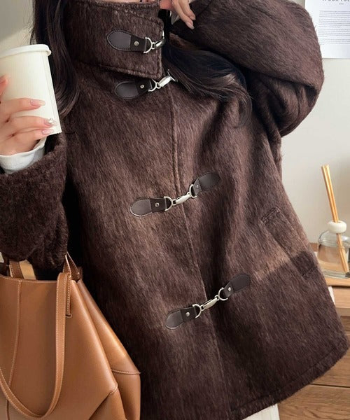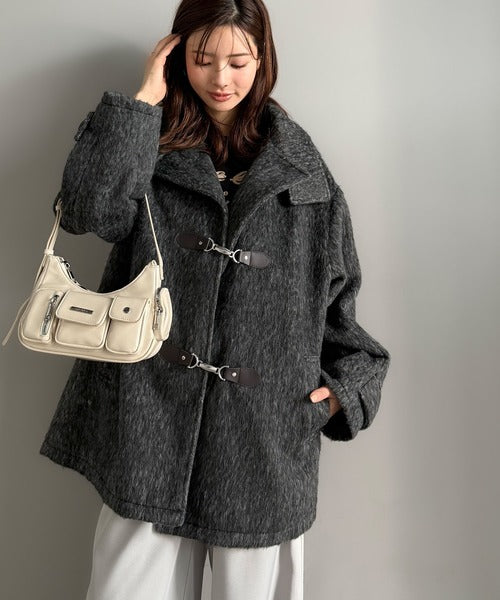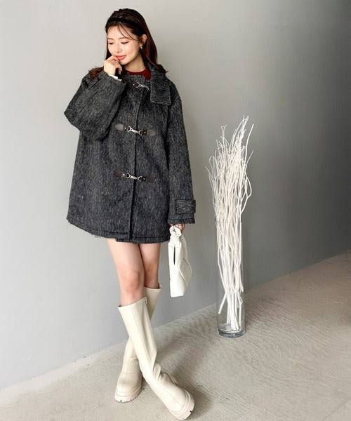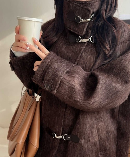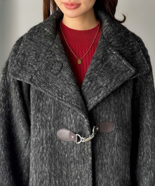 華やかさと暖かさを両立したフェザーシャギーバックル使いコート。