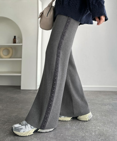 サイドの別生地ラインとさりげないホックがアクセントのリブニットパンツ。