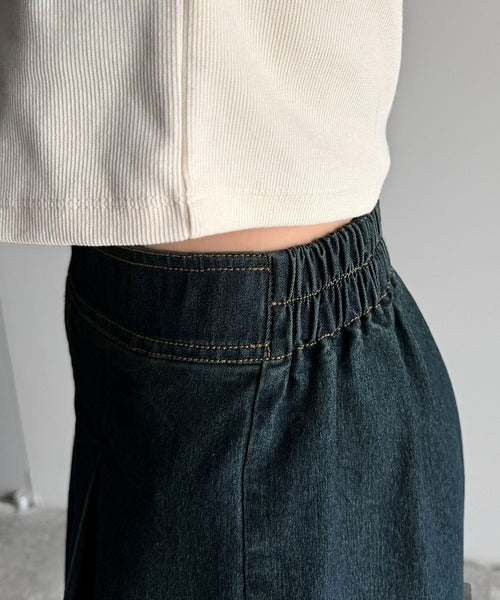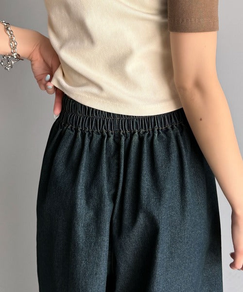 後ろゴム仕様のウエストでフィット感があり、ストレッチデニム素材で動きやすさも◎