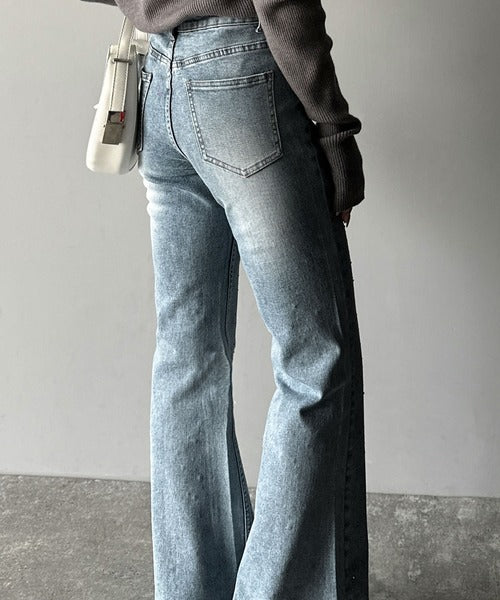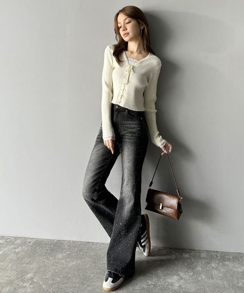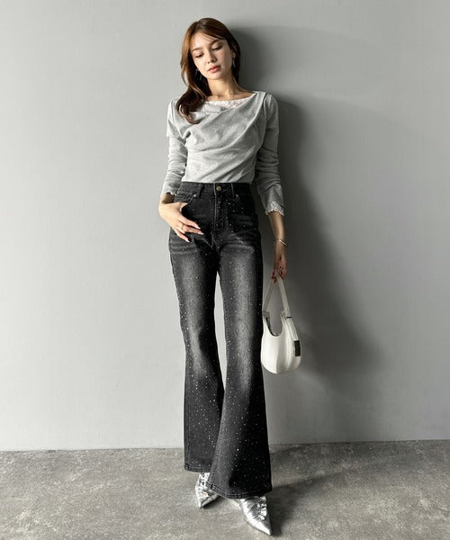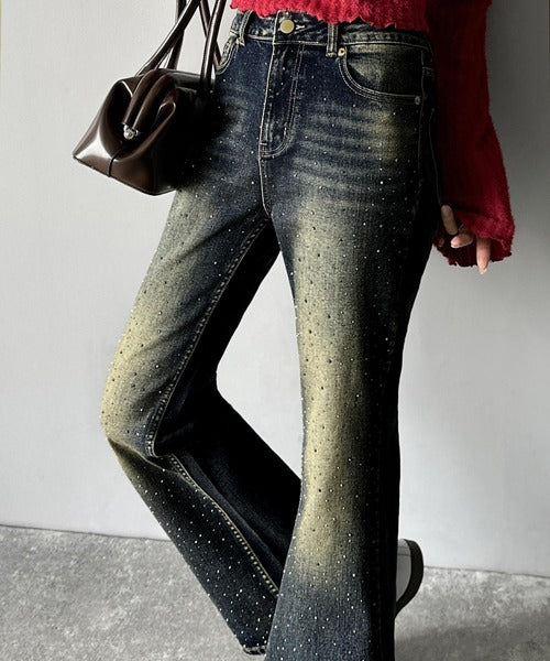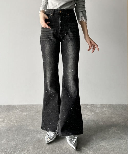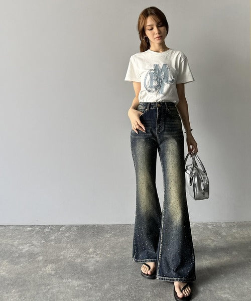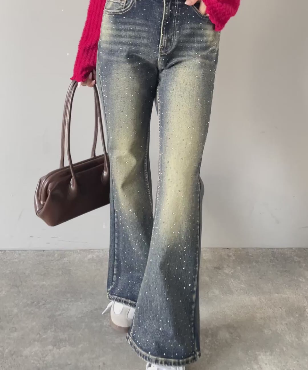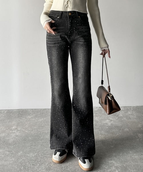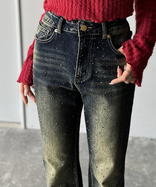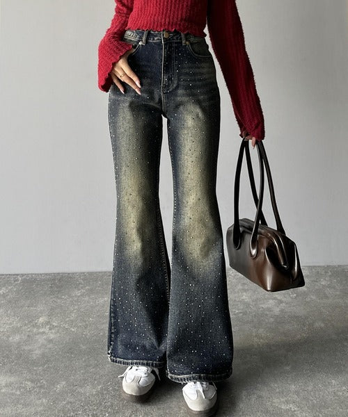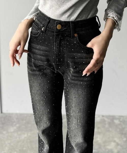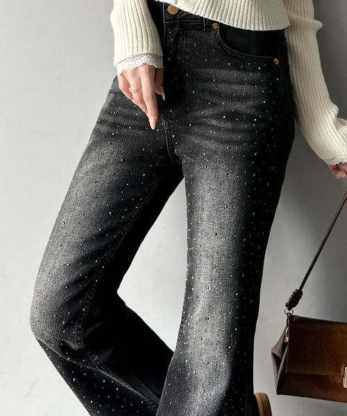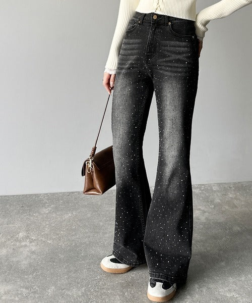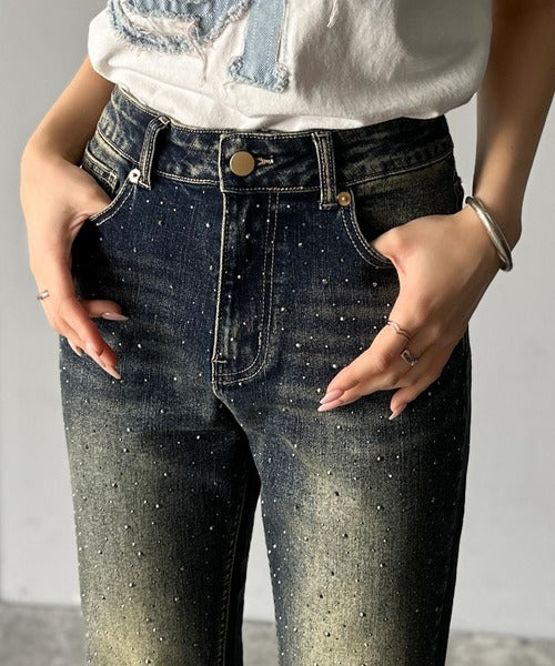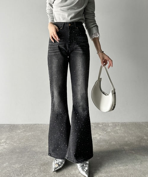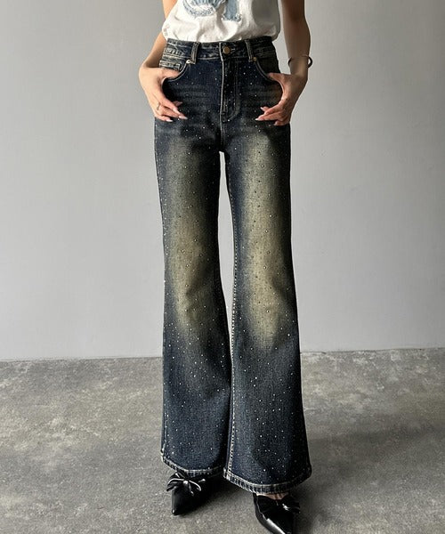【mily bilet】動くたび、キラキラ輝くビジューストーンが主役。ヴィンテージライクフレアデニムパンツ mi0909012