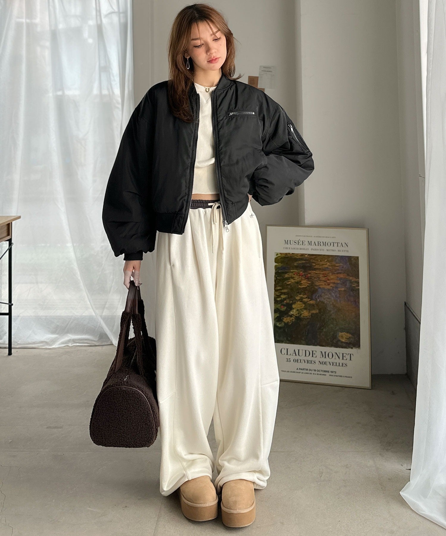 同色素材のボトムスとセットで揃え、セットアップ風にするのもオススメ◎