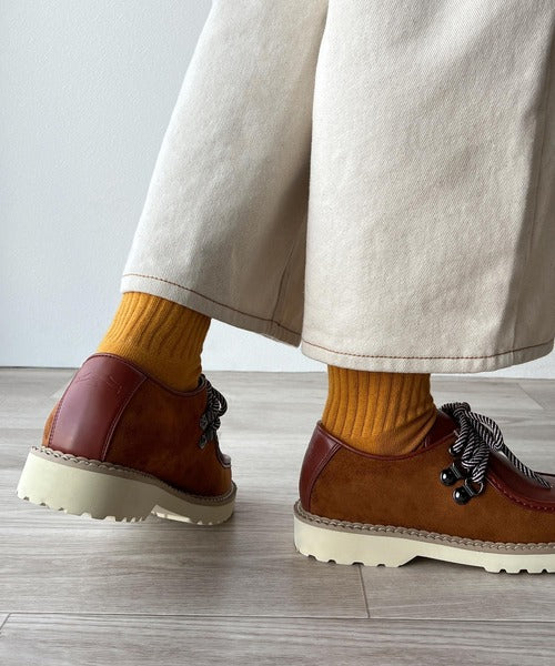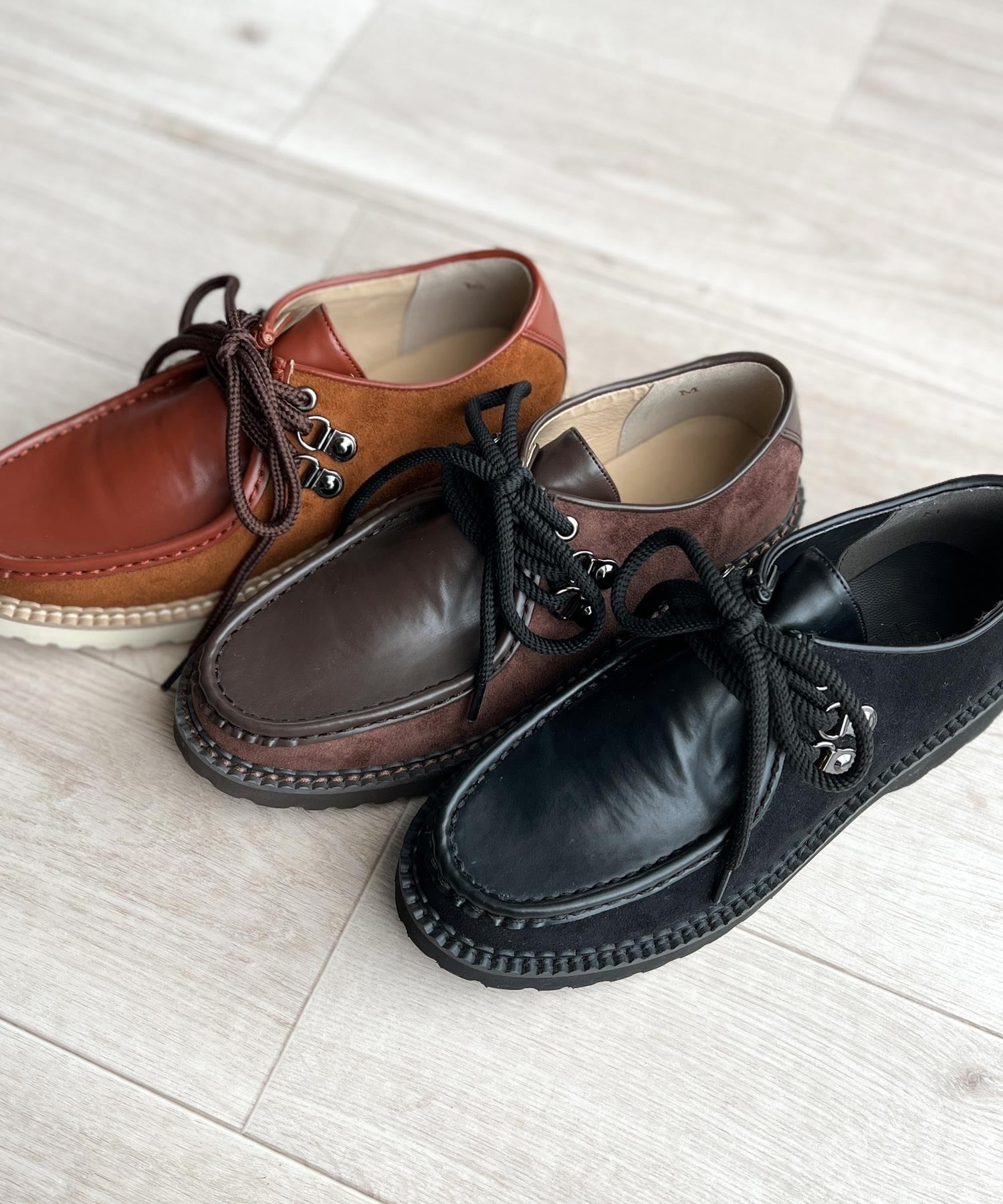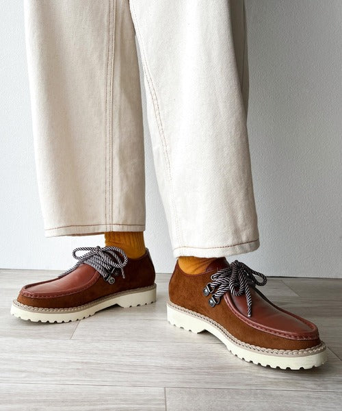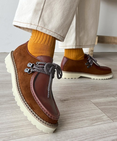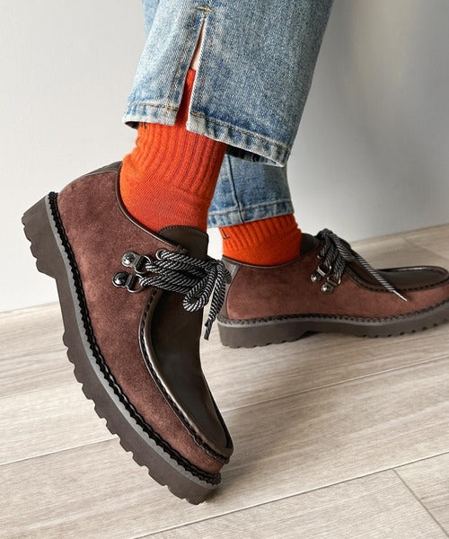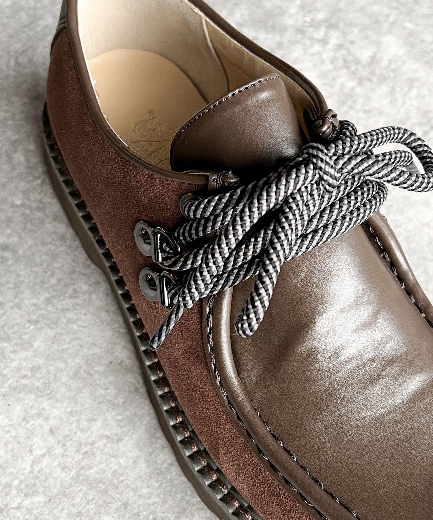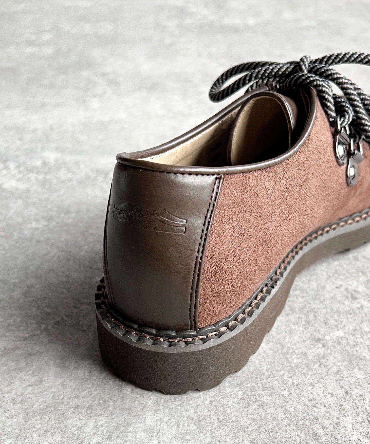 マウンテンシューズディテールも加えているクラシックなチロリアンシューズをポリスウェードとPUで素材切り替えしたモデル。