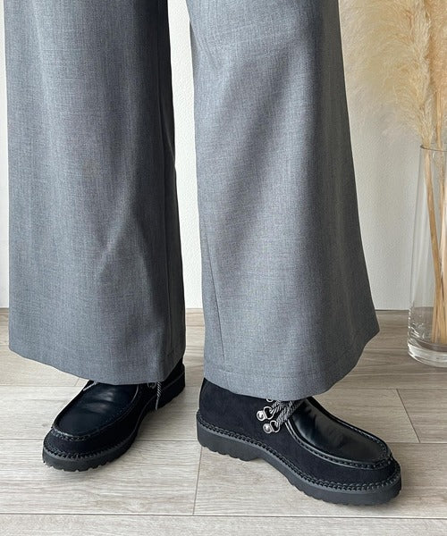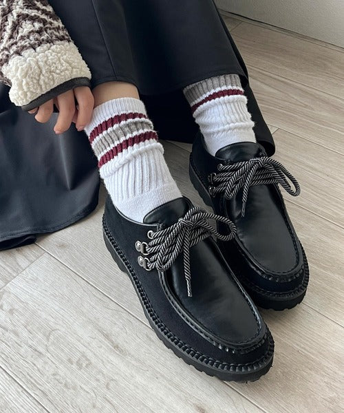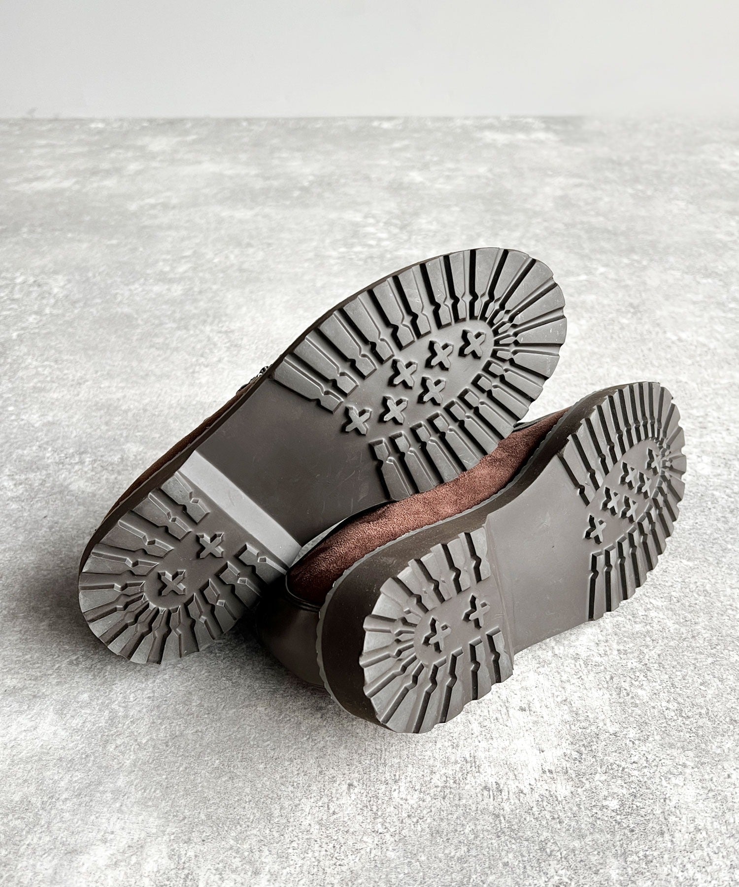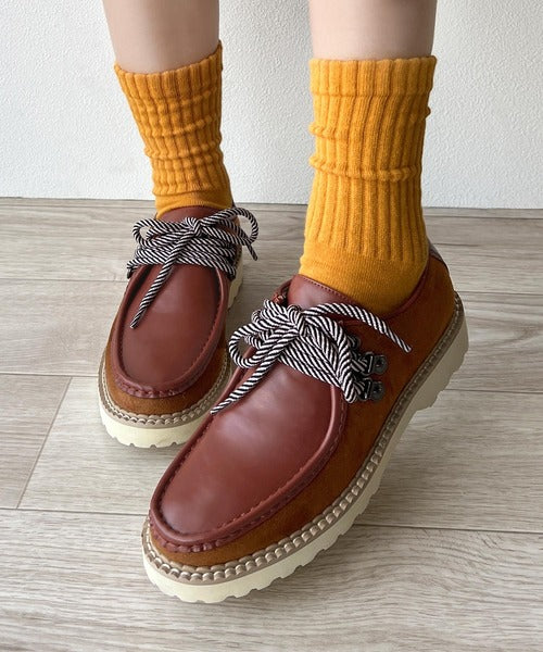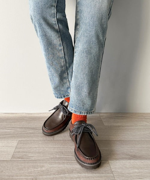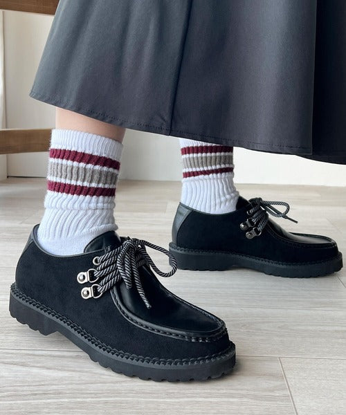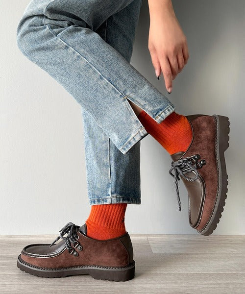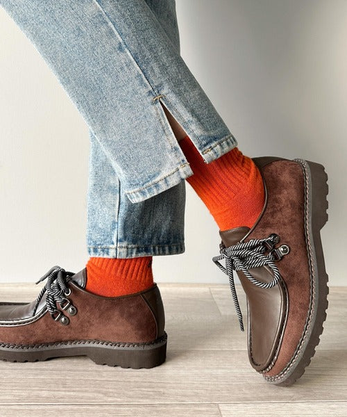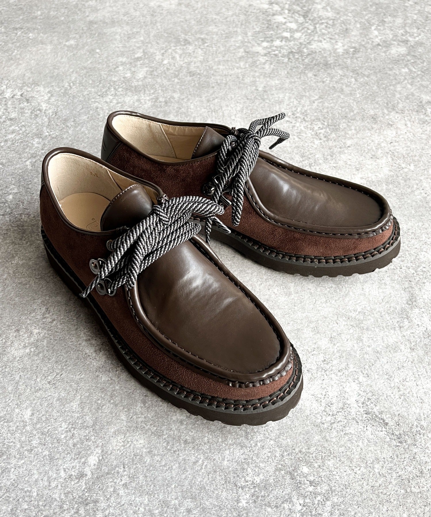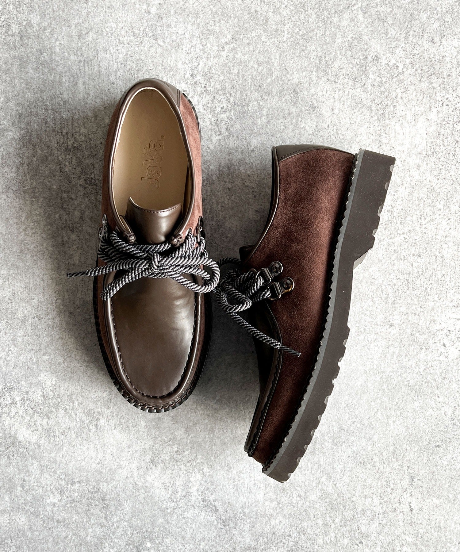 マウンテンシューズディテールも加えているクラシックなチロリアンシューズをポリスウェードとPUで素材切り替えしたモデル。