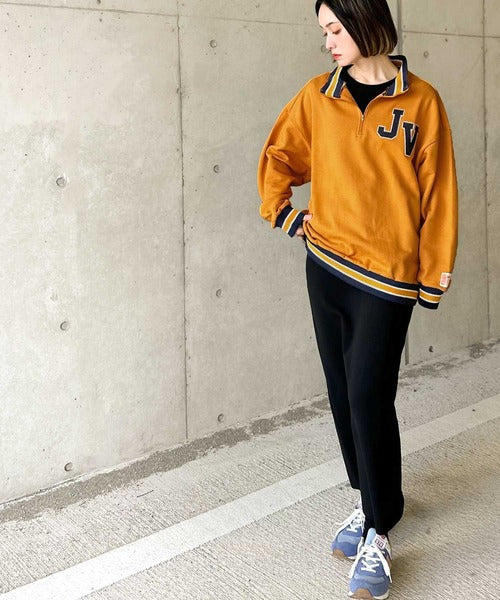 トレンドのハーフジップに90年代漂うワッペンとボーダーリブがポイントの1枚。