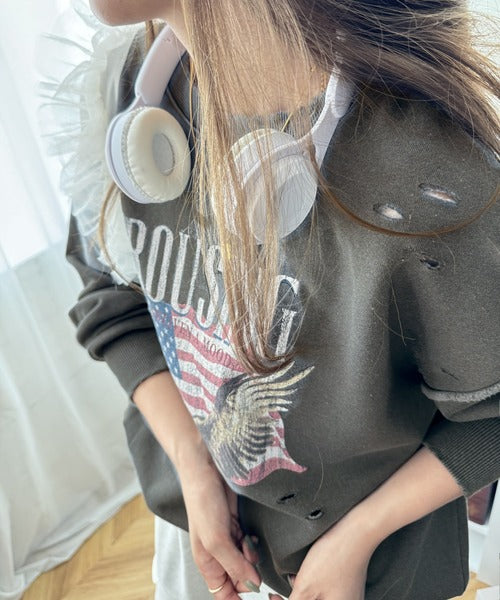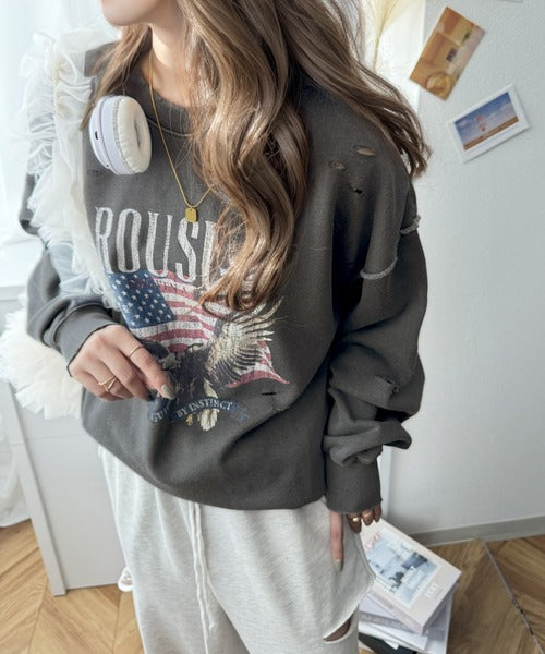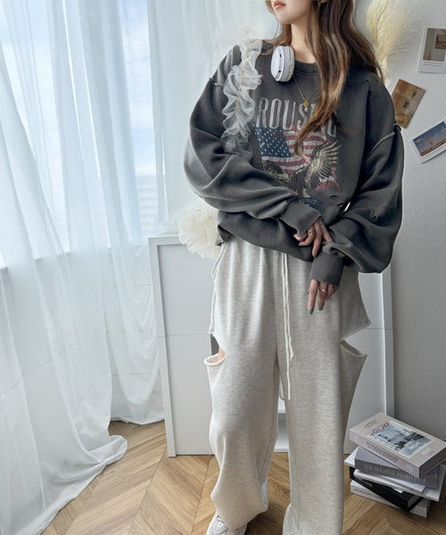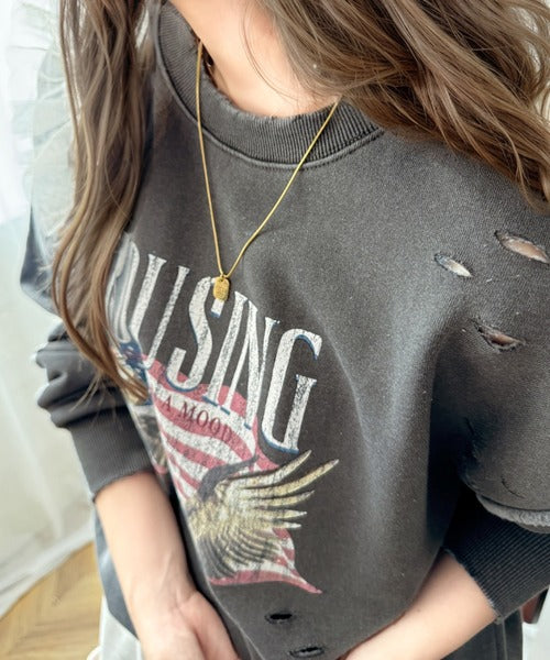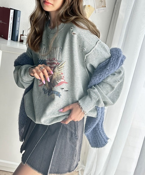 《JaVa ジャバコラボ》カジュアル好きさんのマストアイテム。ヴィンテージプリントダメージ裏起毛スウェット jv1050242