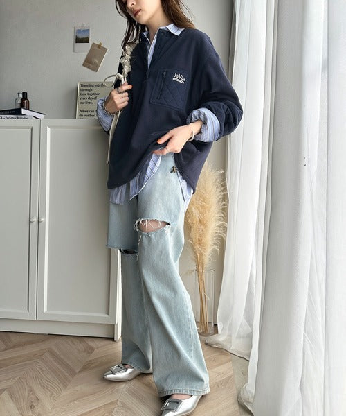 シャツやカットソーなどのインナーを覗かせたレイヤードスタイルにもぴったり。