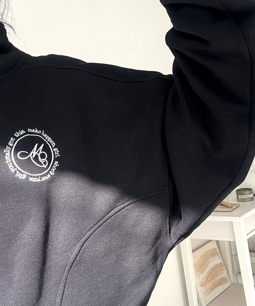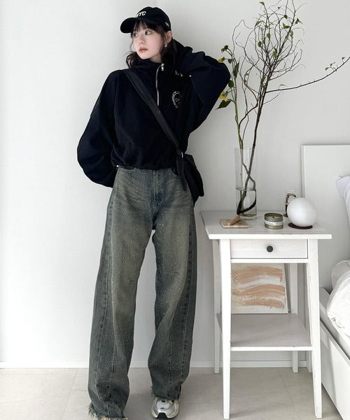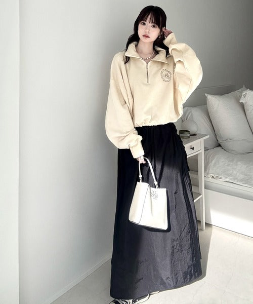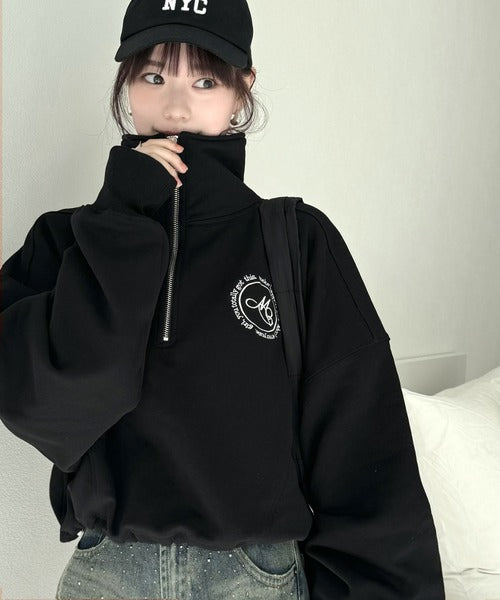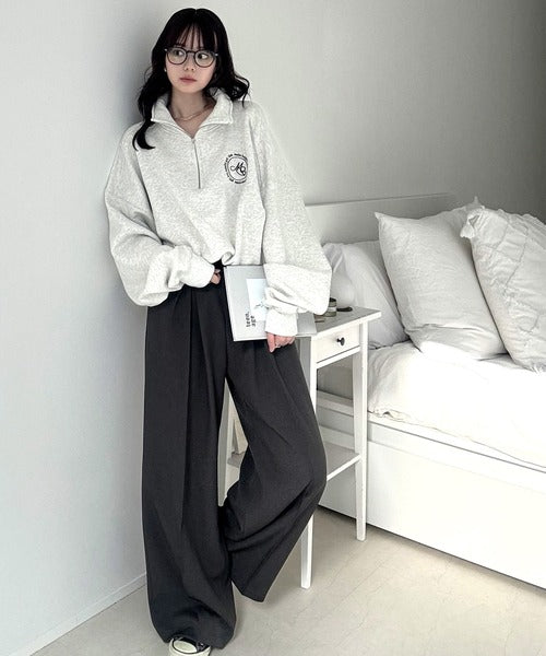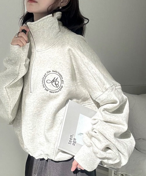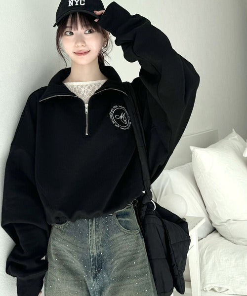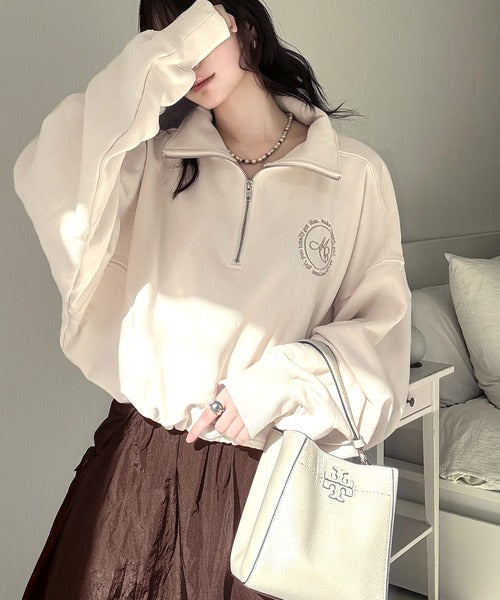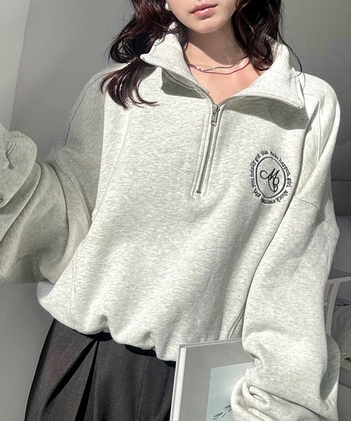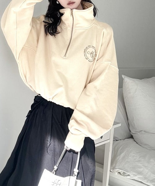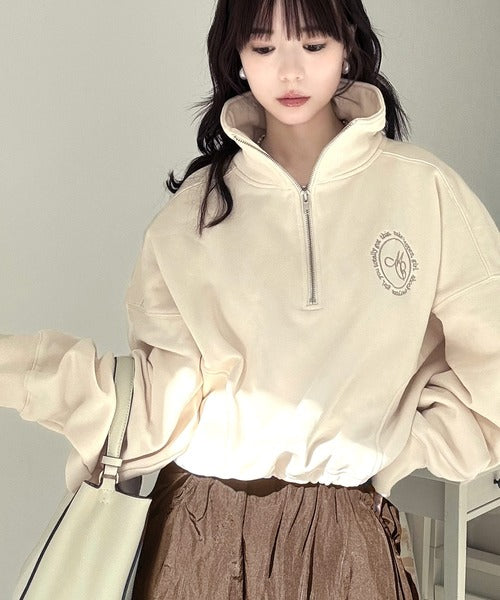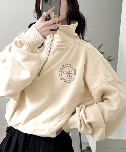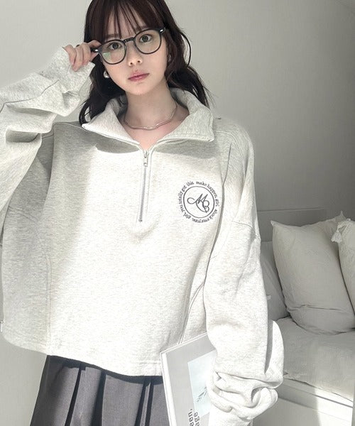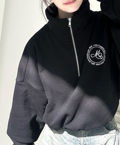 【mily bilet】大人のデイリートップス。裏起毛胸刺繍ハーフジップクロップド丈裾スピンドルスウェット mi1329007