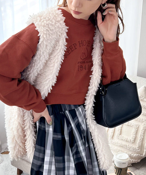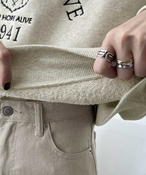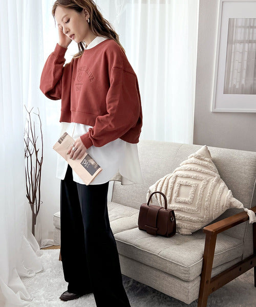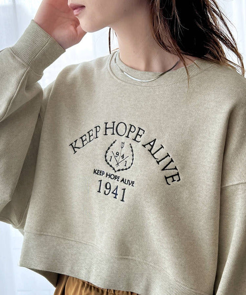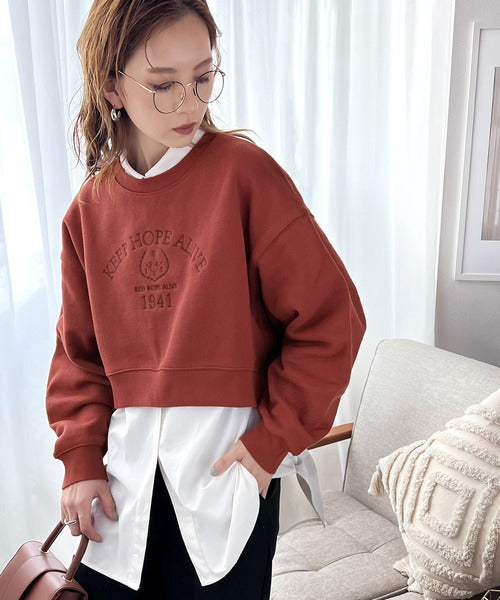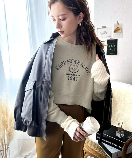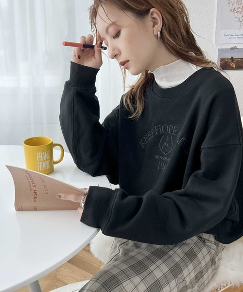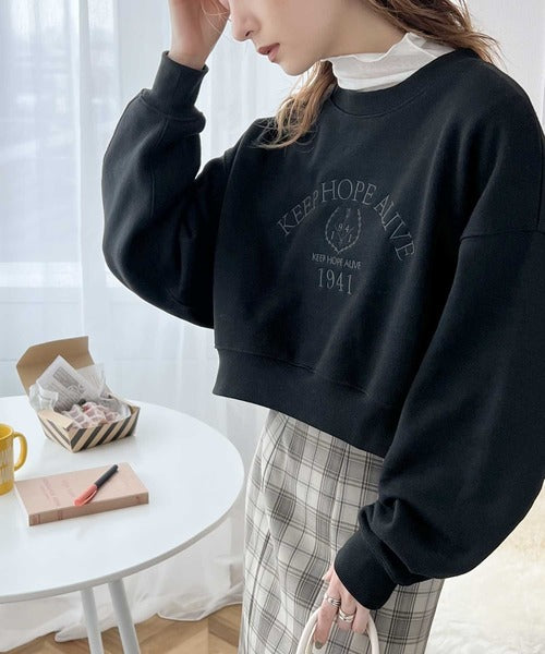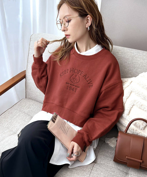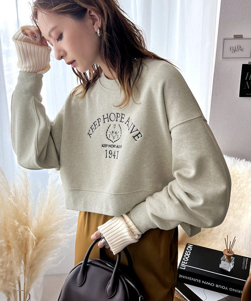 レトロ感漂う、刺繍モチーフ入りのクロップド丈のコットン100%裏起毛スウェット。