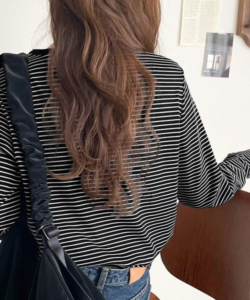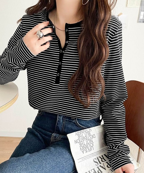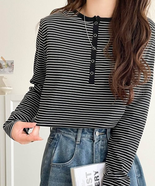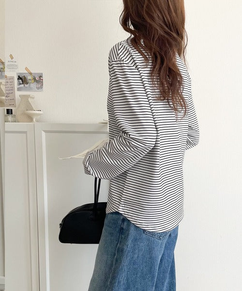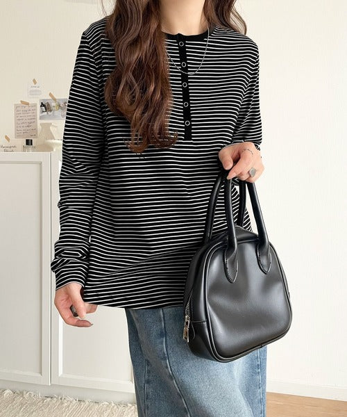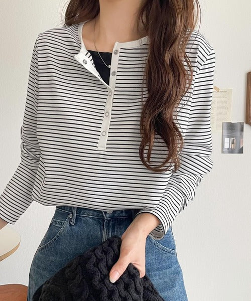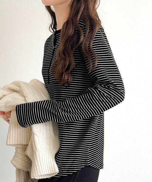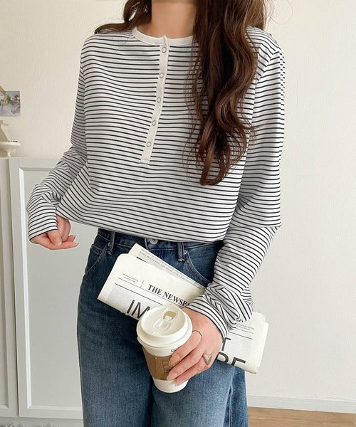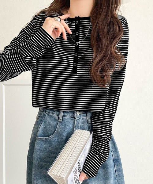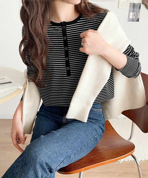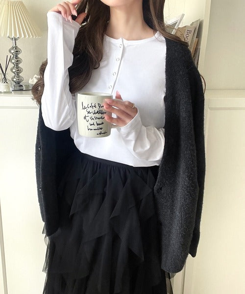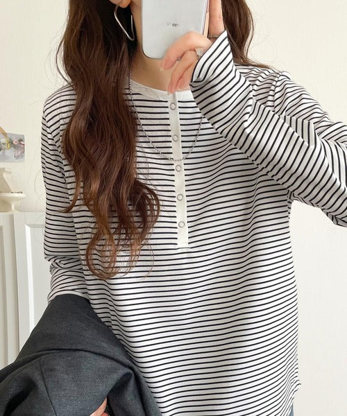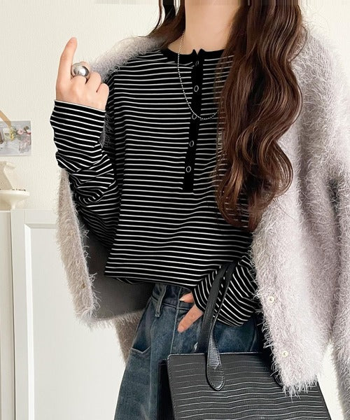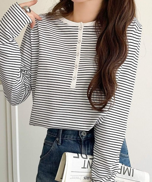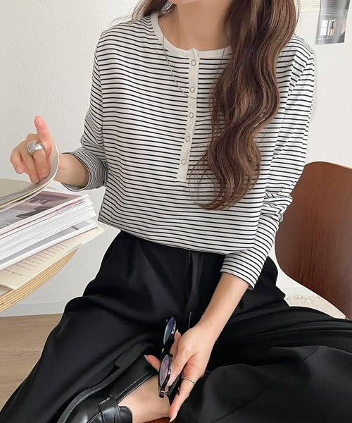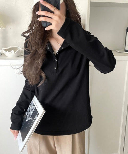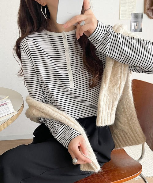 ドット釦がきらりと映える上品ロンT。