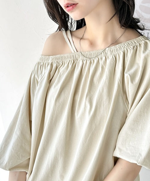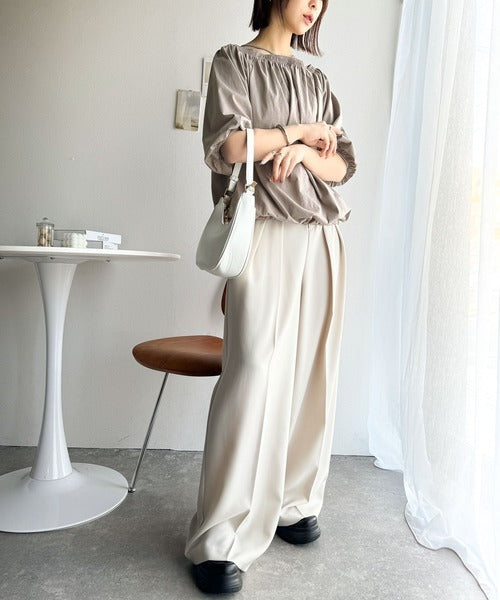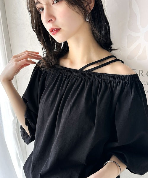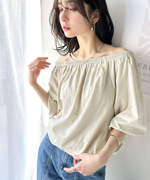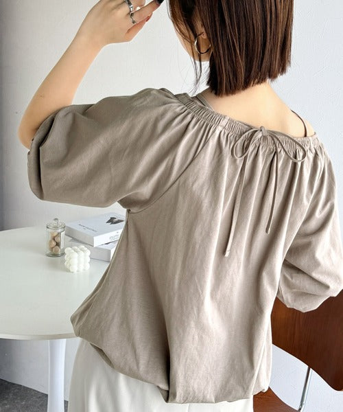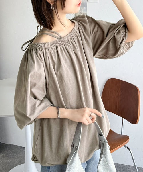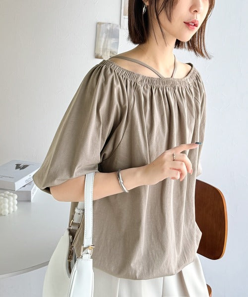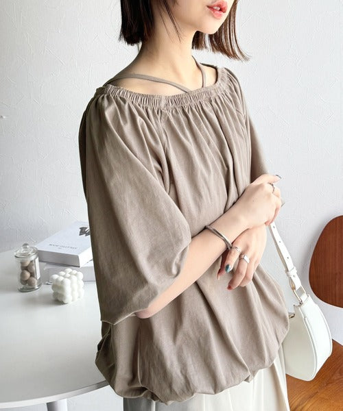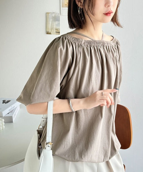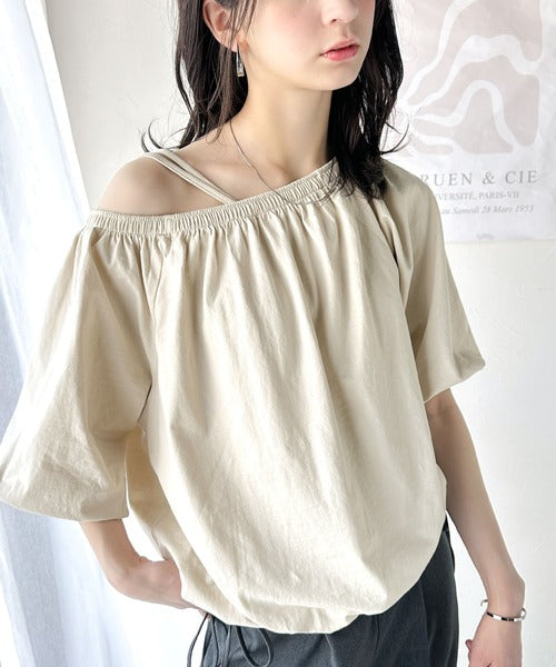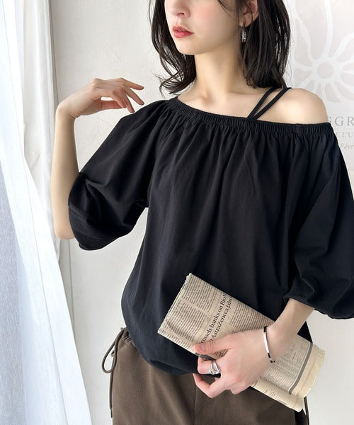 抜け感たっぷりの旬顔。マルチway綿100%シルケット加工ギャザー使いバルーンシルエットアシメブラウス(半袖) ce1260381