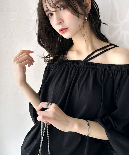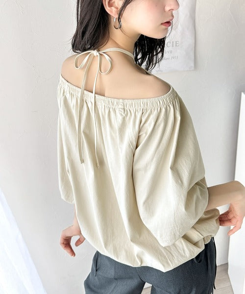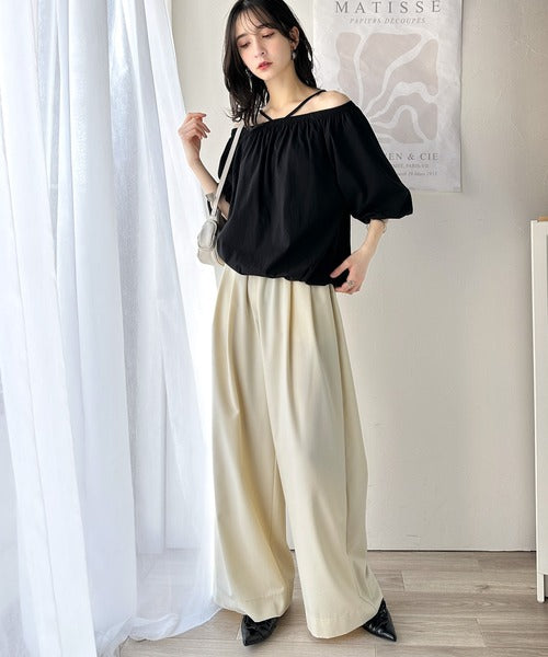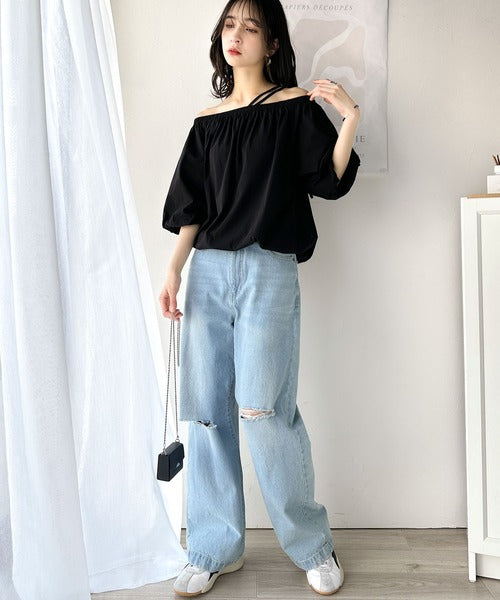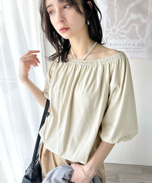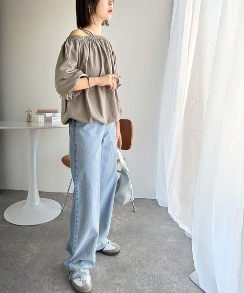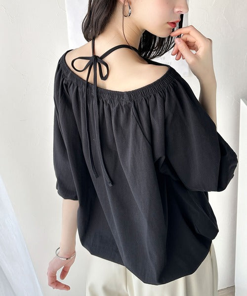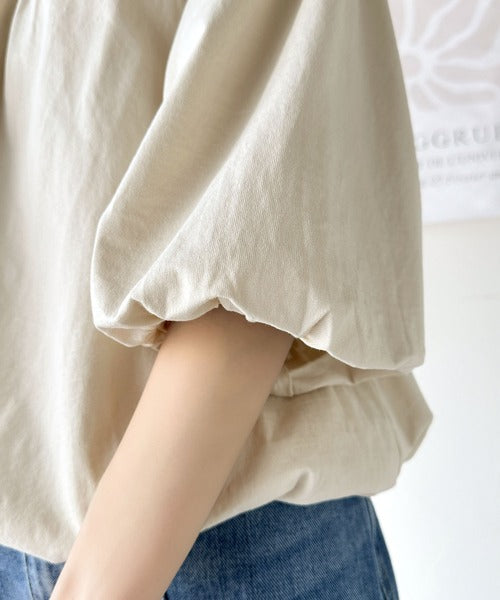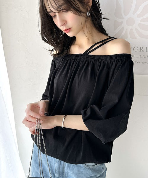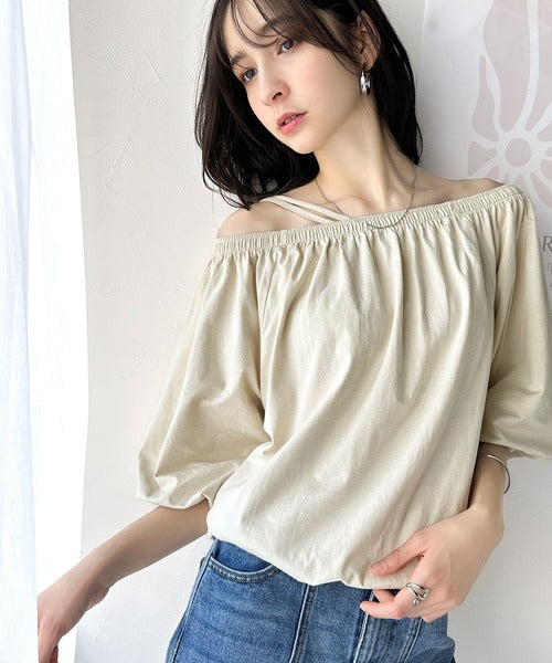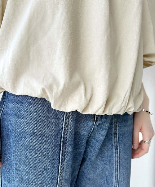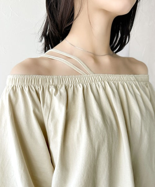 抜け感たっぷりの旬顔。マルチway綿100%シルケット加工ギャザー使いバルーンシルエットアシメブラウス(半袖) ce1260381