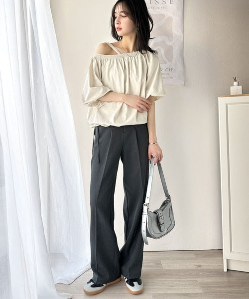 襟ぐりの広いデザインだから、肩を落としてオフショルダー風にもアレンジ可能。