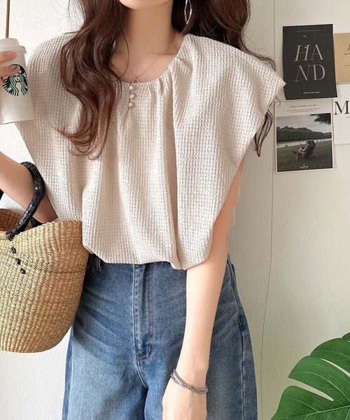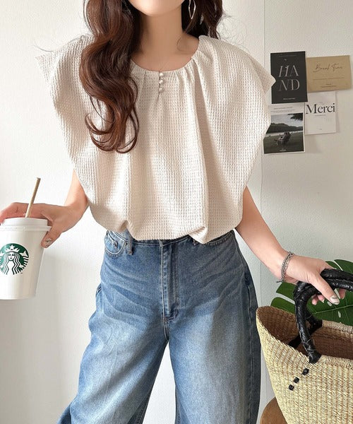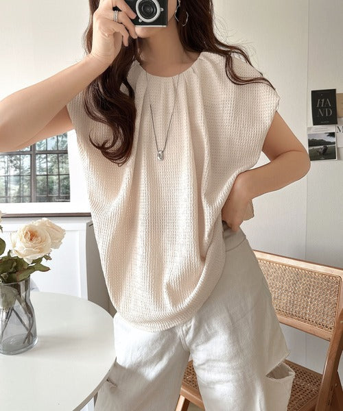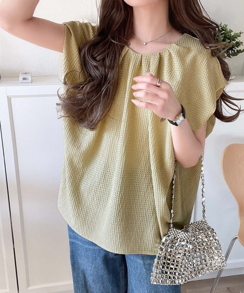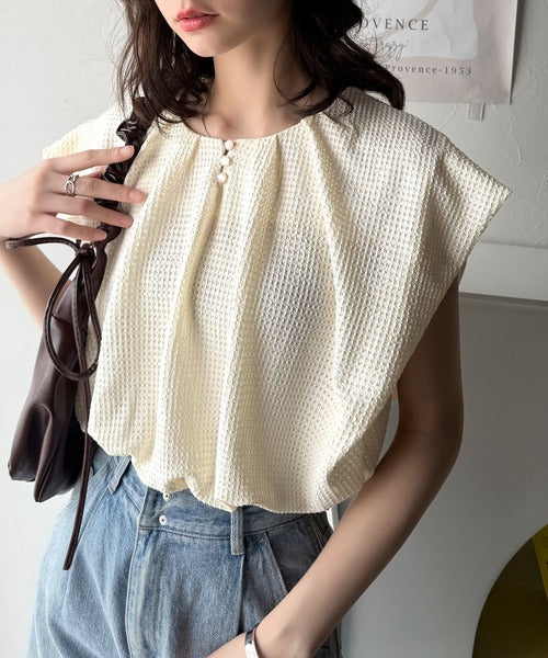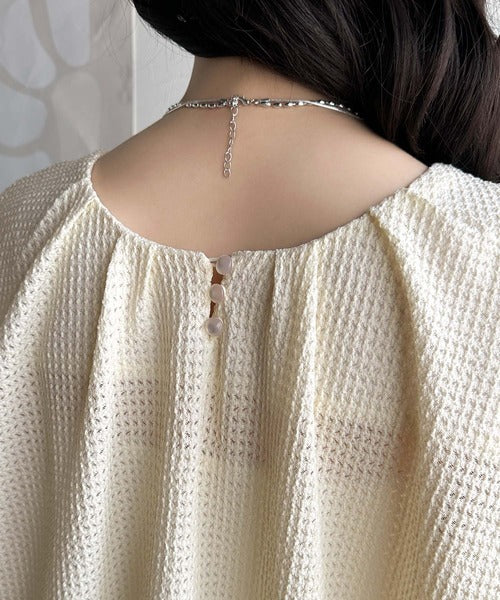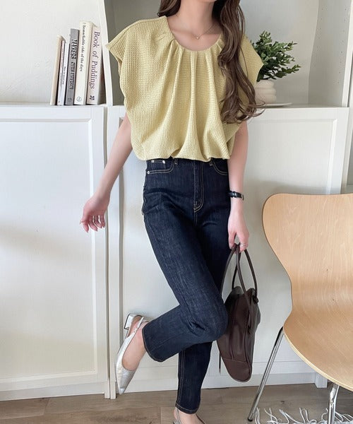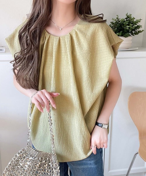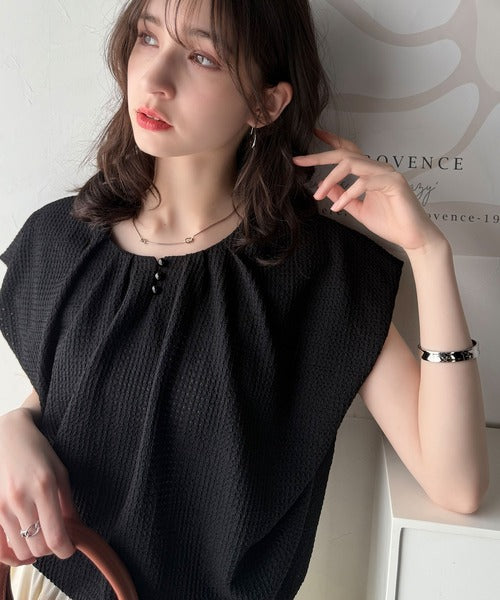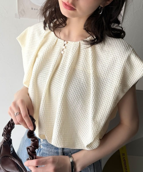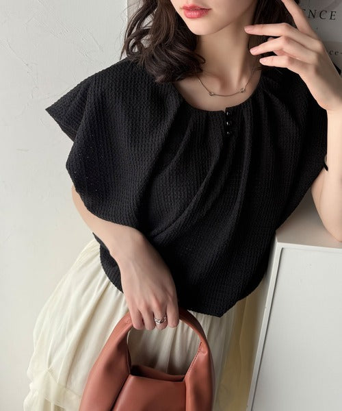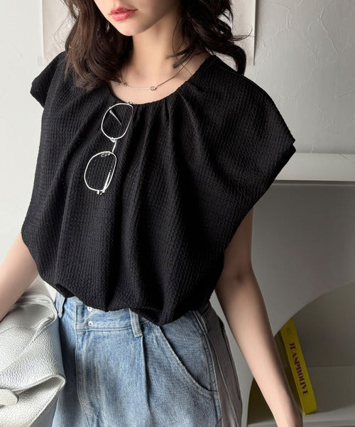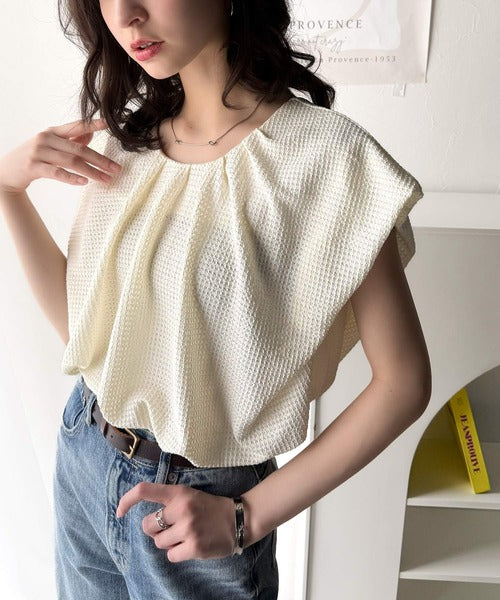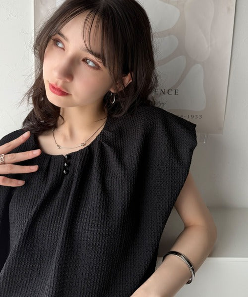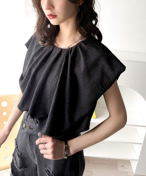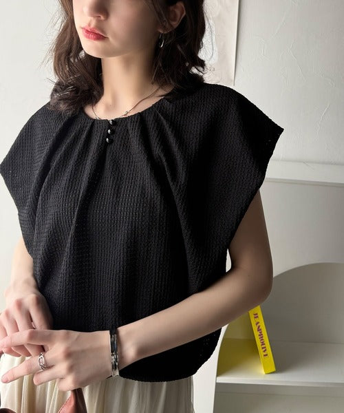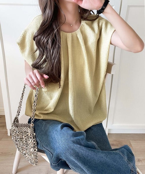 襟のタックデザインが立体感を生み出し、シンプルながらも動きが出るため、