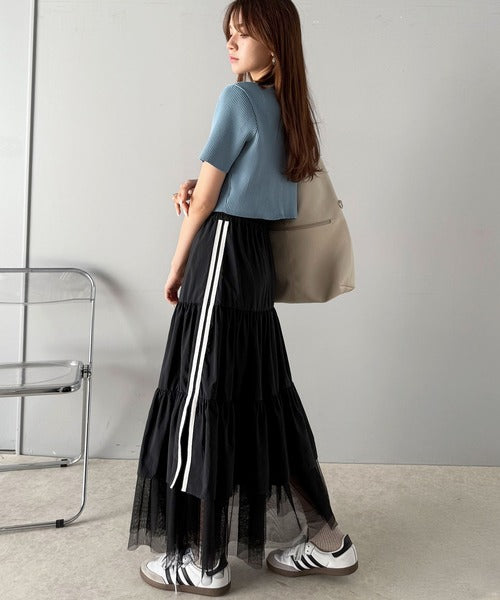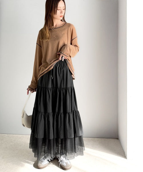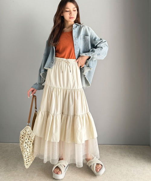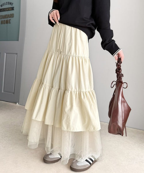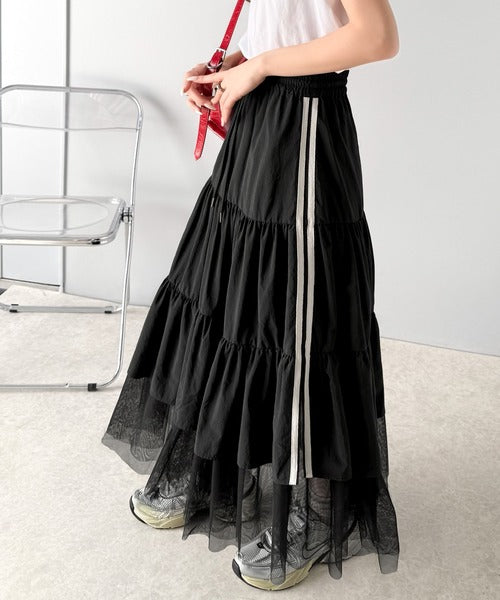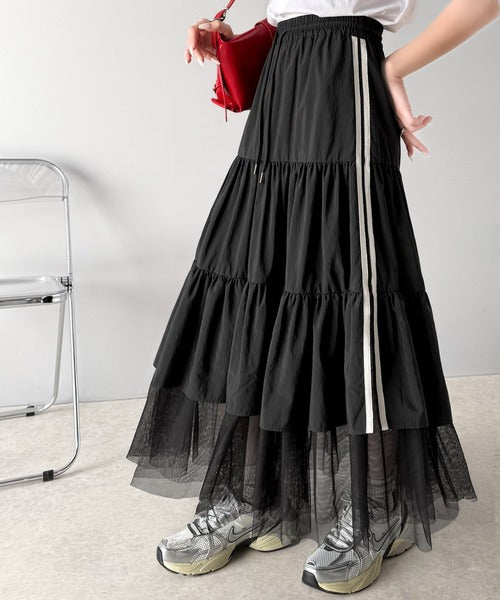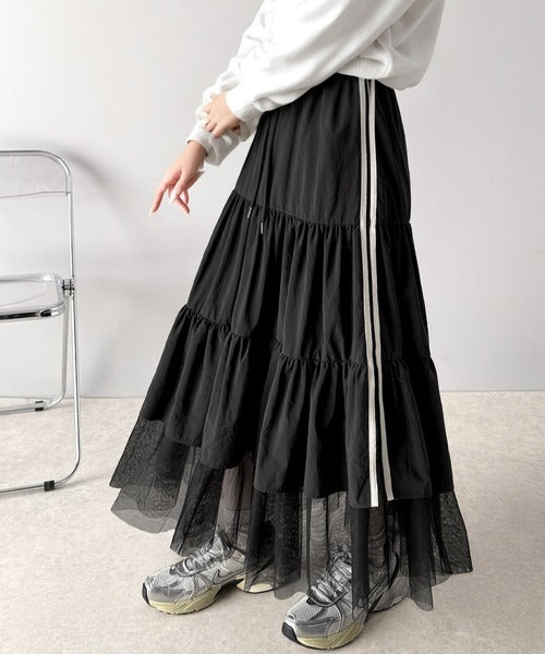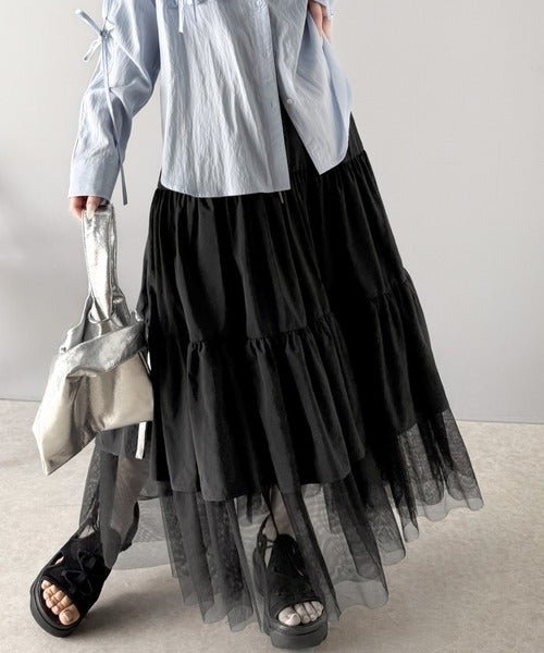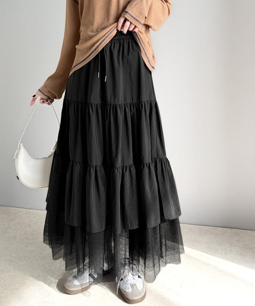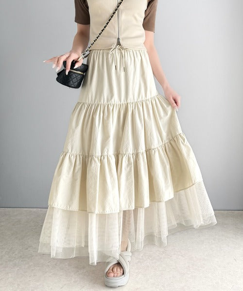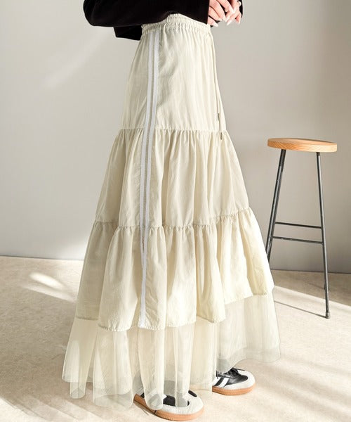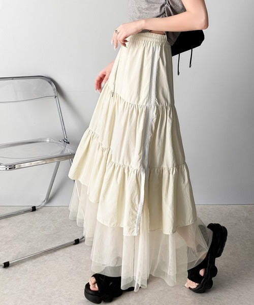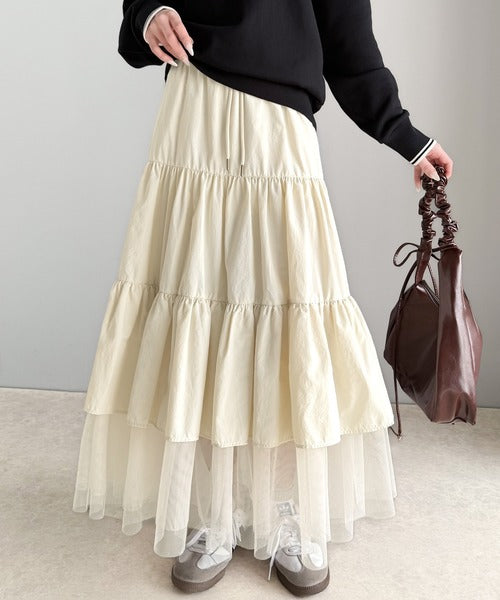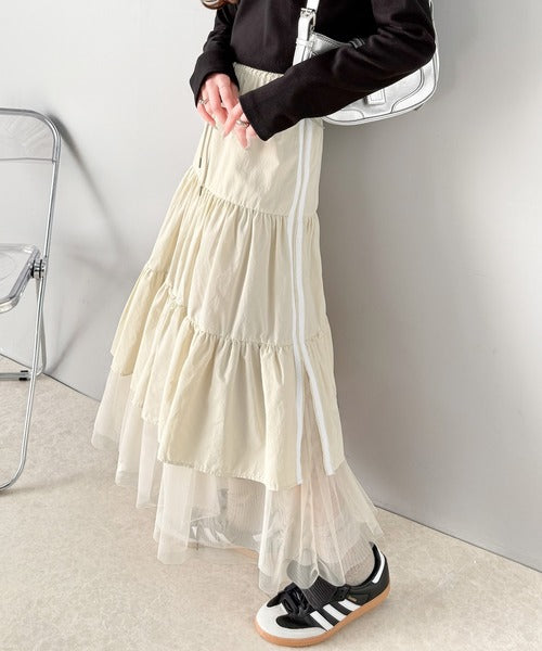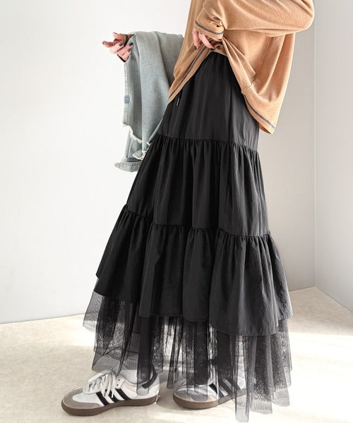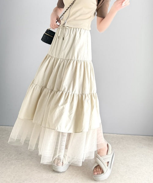 ナイロン生地に柔らかなチュールが組み合わさったティアードスカート。
