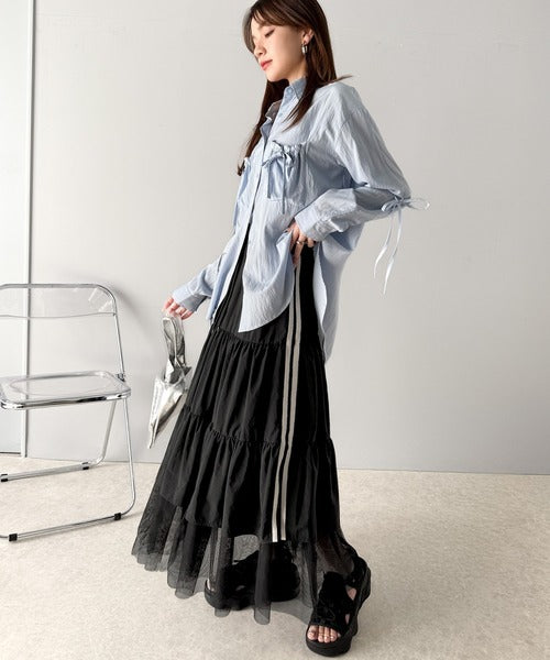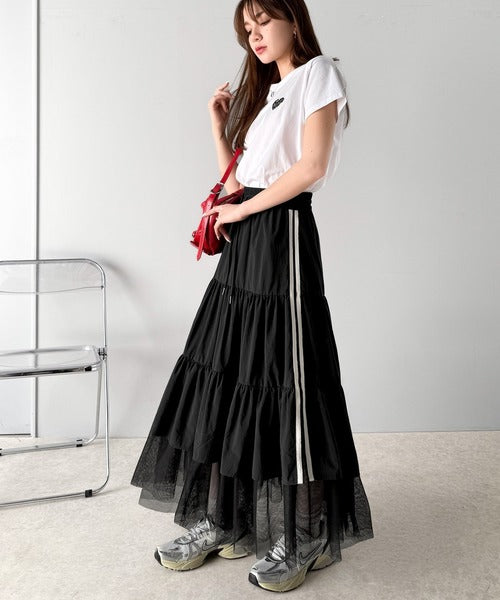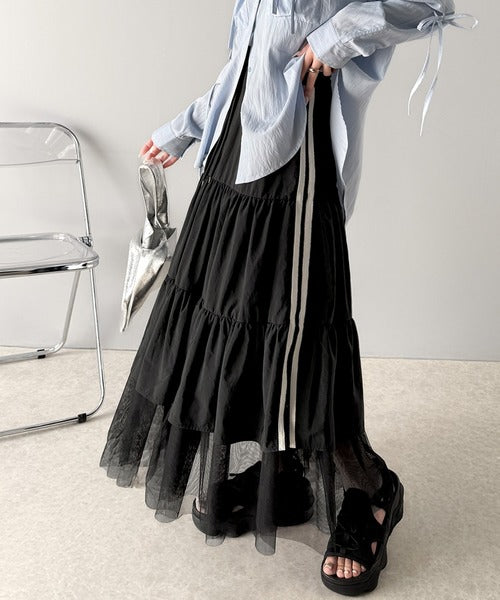 大人の愛されスカート。ナイロンチュールティアード ロングスカート (サイドラインあり・なしの2タイプ) ce1260351