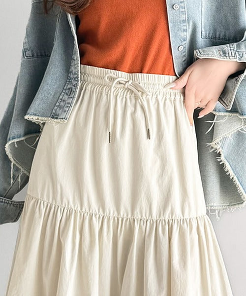 ふわっと揺れるティアードスカートで、上品なカジュアルスタイルを楽しんで♪
