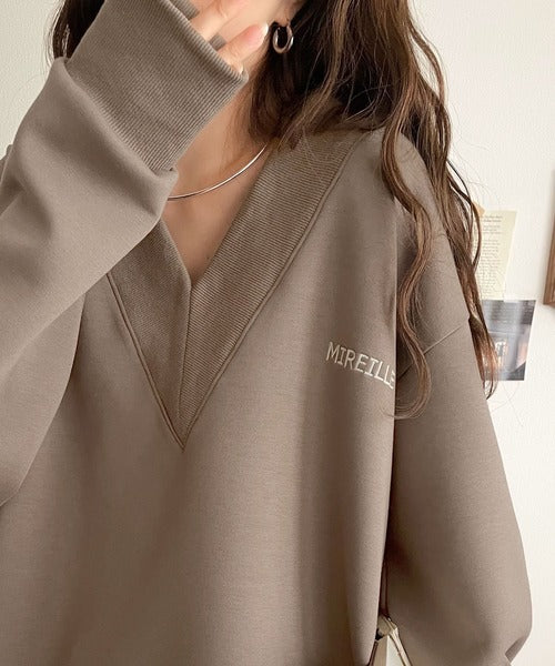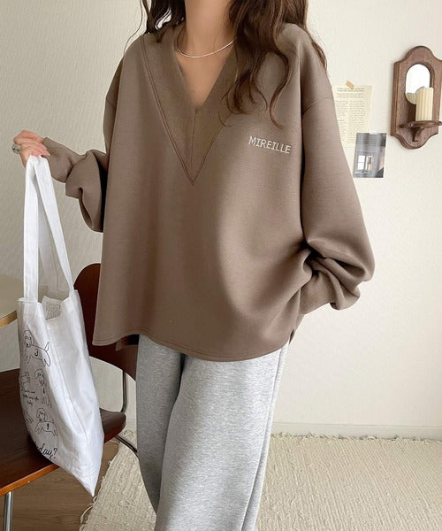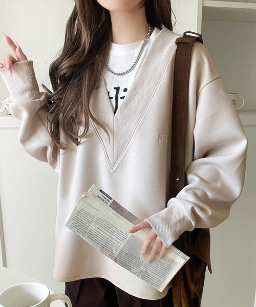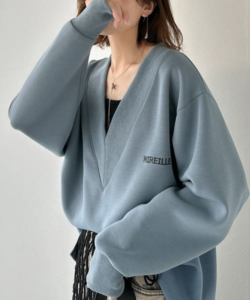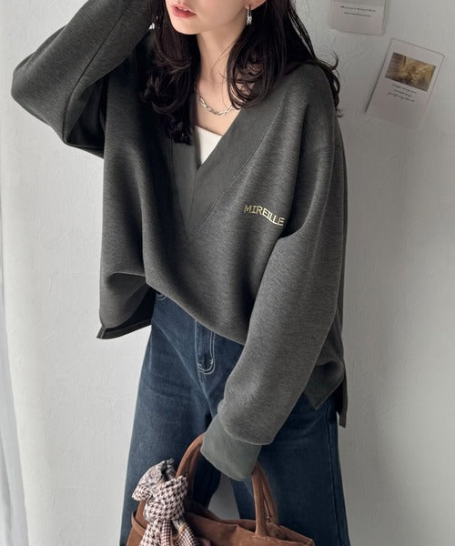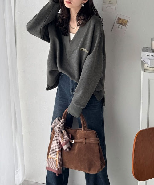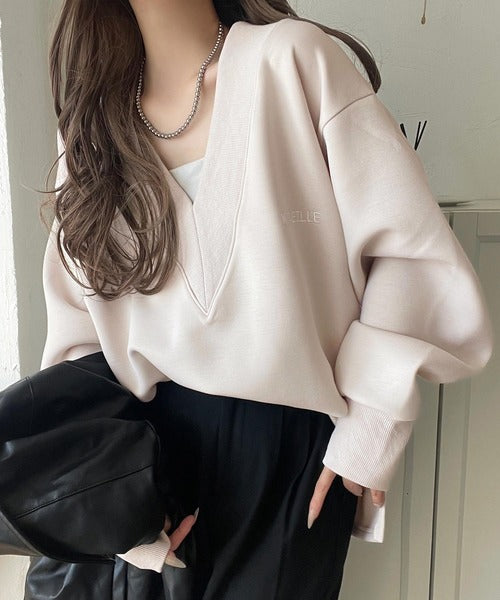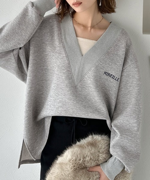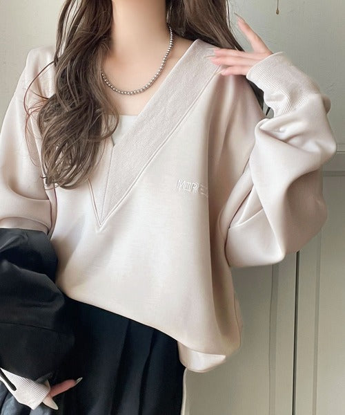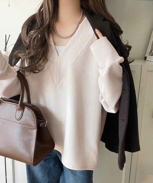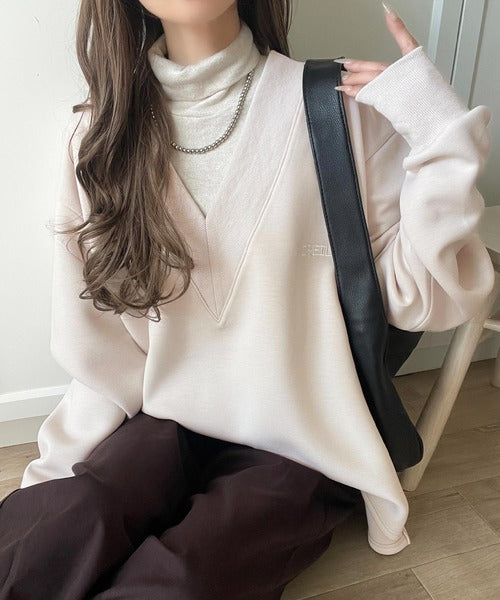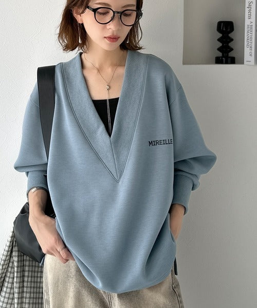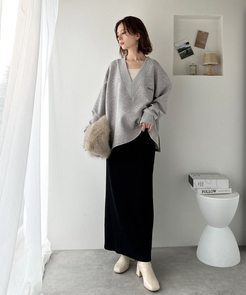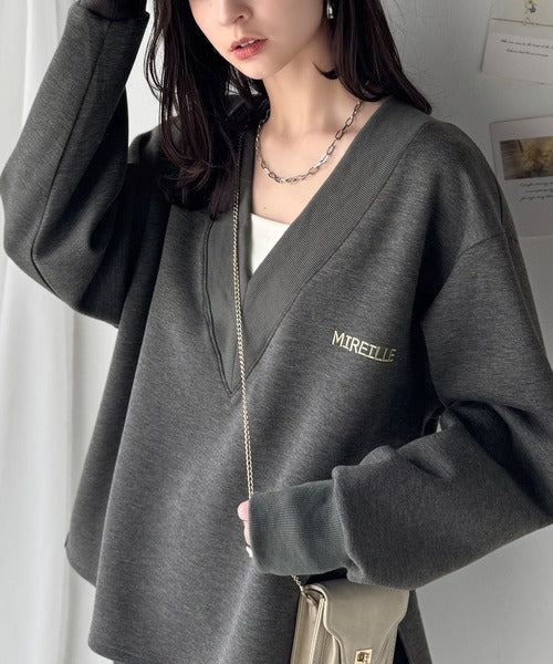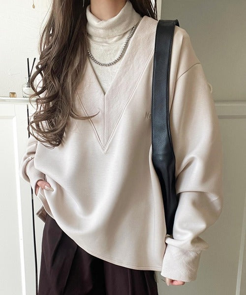 リブ切替を効かせた太めのVネックラインが小顔効果を与えつつ、大人っぽい雰囲気を演出。