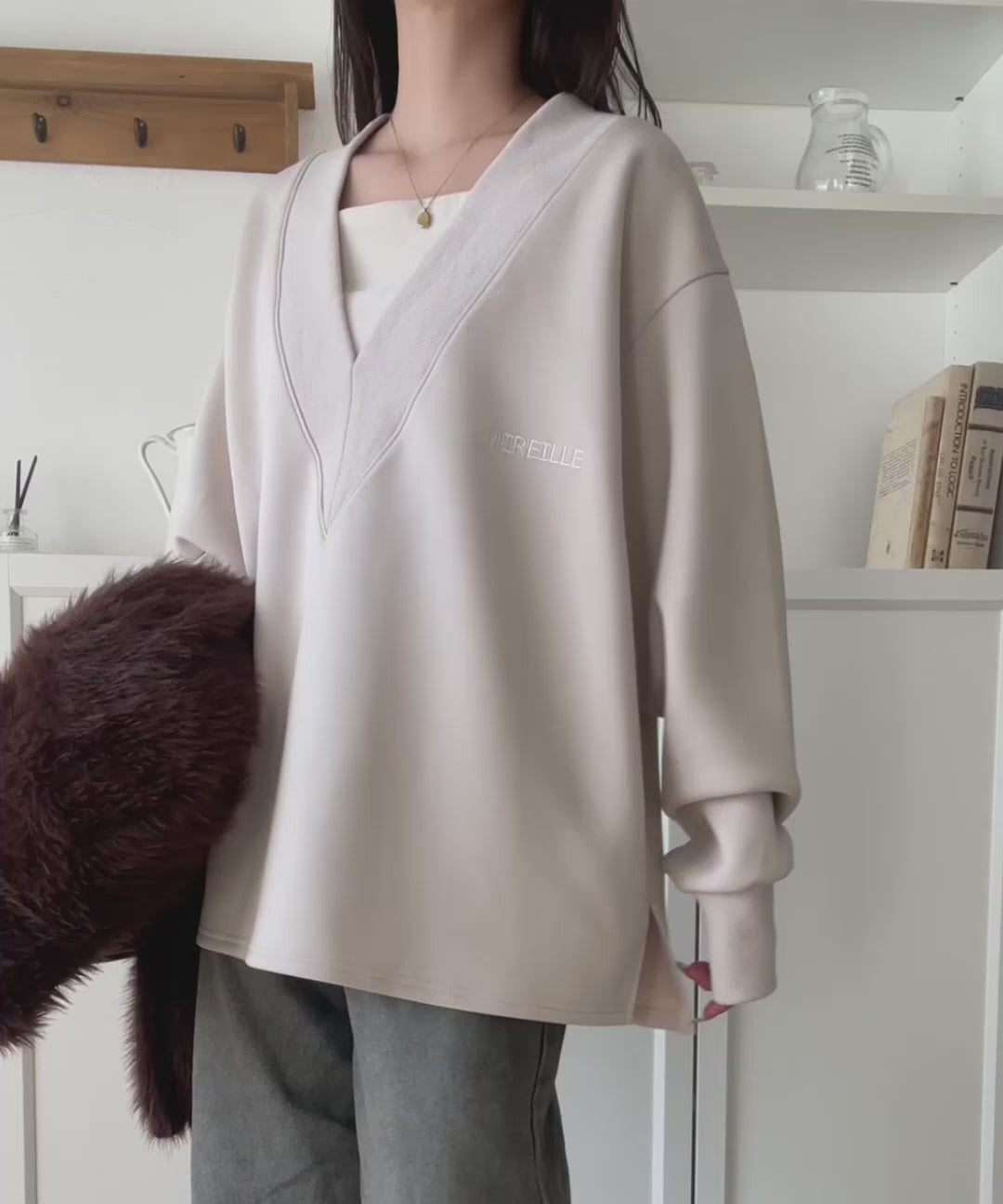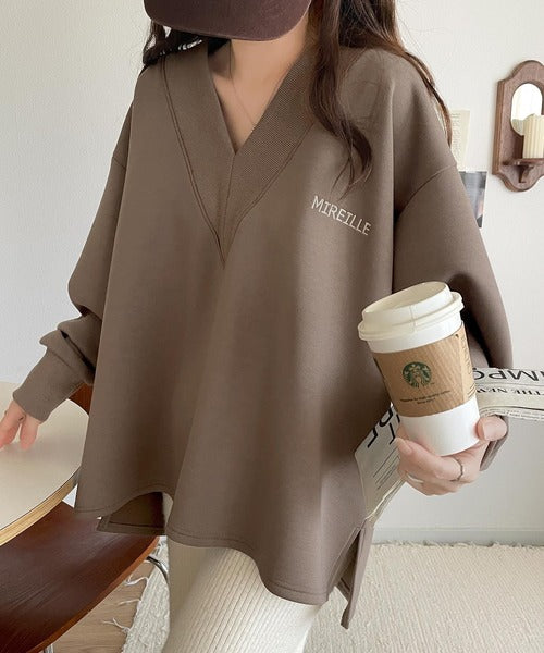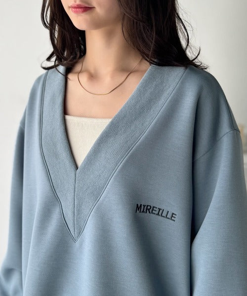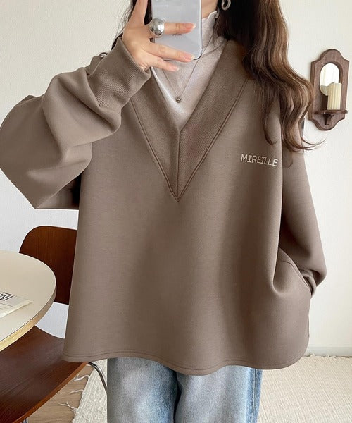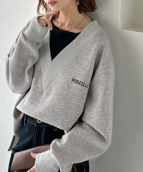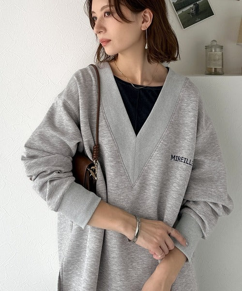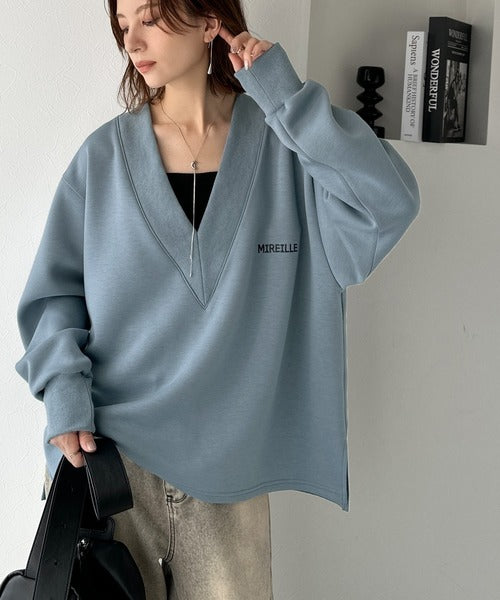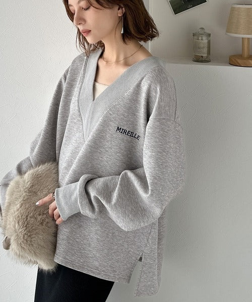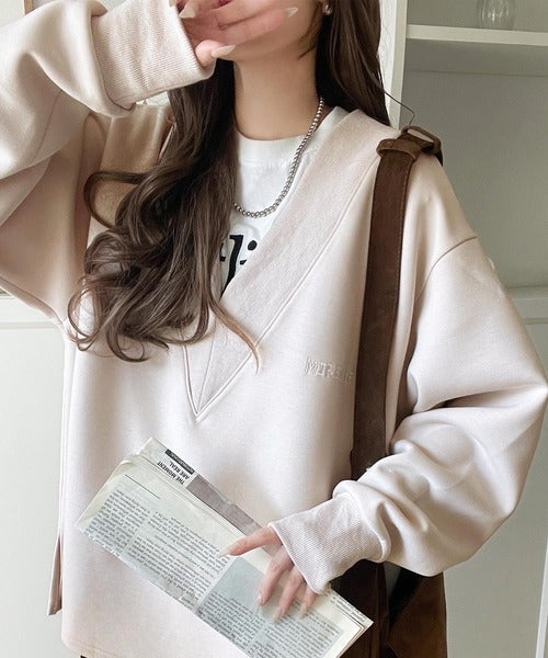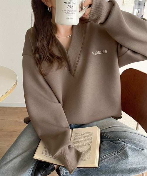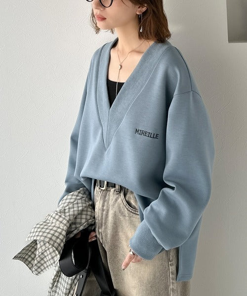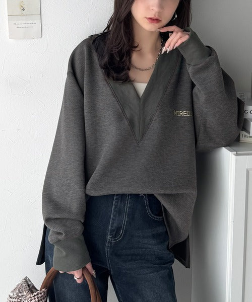 リブ切替を効かせた太めのVネックラインが小顔効果を与えつつ、大人っぽい雰囲気を演出。