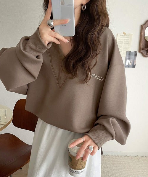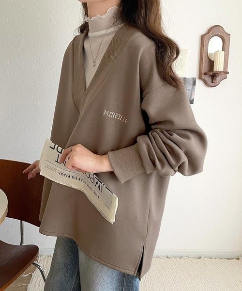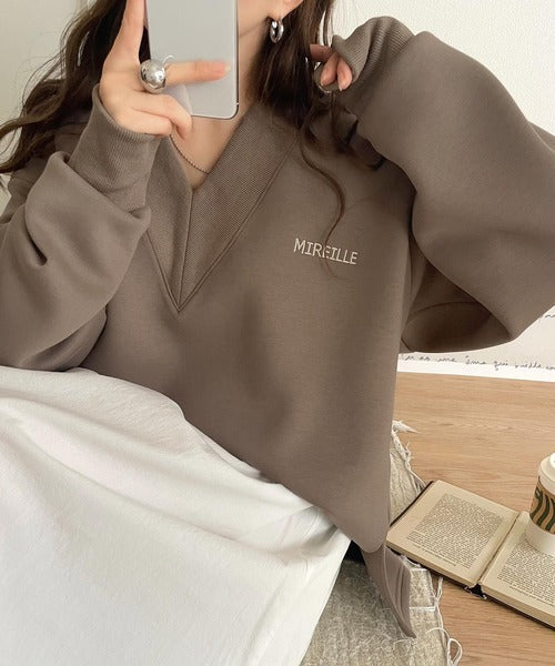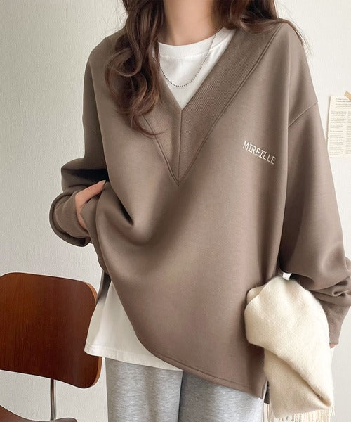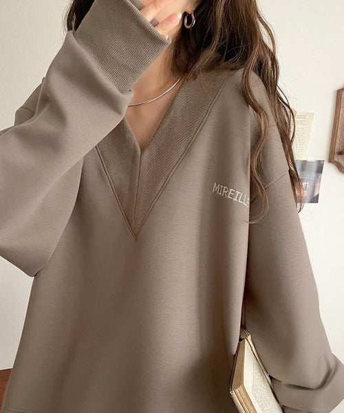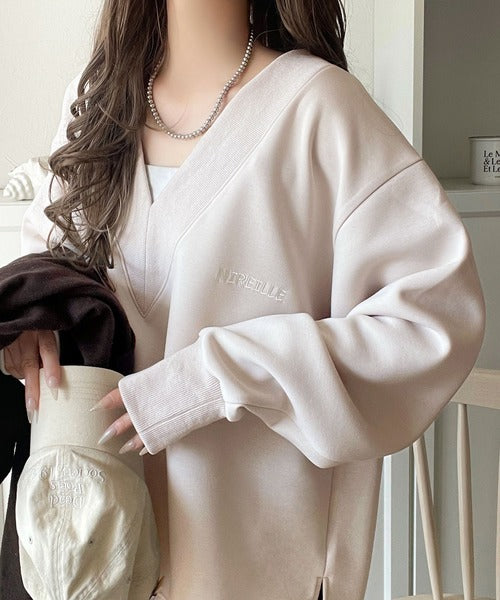 抜け感と上品さを両立。深めのネックで小顔見え♪ 胸刺繍Vネックダンボールニットトップス(長袖) ce1110130