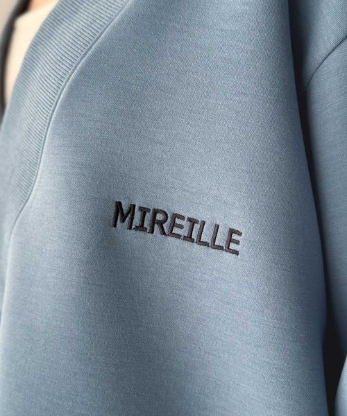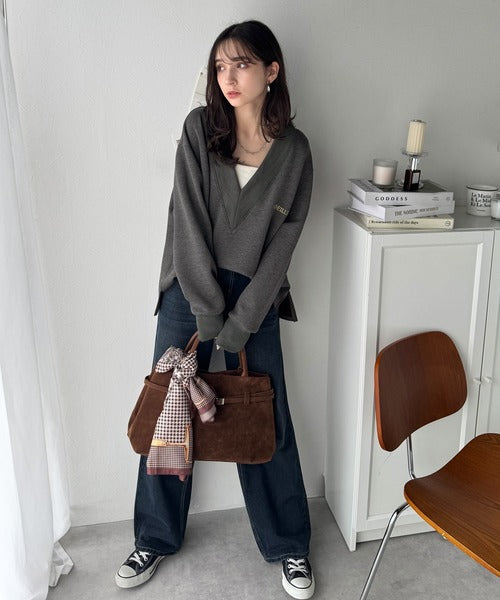 抜け感と品を両立する 胸刺繍Vネックダンボールニットトップス。