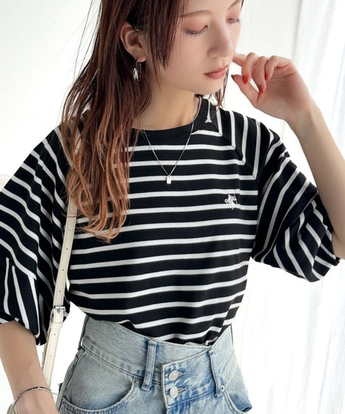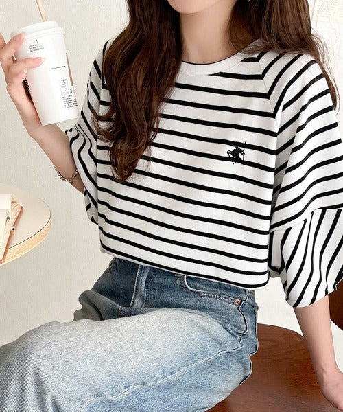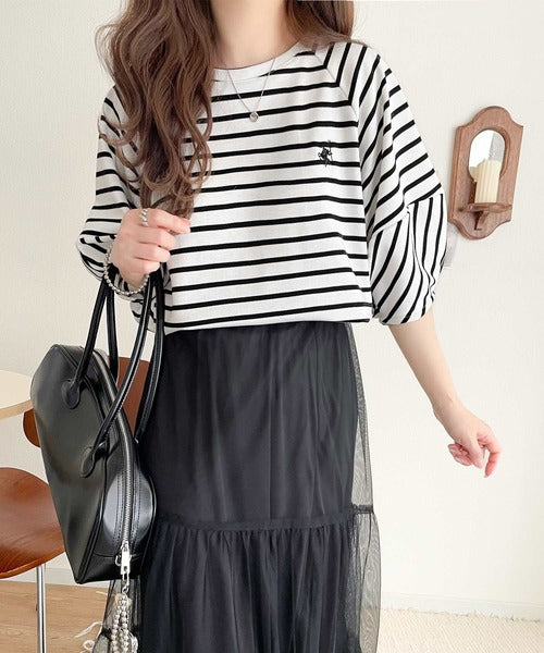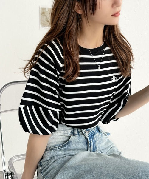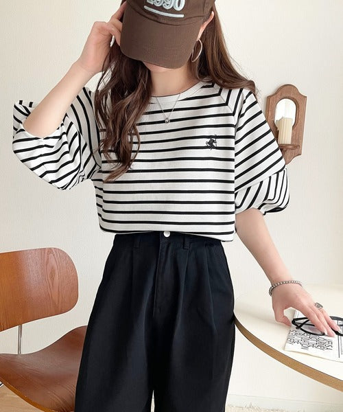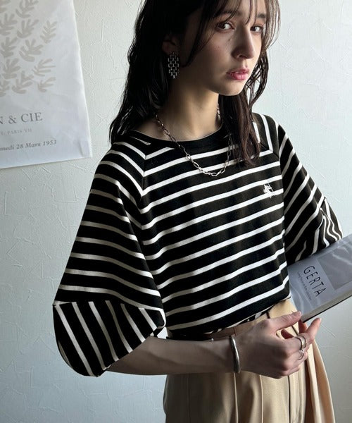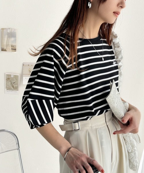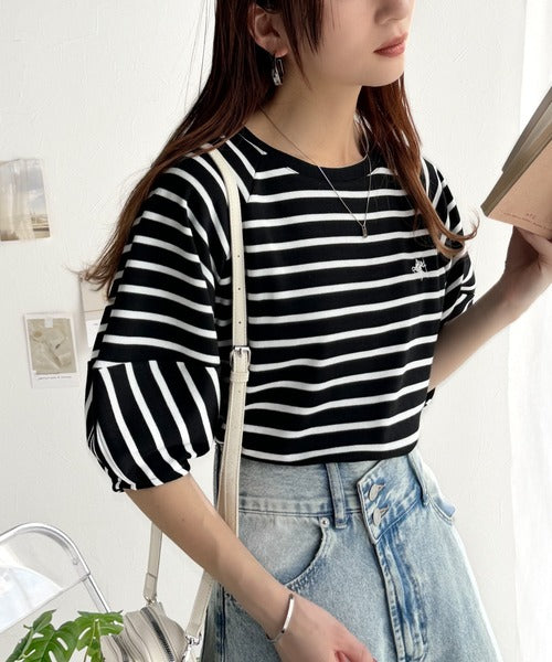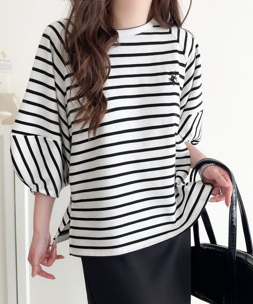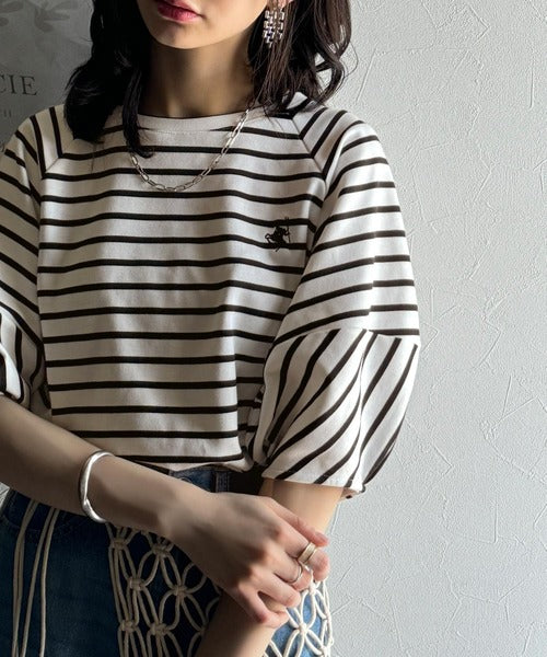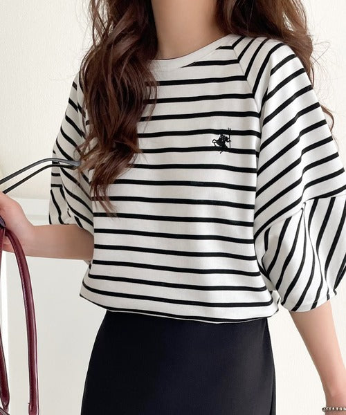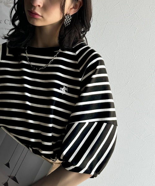 大人の上品シンプル。ワンポイント刺繍ランタンスリーブボーダートップス ce1330024