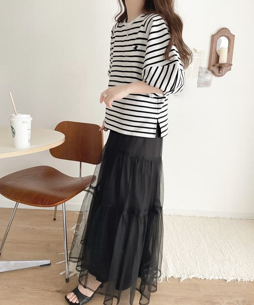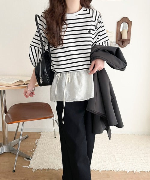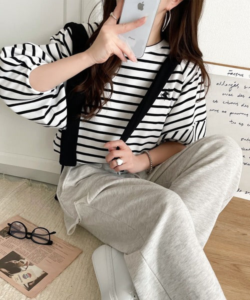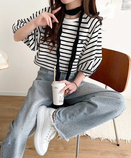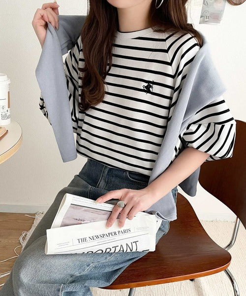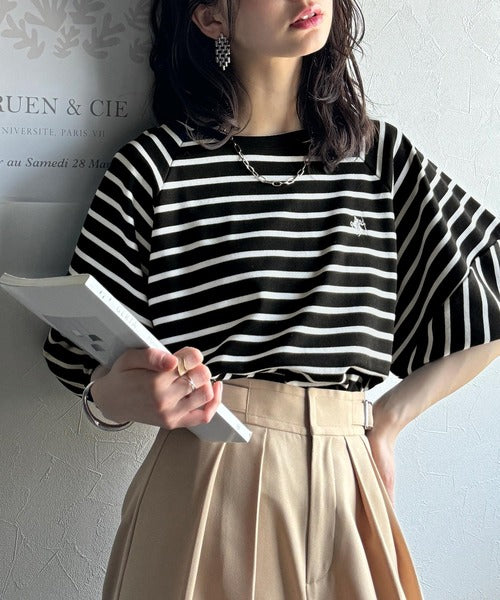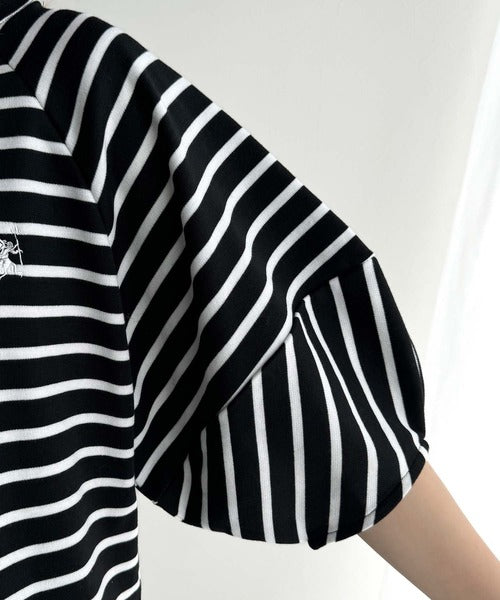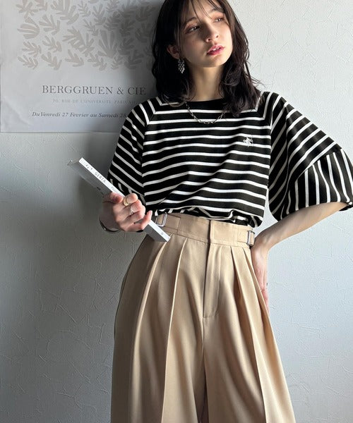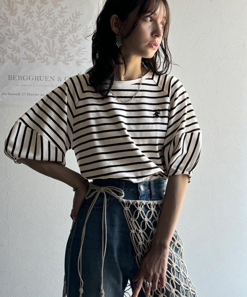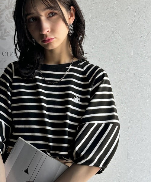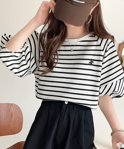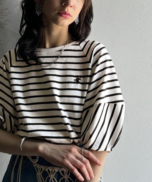 大人の上品シンプル。ワンポイント刺繍ランタンスリーブボーダートップス ce1330024