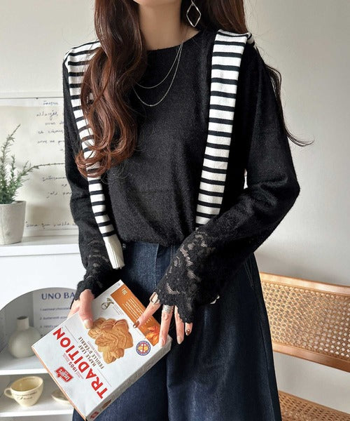 袖口に繊細な花柄レースをスカラップ仕立てであしらい、手元を華やかに彩るニットソー。