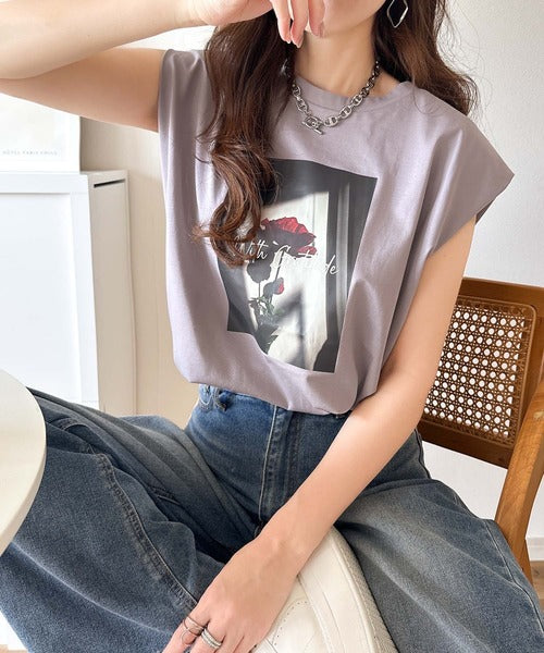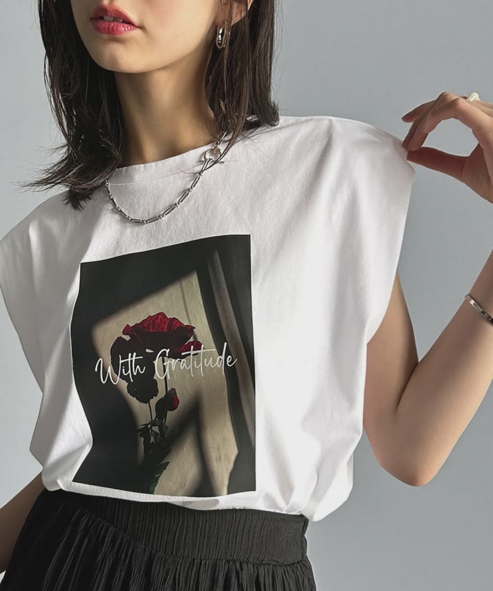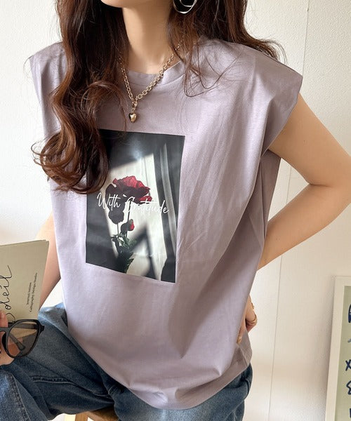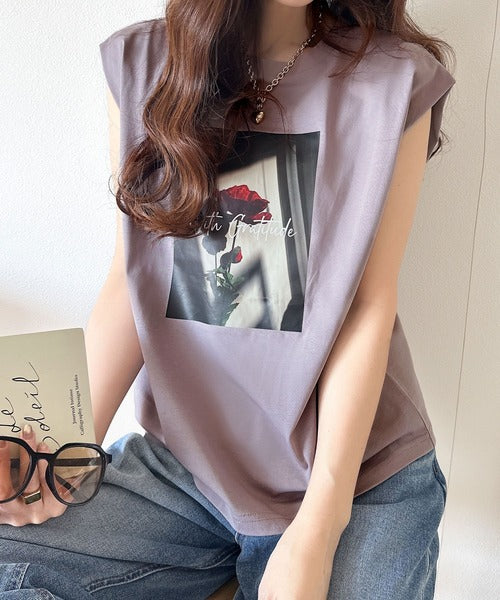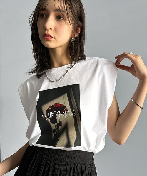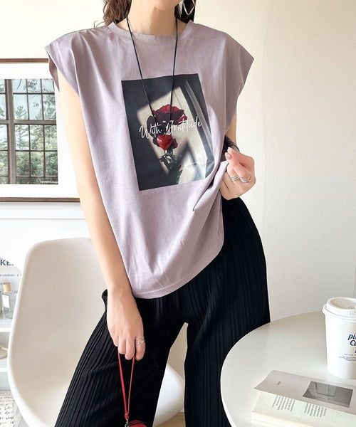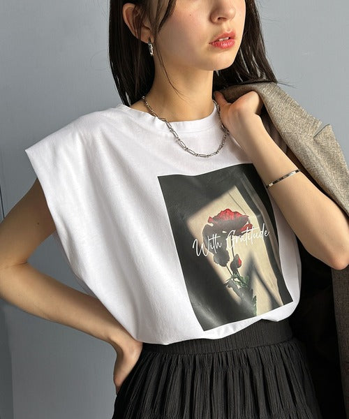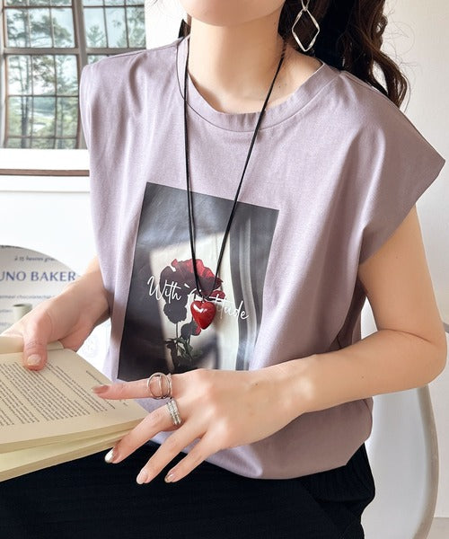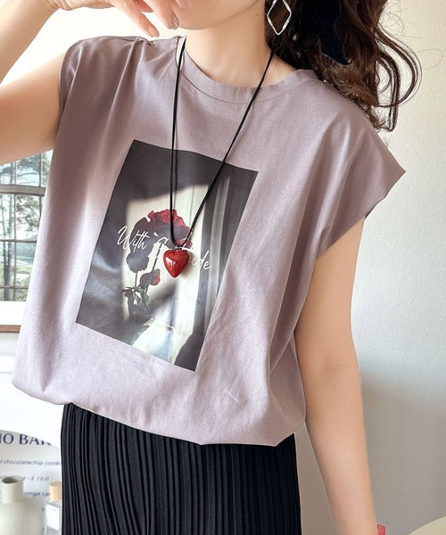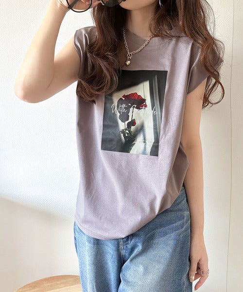 シンプルなのに着映える!お花フォトプリントシルケット加工フレンチスリーブTシャツ ce1020197