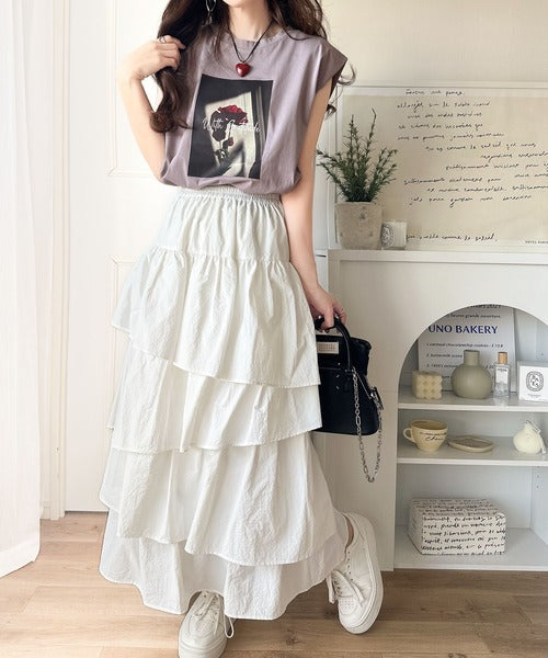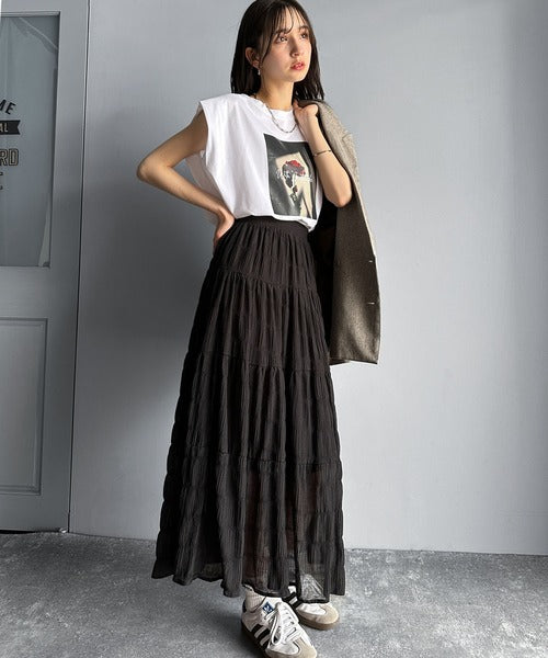 少しきれいめなスタイルを目指すなら、シアースカートやスラックスと合わせてみても◎