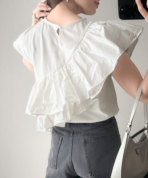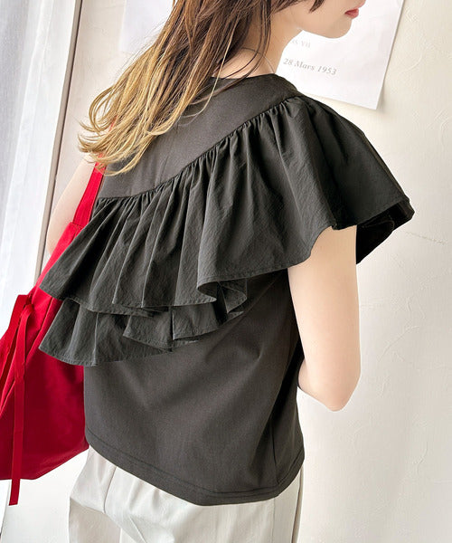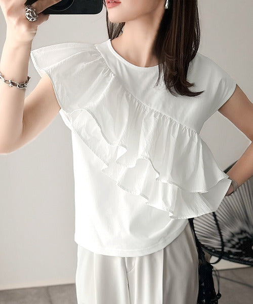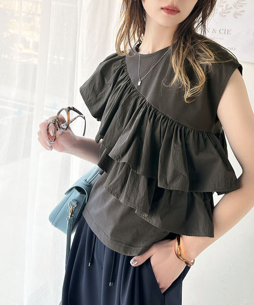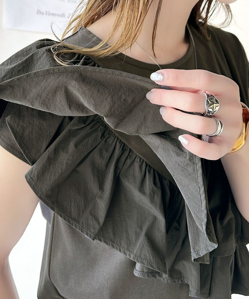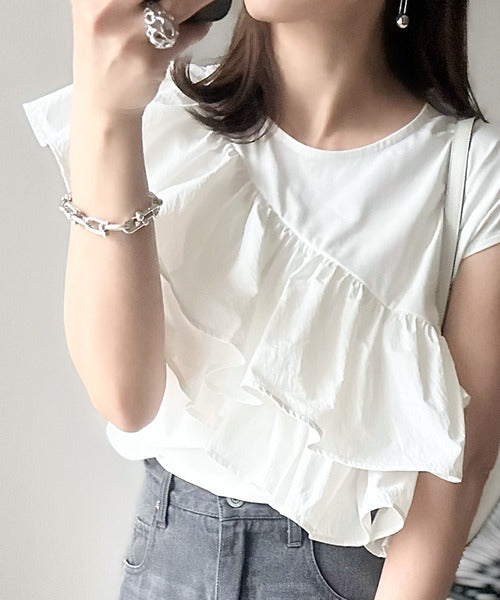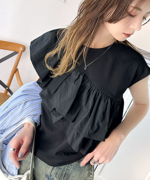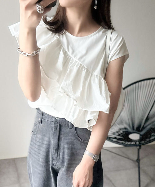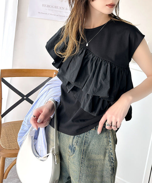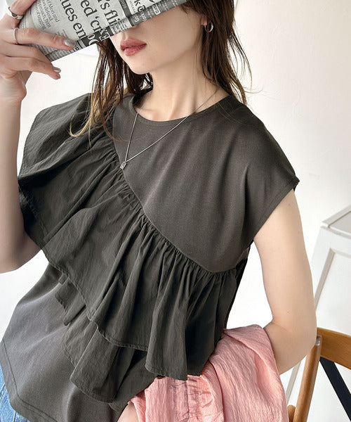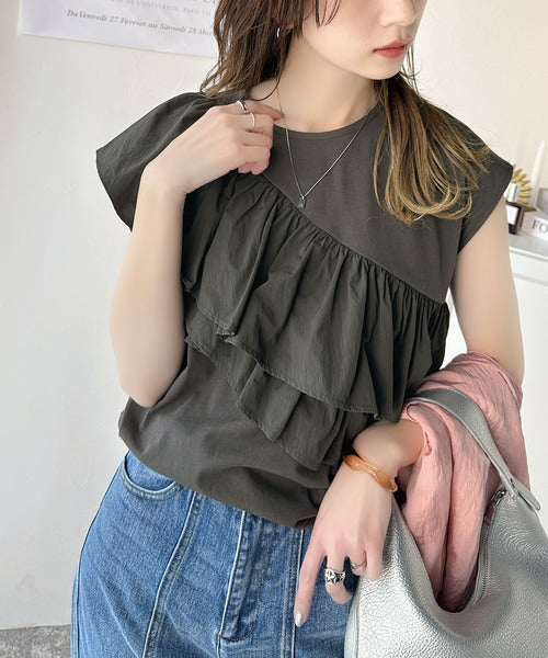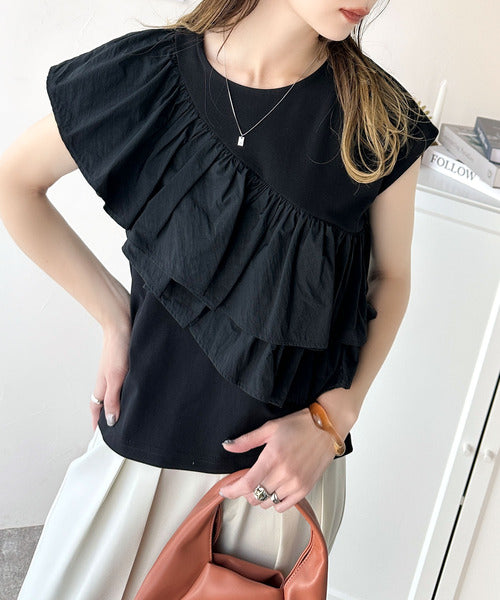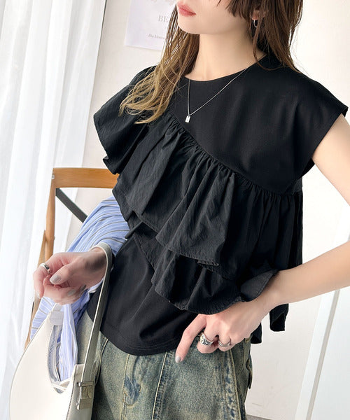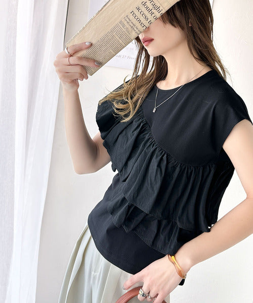 一枚で着映える♪異素材ドッキングアシメトリーラッフルデザインフレンチスリーブカットソー ce1020216