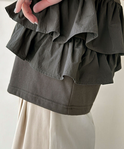 肌ざわりの良いカットソー生地に異素材のラッフルが