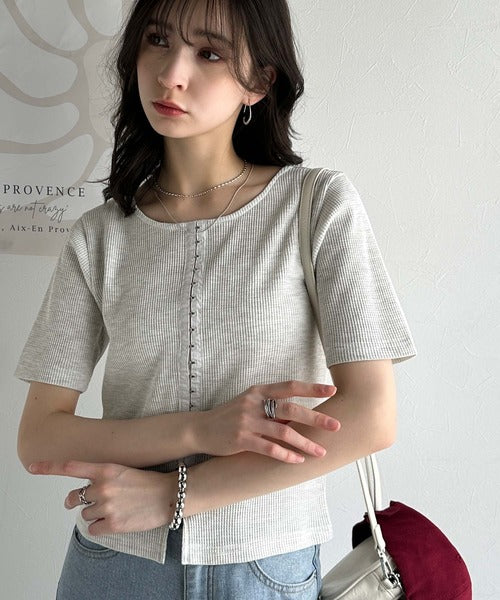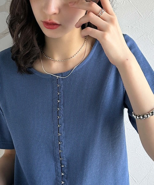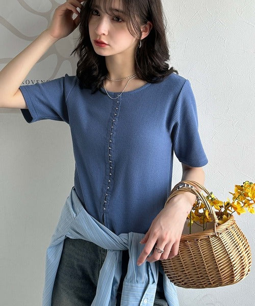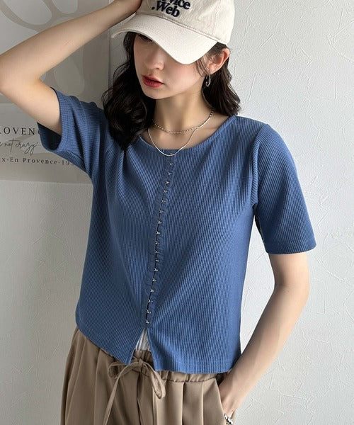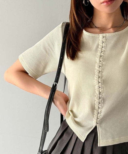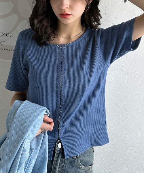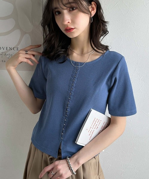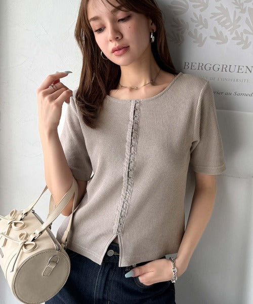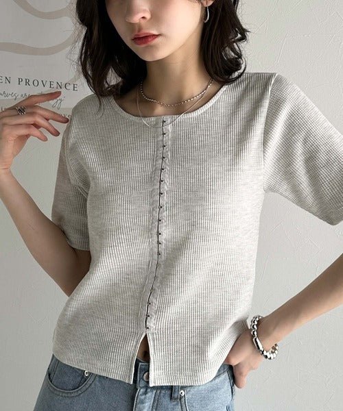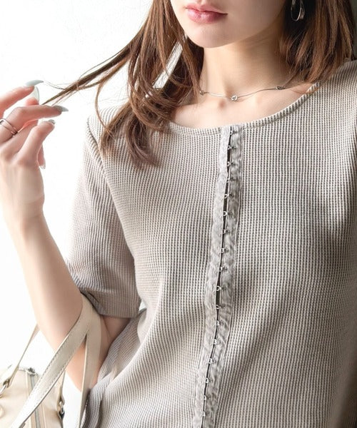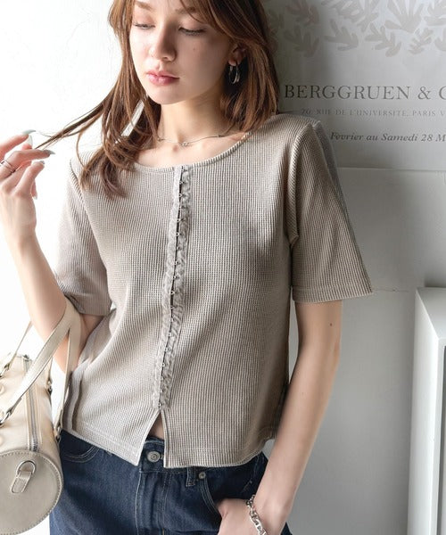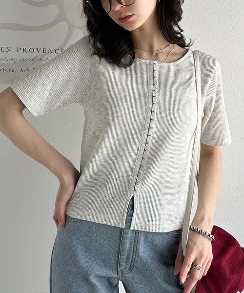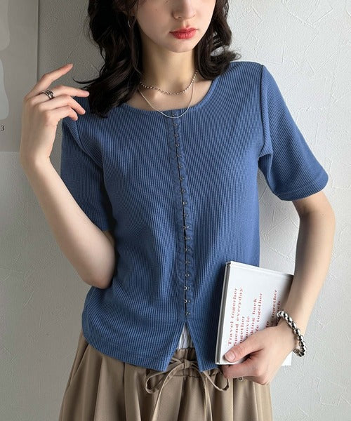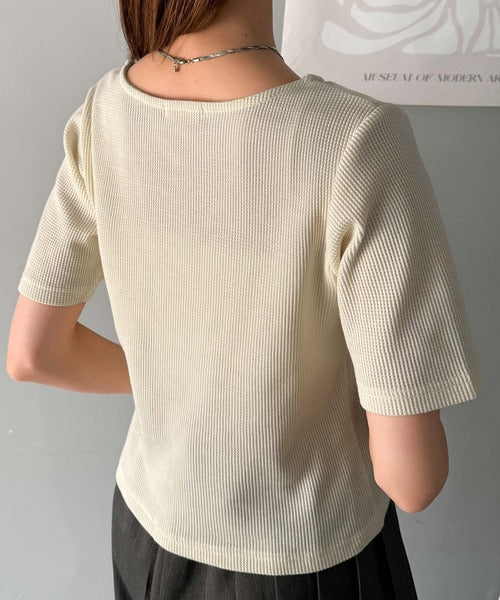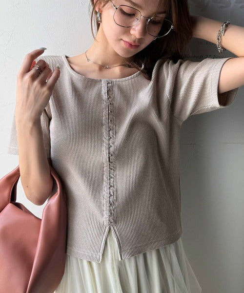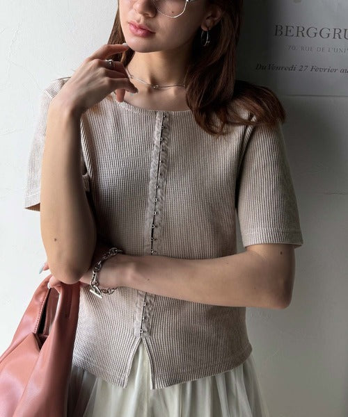 大人可愛いデコルテ魅せコンパクトT。フロントホックワッフル半袖トップス ce1020238