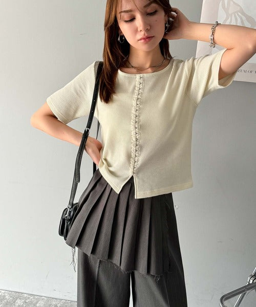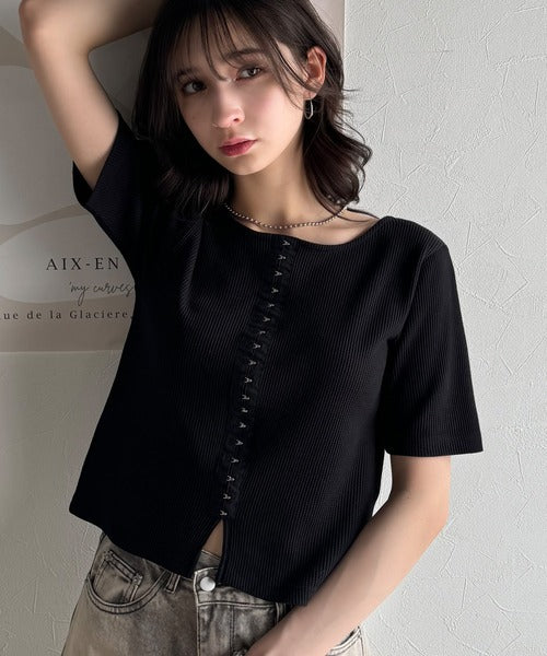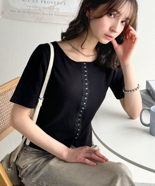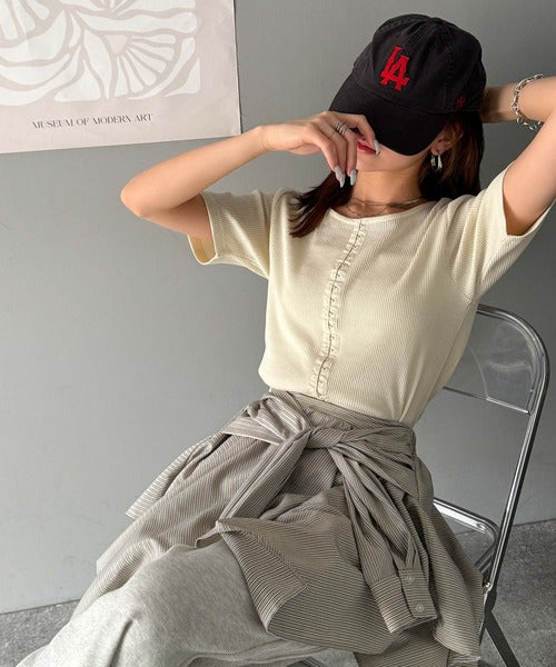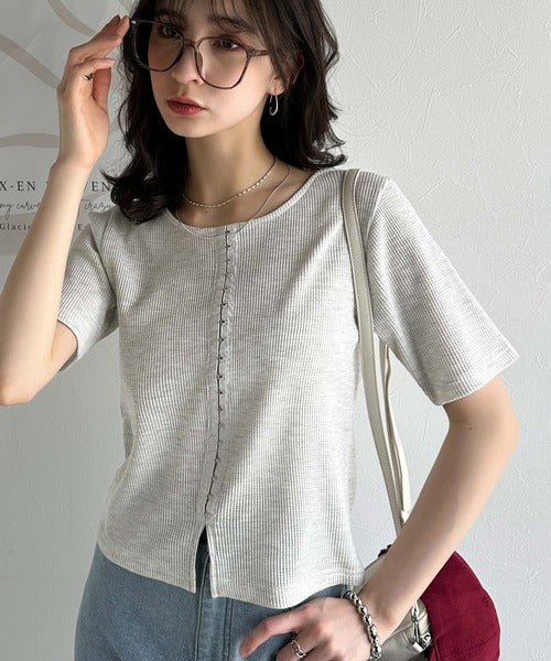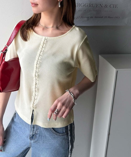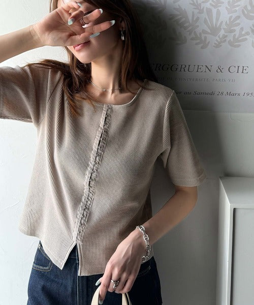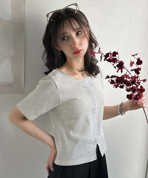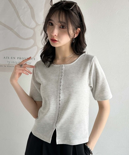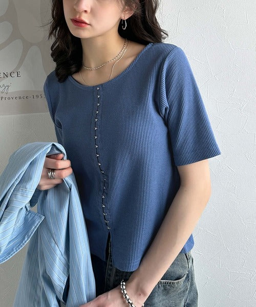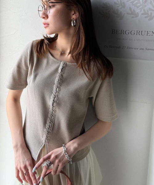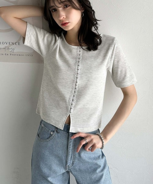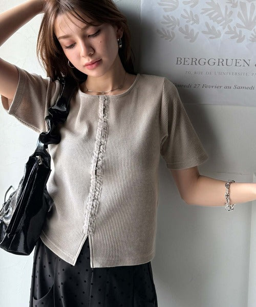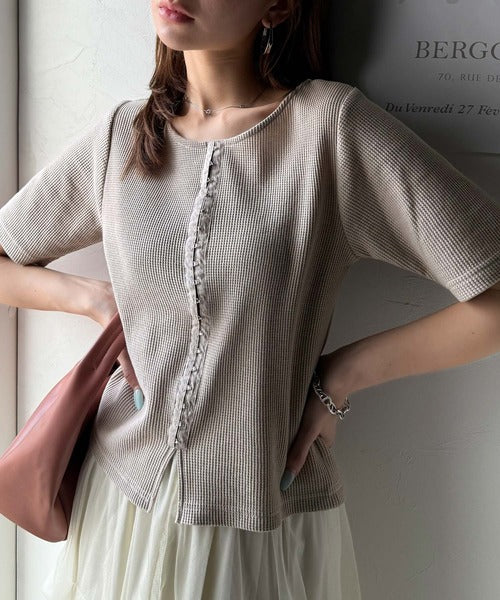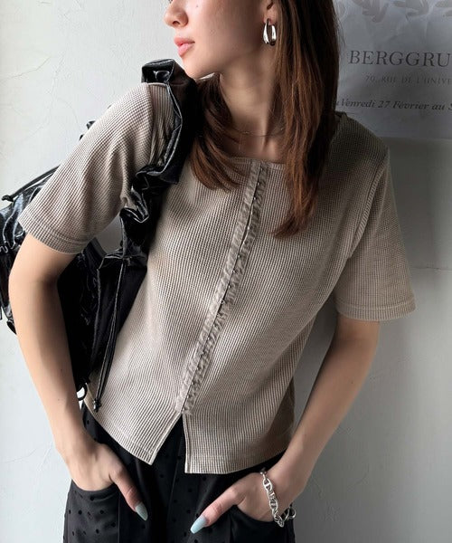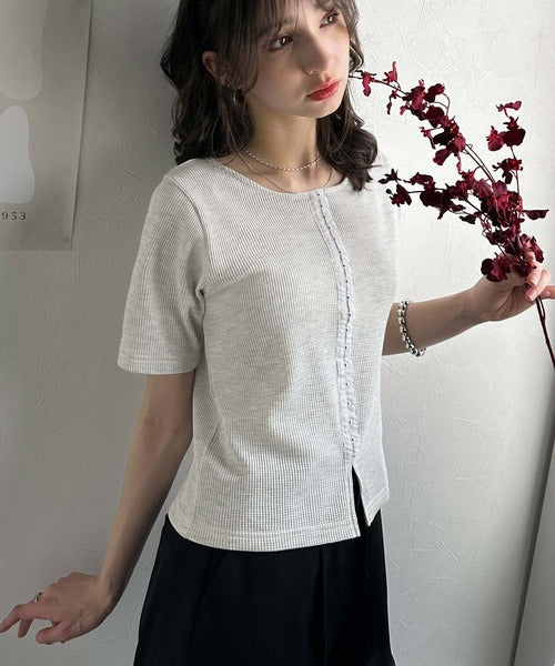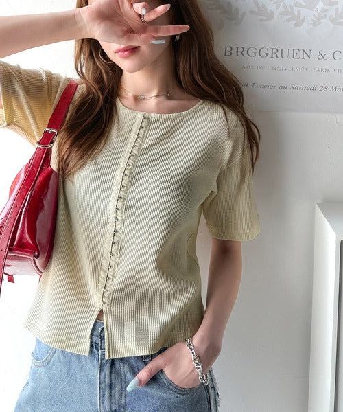 大人可愛いデコルテ魅せコンパクトT。フロントホックワッフル半袖トップス ce1020238
