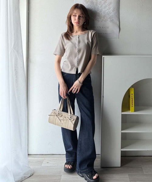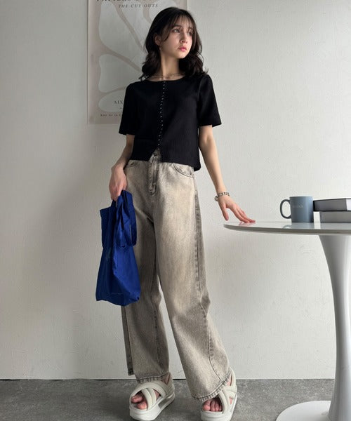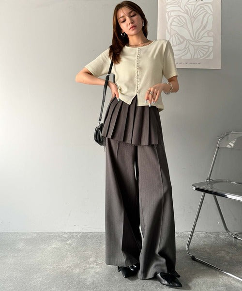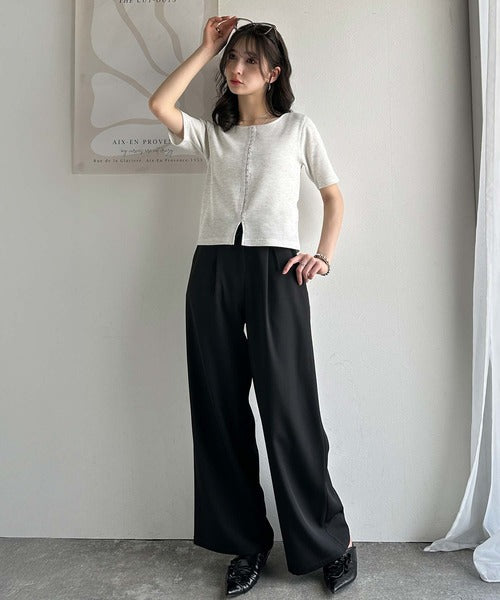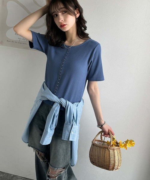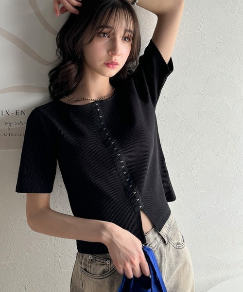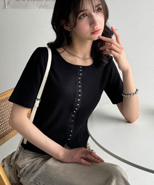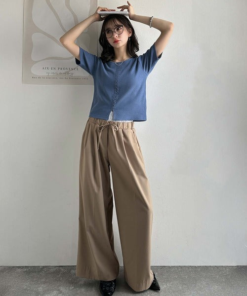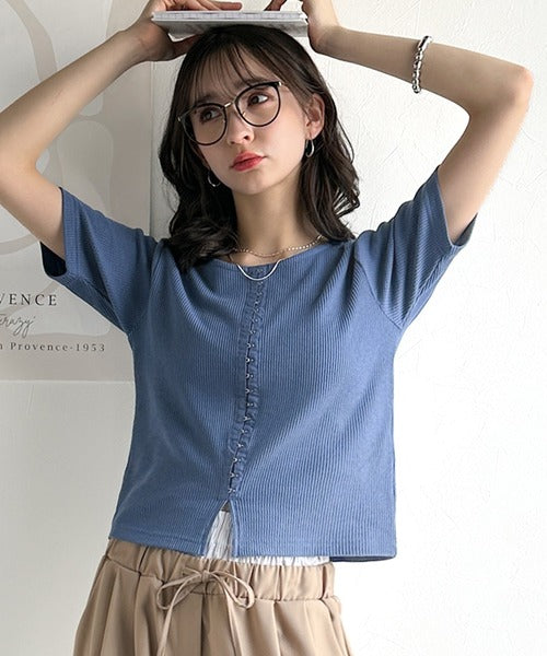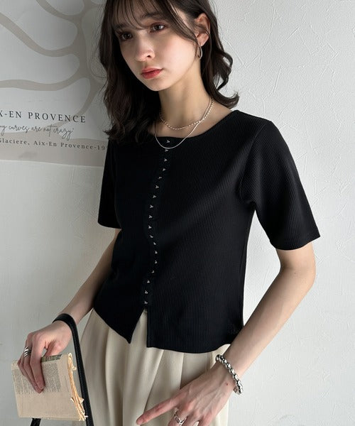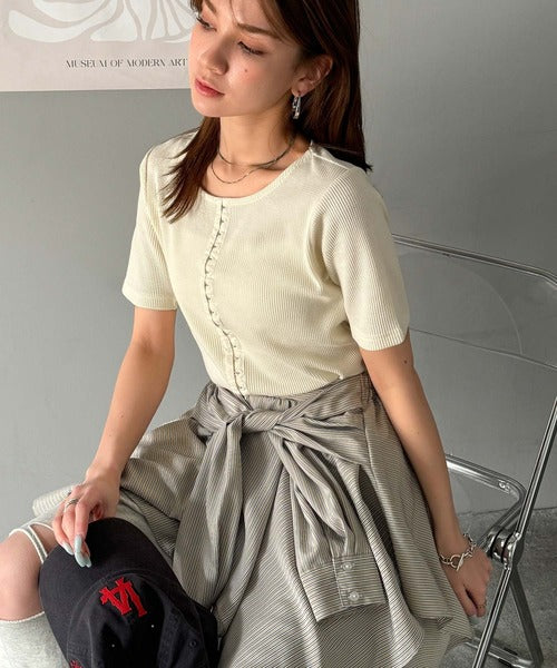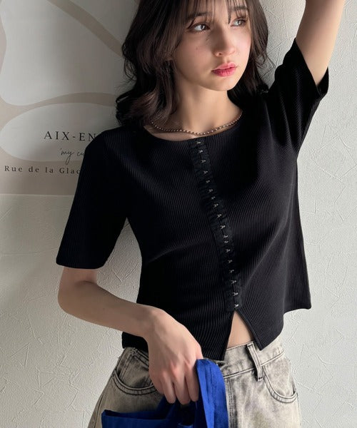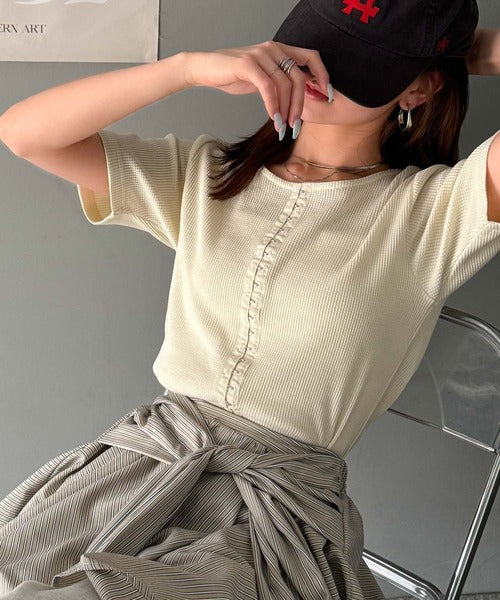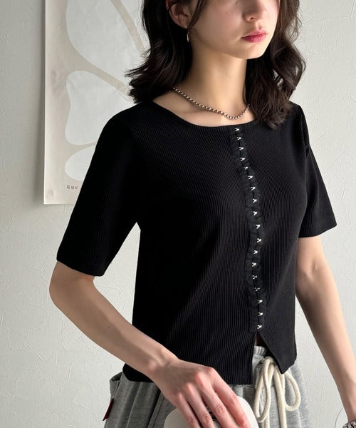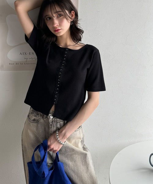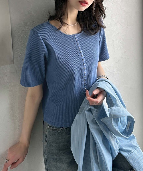 大人可愛いデコルテ魅せコンパクトT。フロントホックワッフル半袖トップス ce1020238