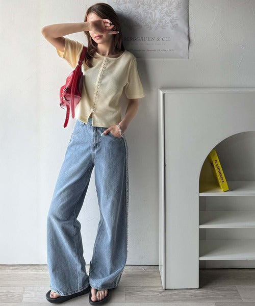 デニムやスラックスなどのシンプルなボトムスに合わせるだけで、