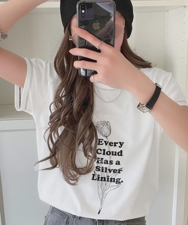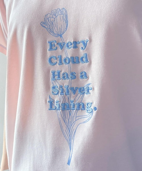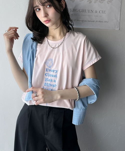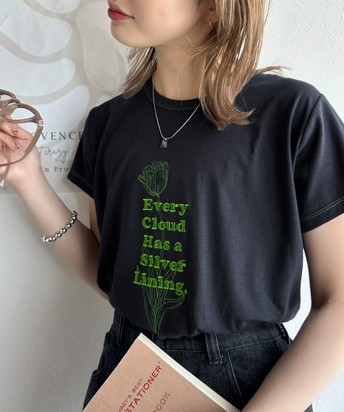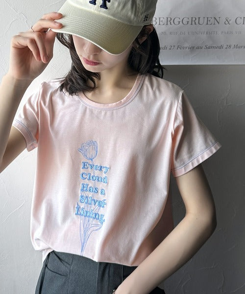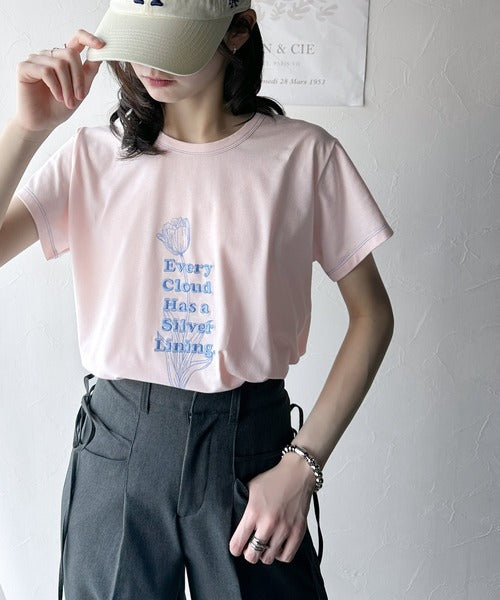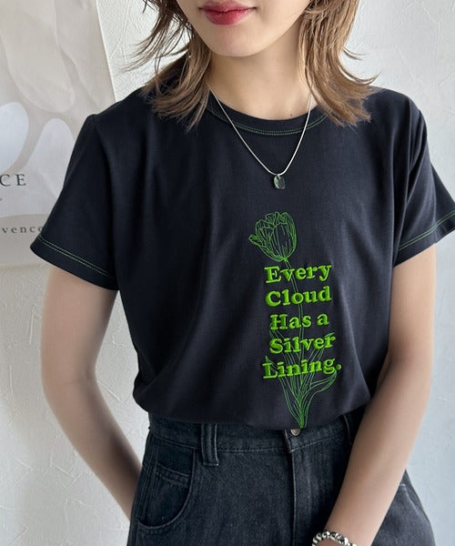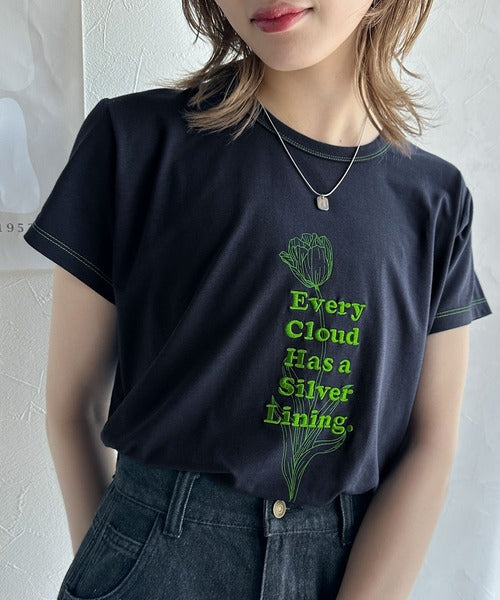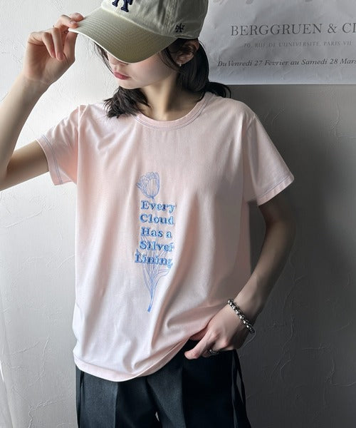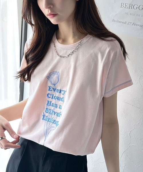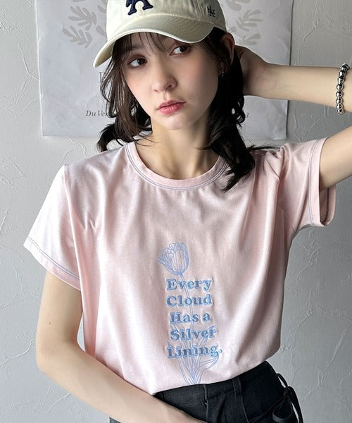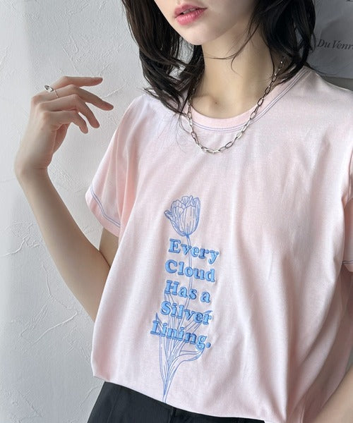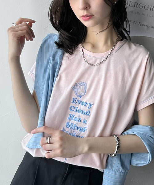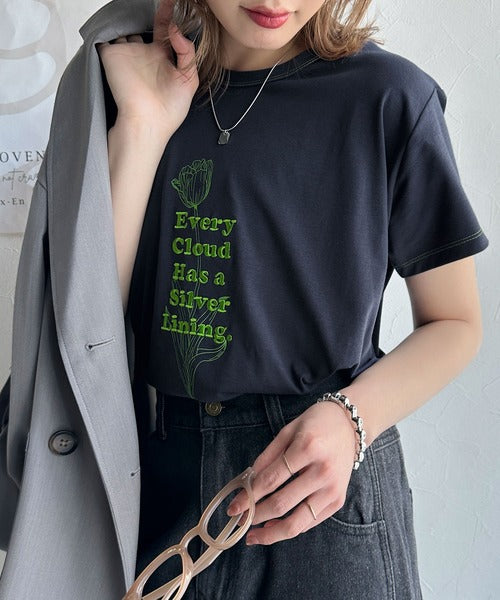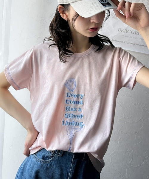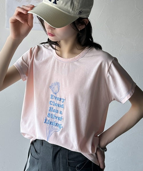 英字ロゴ刺繍とフラワープリントを絶妙にミックスしたフラワーグラフィックTシャツ。