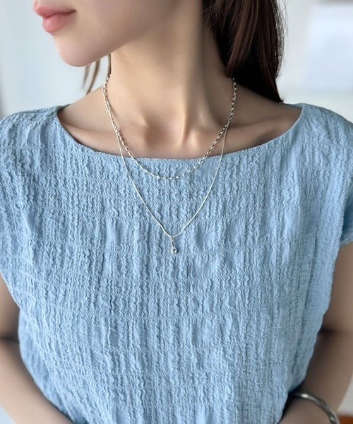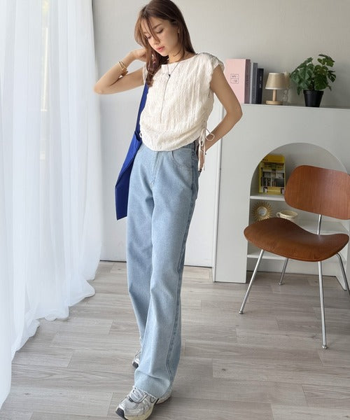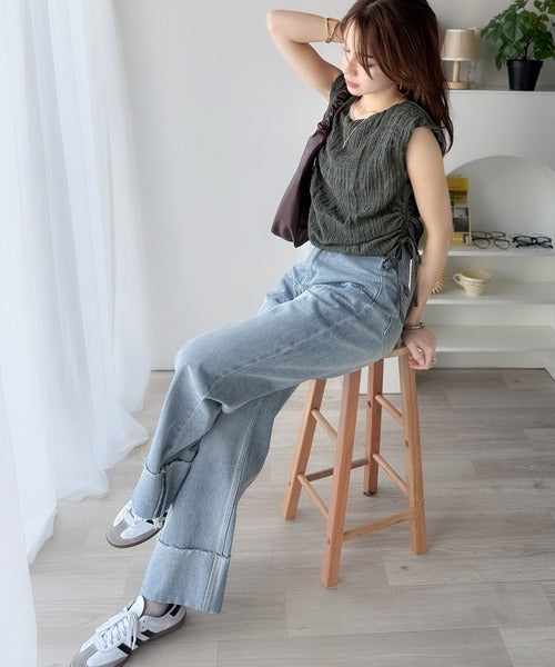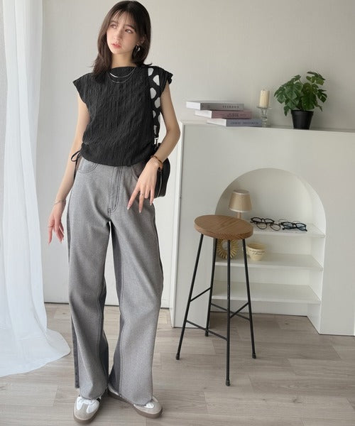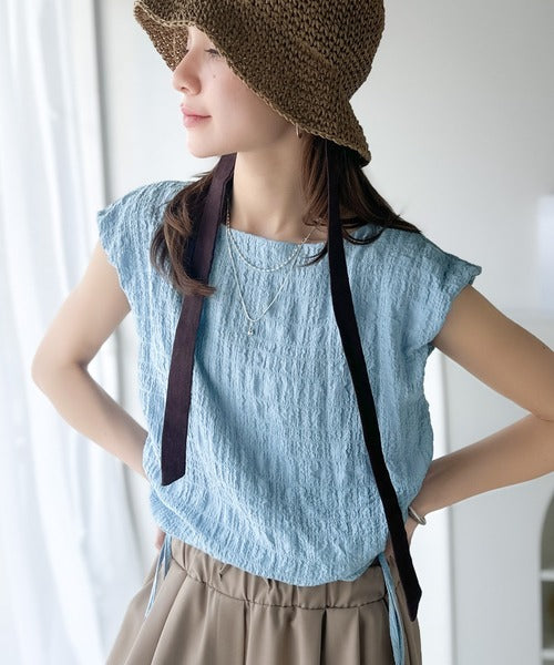 ポコポコ質感が涼しげ、夏の相棒トップス。ボートネックノースリーブサイドドロストリボンポコポコトップス ce1070164
