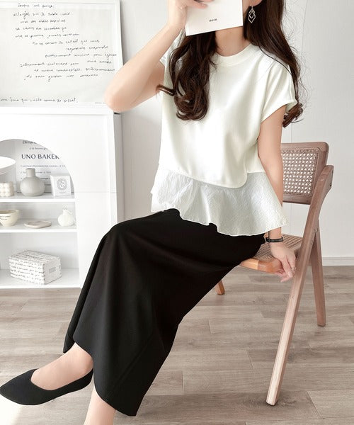 レイヤード風のドッキングデザインがトレンドライクな半袖トップス。