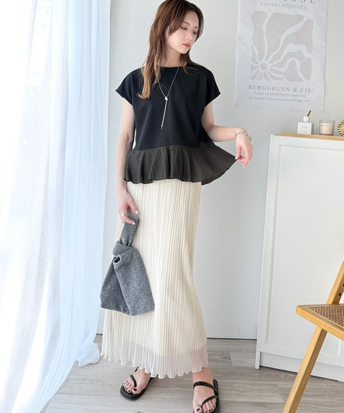 上品見えのカットソー×裾シアーナイロンの異素材mix
