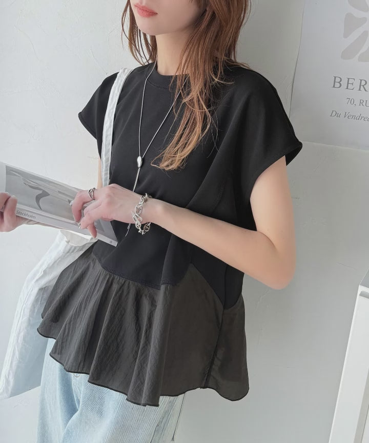 楽ちんなのに上品見え!裾フレア異素材切替フレンチスリーブブラウス ce1110103