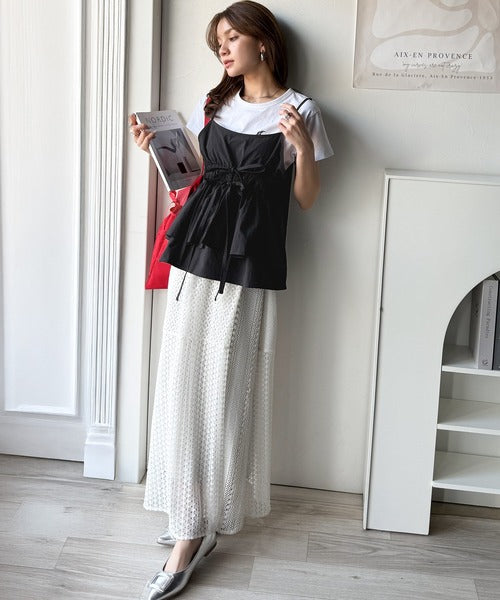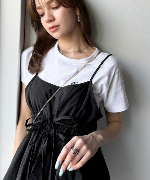 旬のレイヤードスタイルがこれ一着で即完成。ダブルリボン使いキャミ&ムーン刺繍半袖Tシャツセット ce1265004