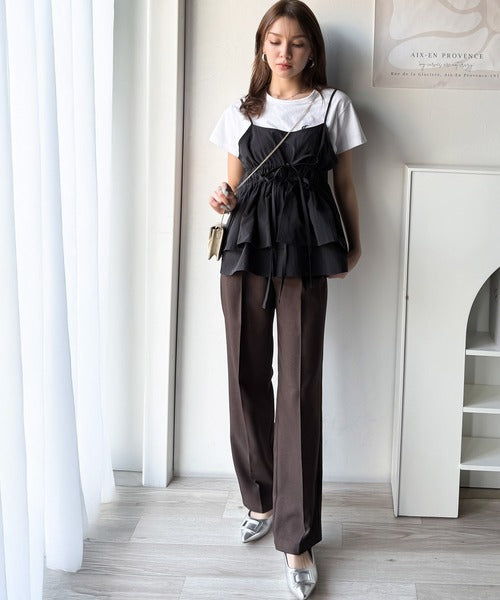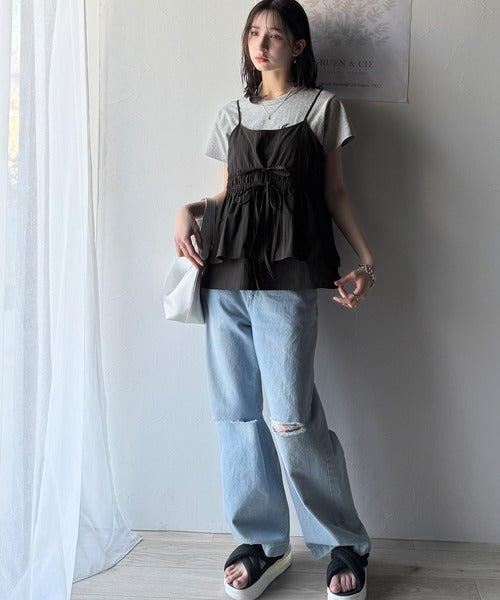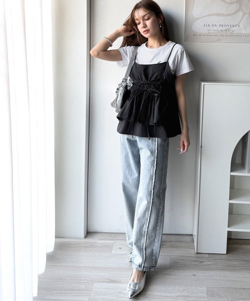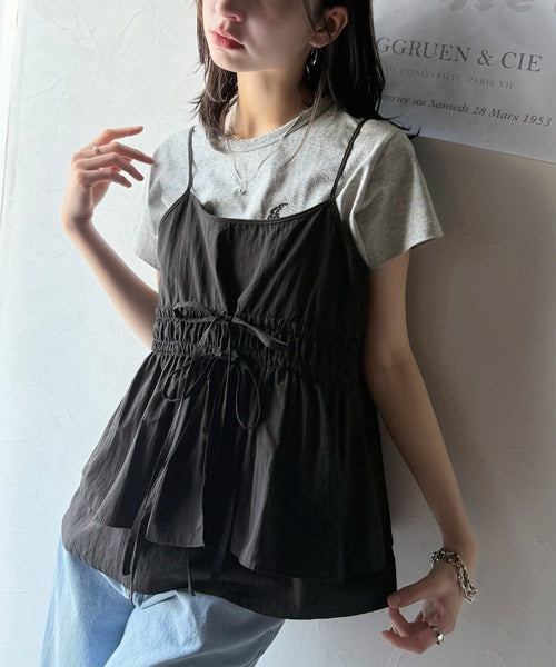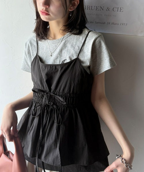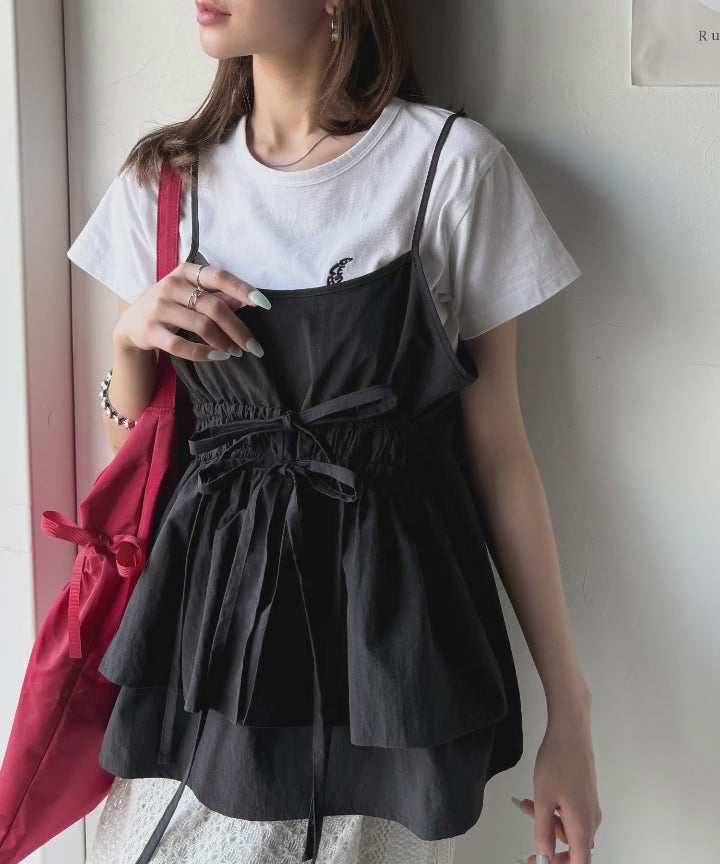 リボンキャミソールと刺繍Tシャツのセットアイテム。