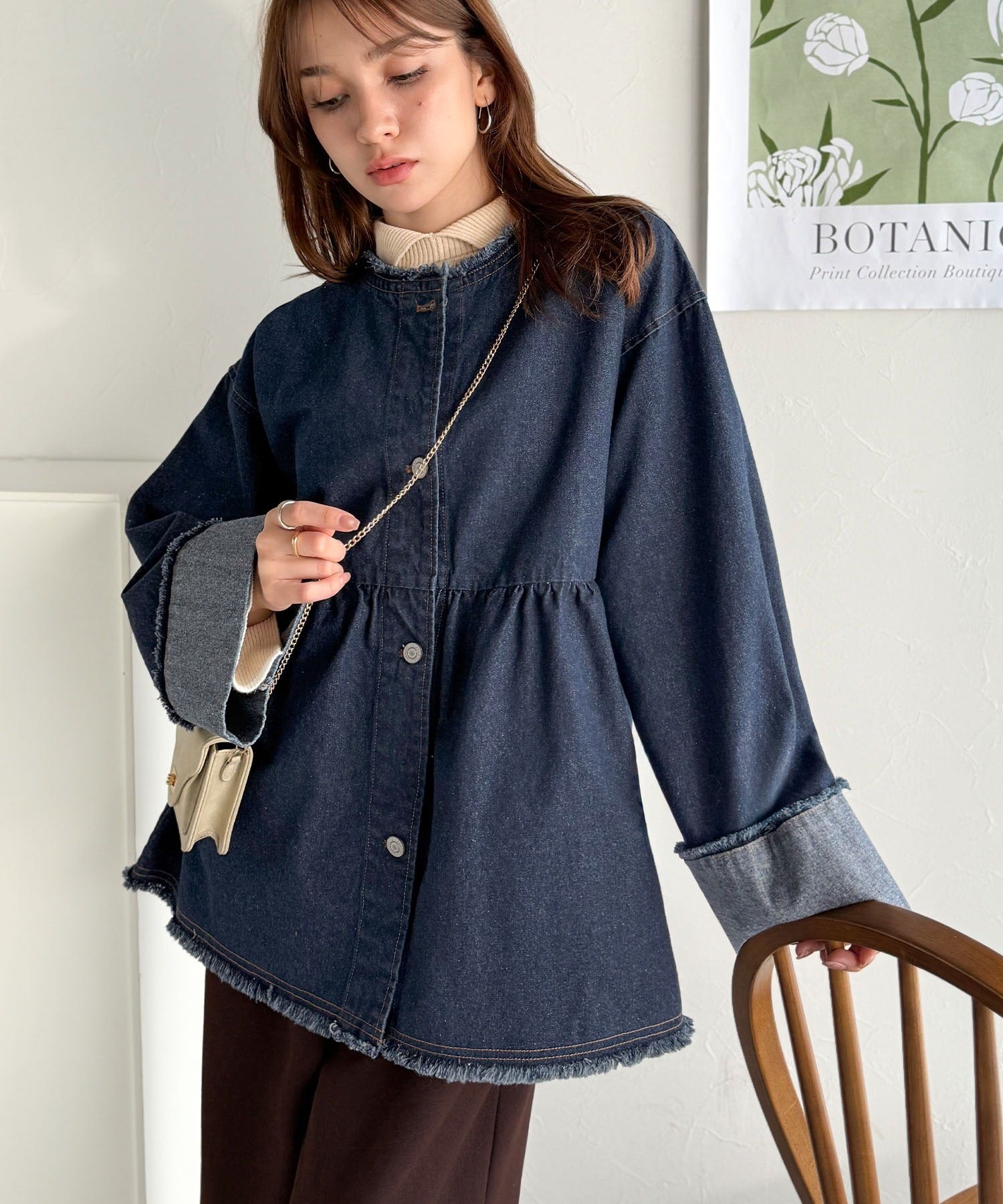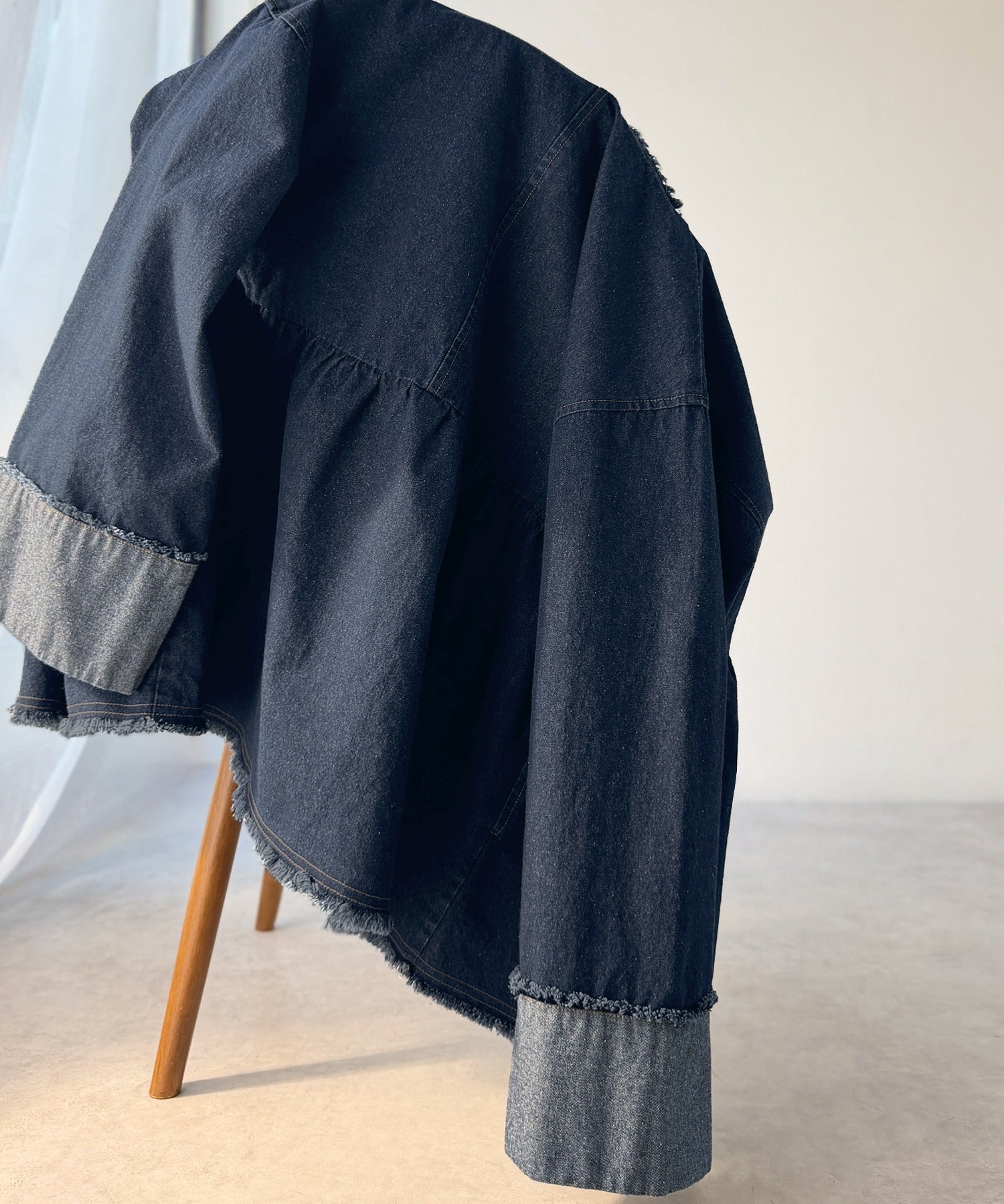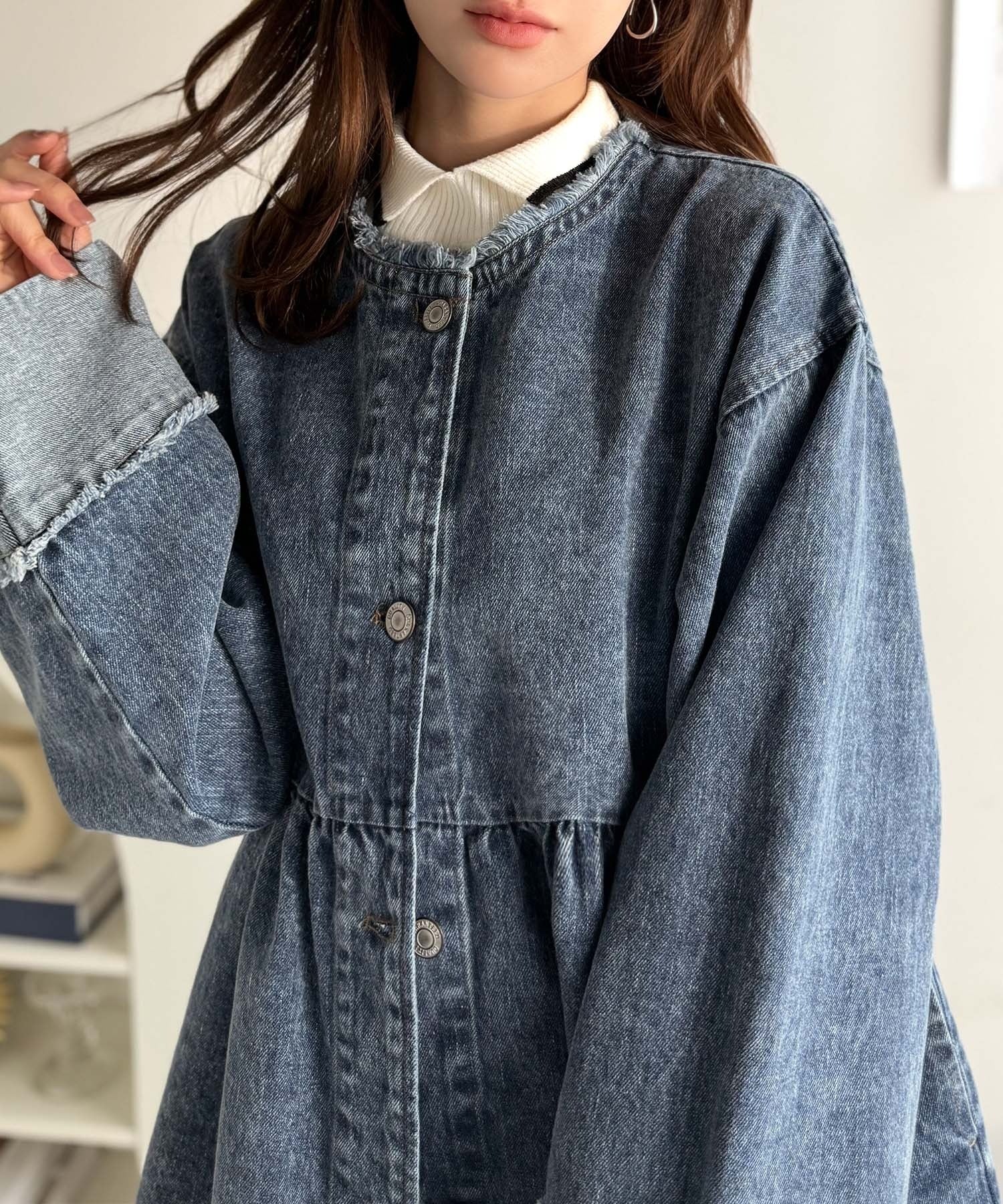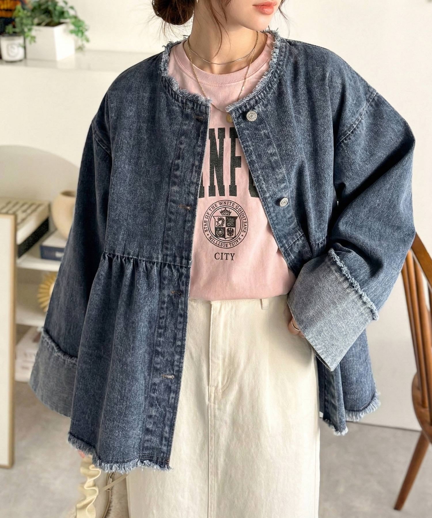 《daaco×クラシカルエルフコラボ》フリンジ×デニムの最強コンビ!綿100%ペプラムノーカラーデニムジャケット ce1010515