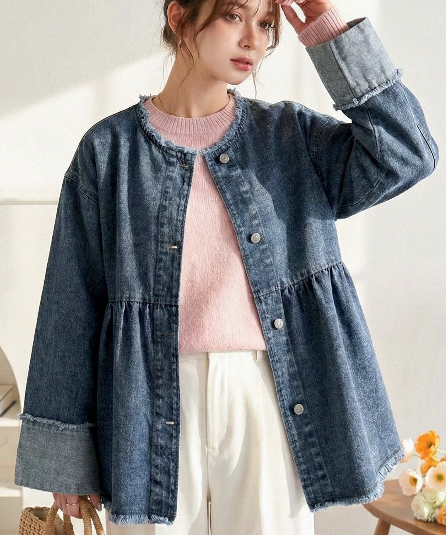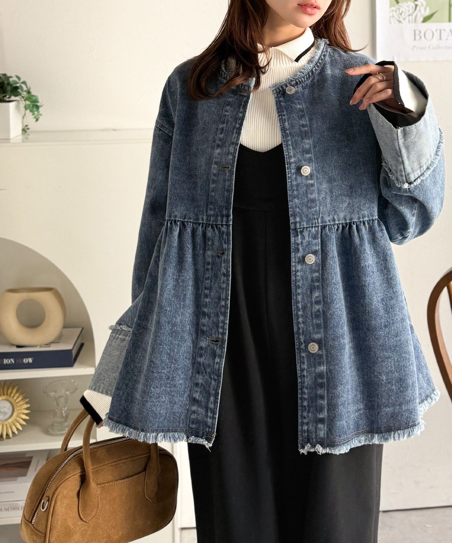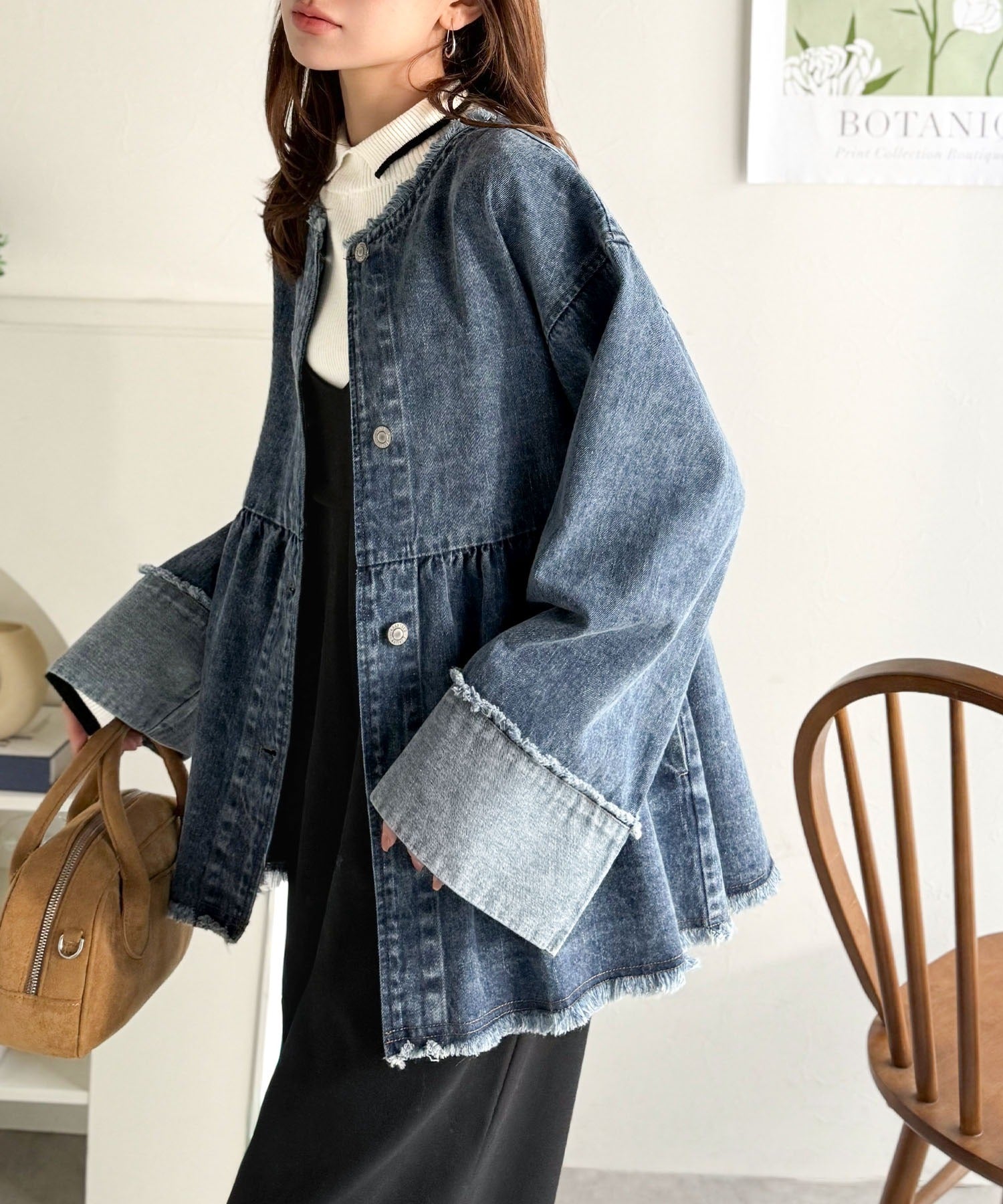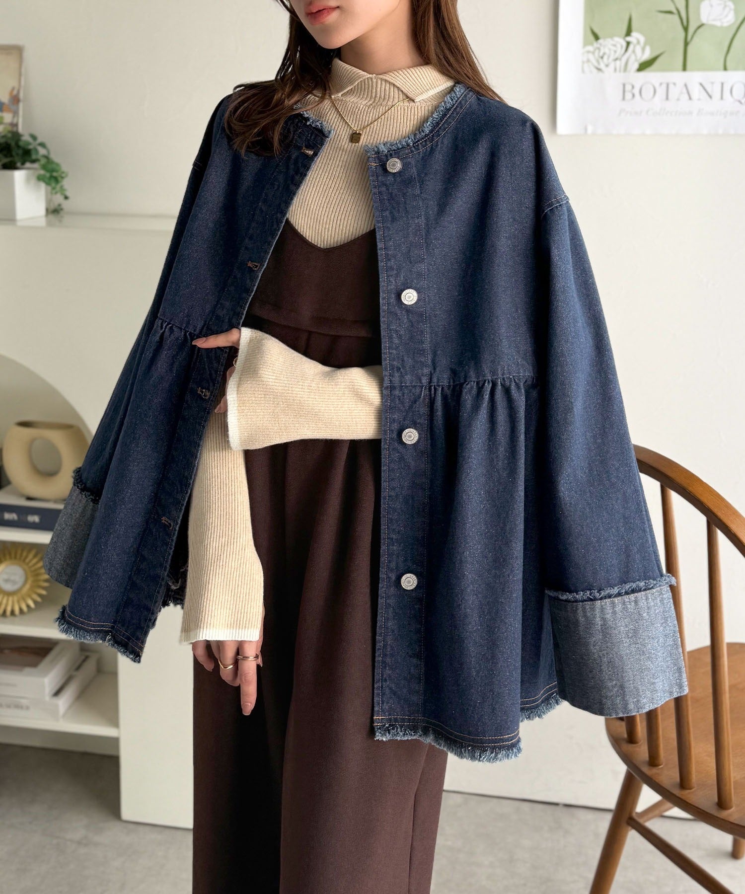 《daaco×クラシカルエルフコラボ》フリンジ×デニムの最強コンビ!綿100%ペプラムノーカラーデニムジャケット ce1010515