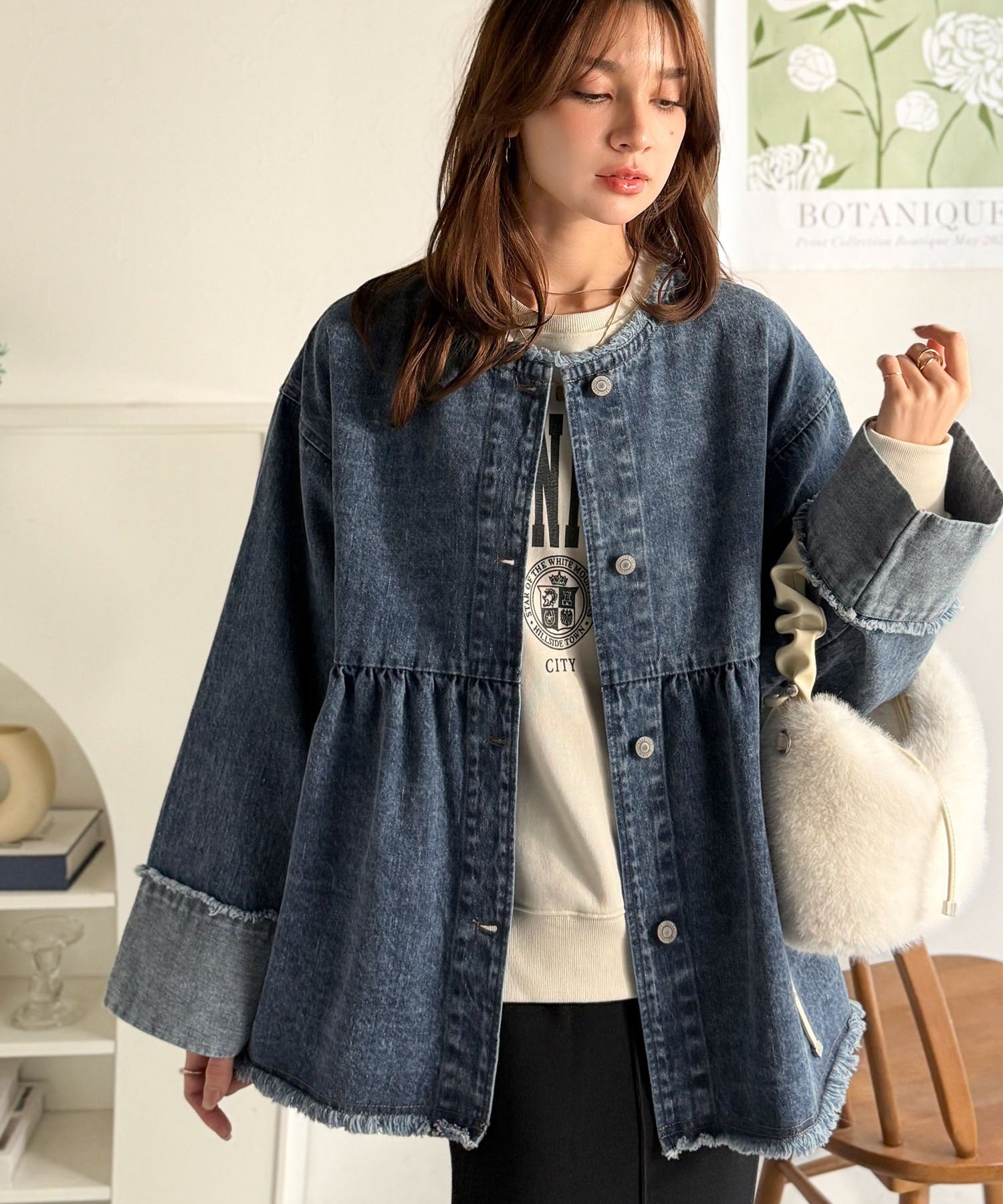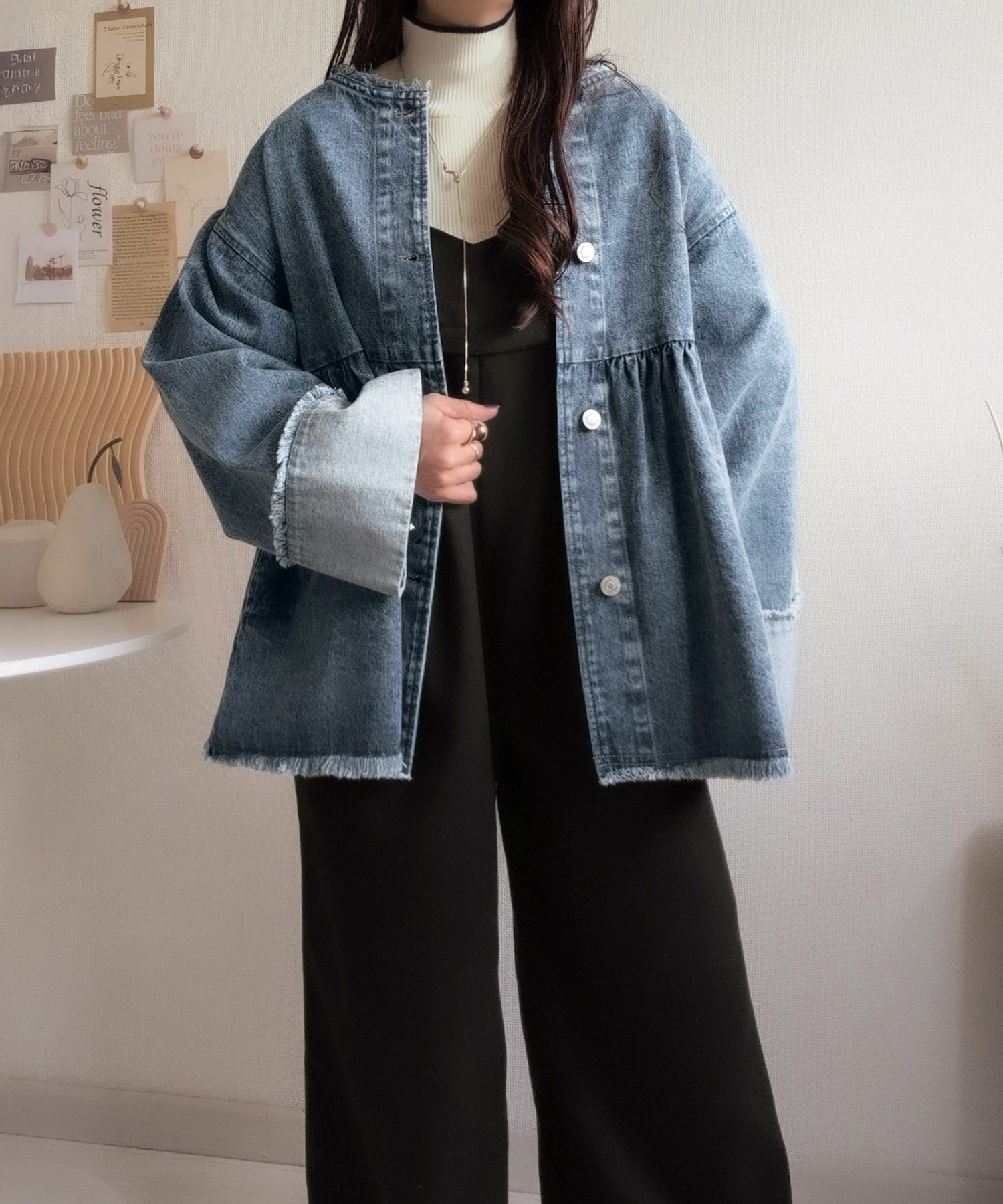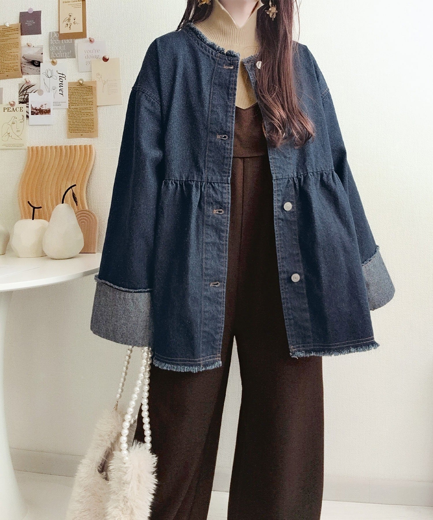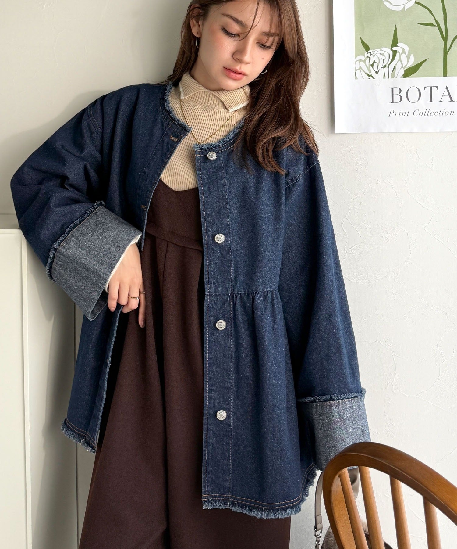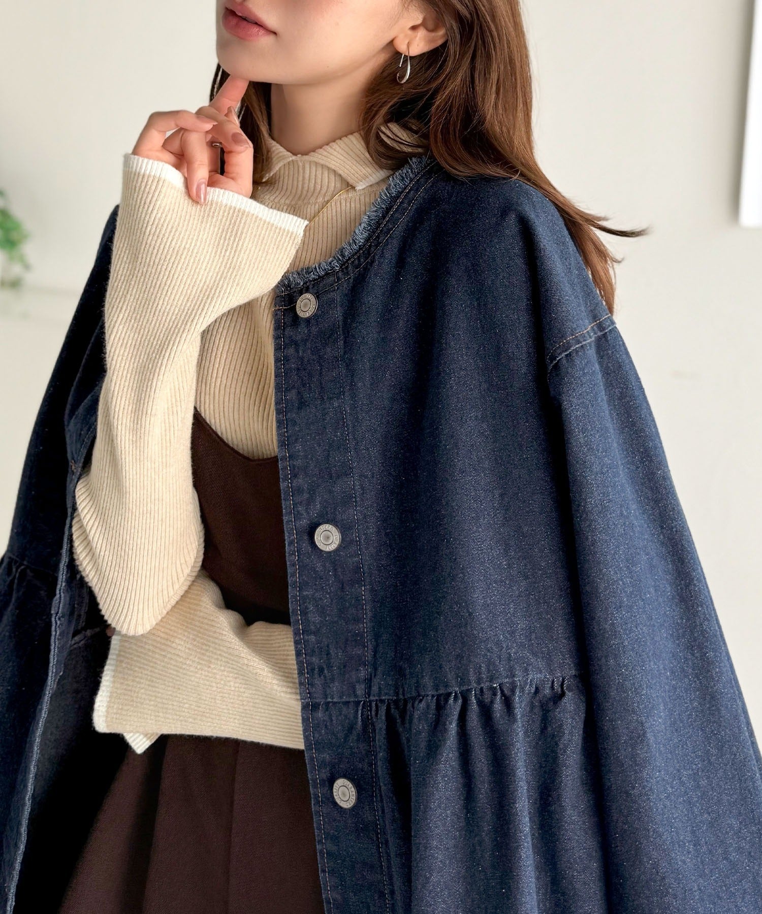 《daaco×クラシカルエルフコラボ》フリンジ×デニムの最強コンビ!綿100%ペプラムノーカラーデニムジャケット ce1010515
