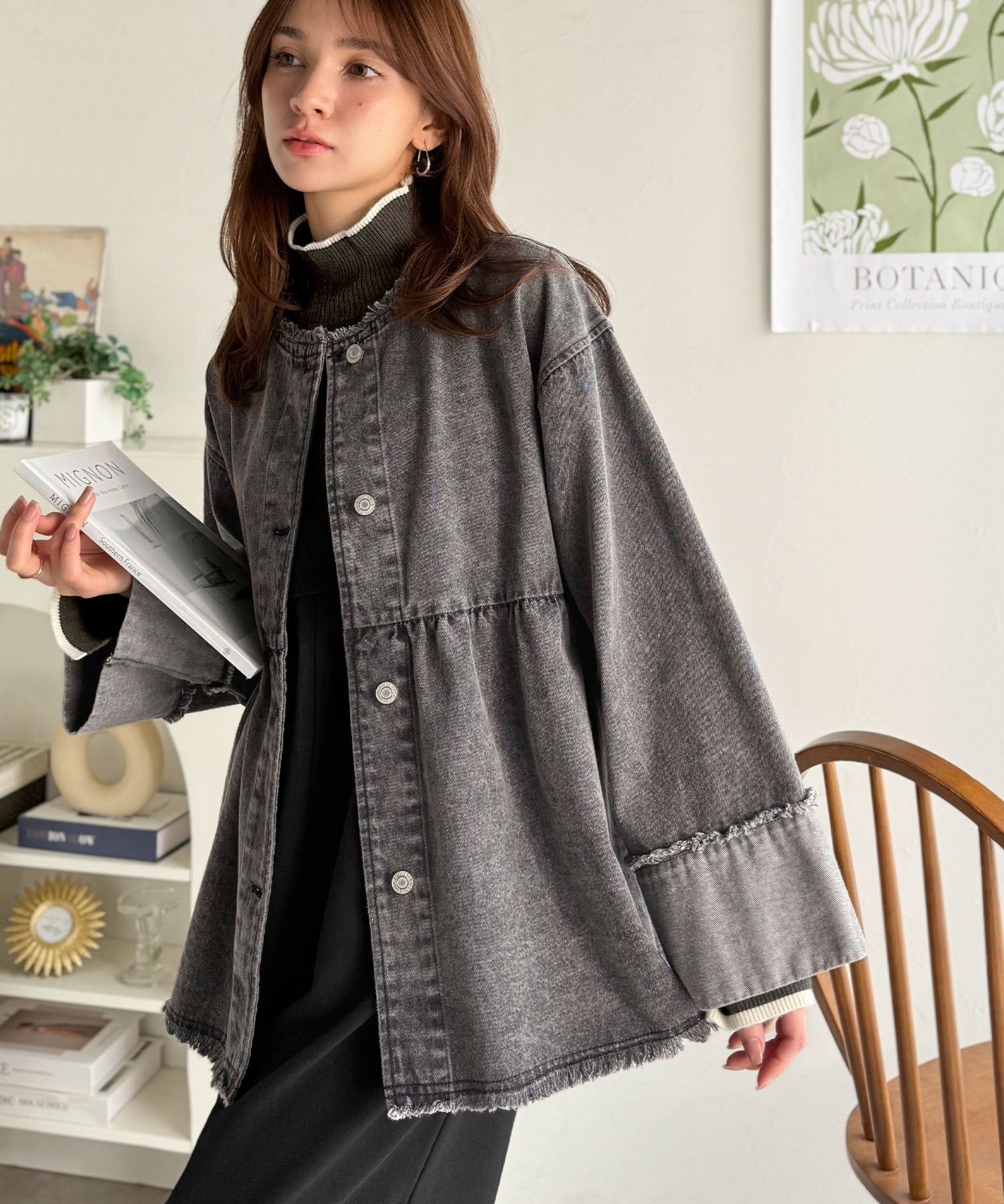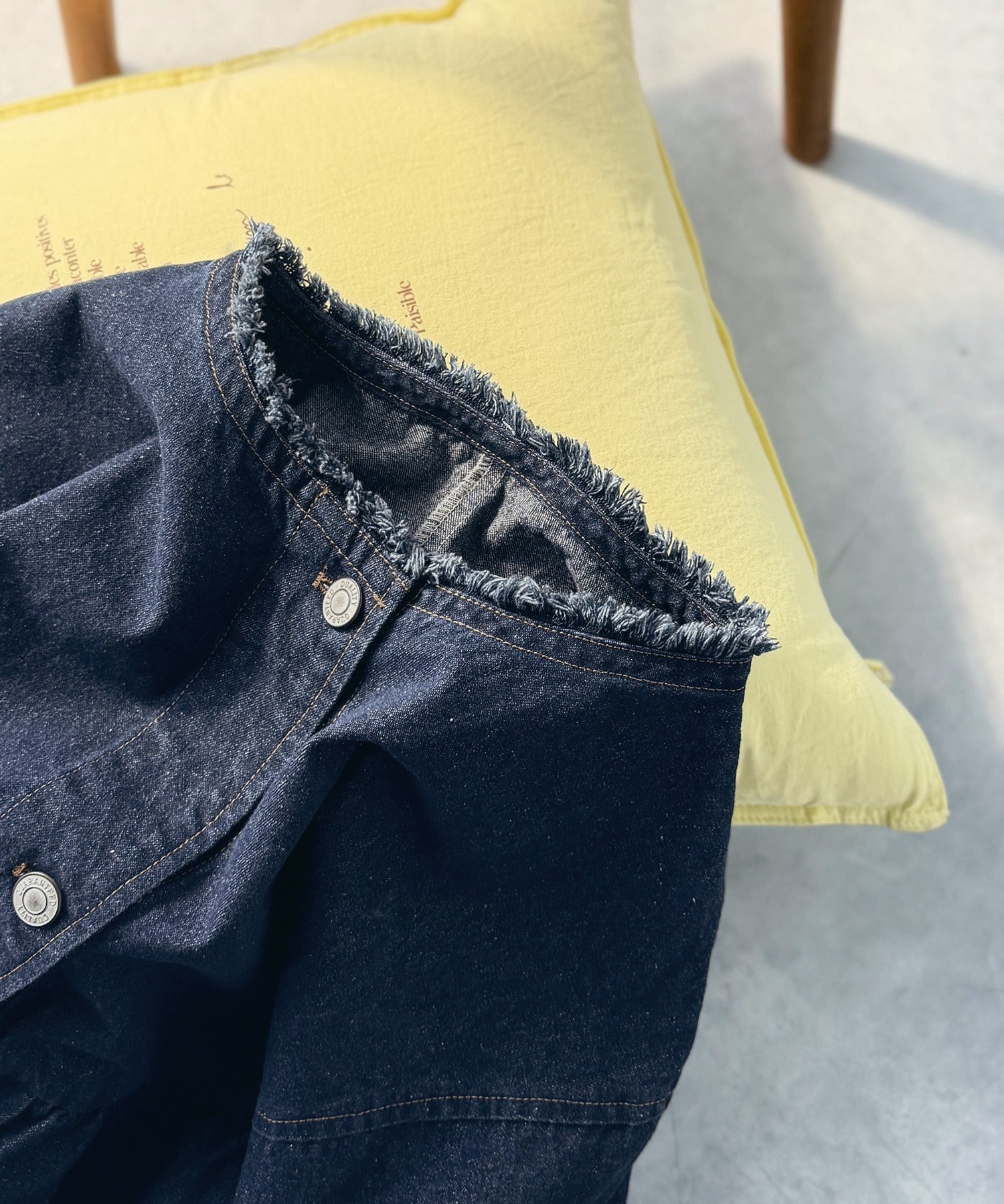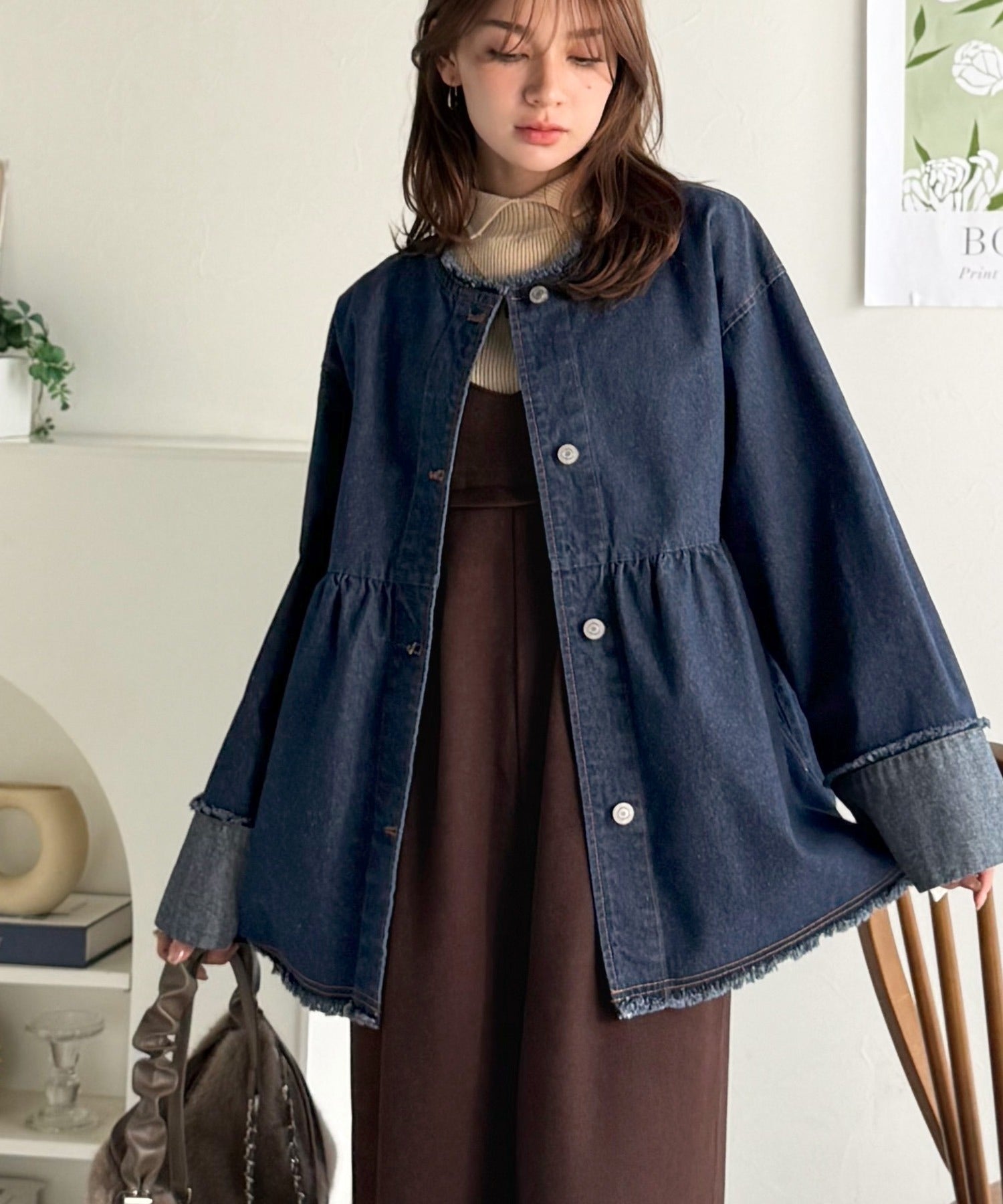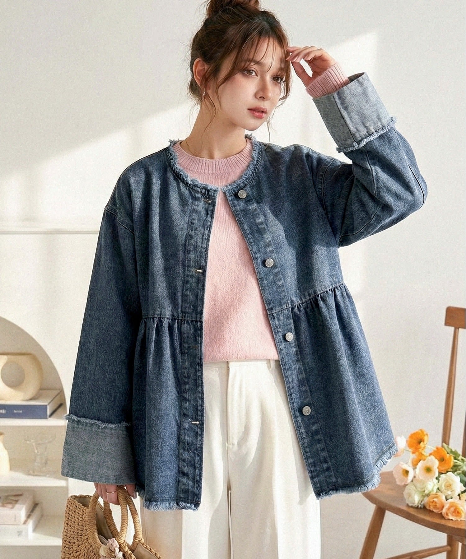 《daaco×クラシカルエルフコラボ》フリンジ×デニムの最強コンビ!綿100%ペプラムノーカラーデニムジャケット ce1010515