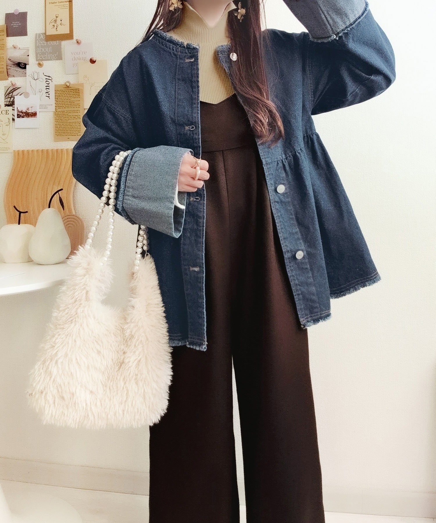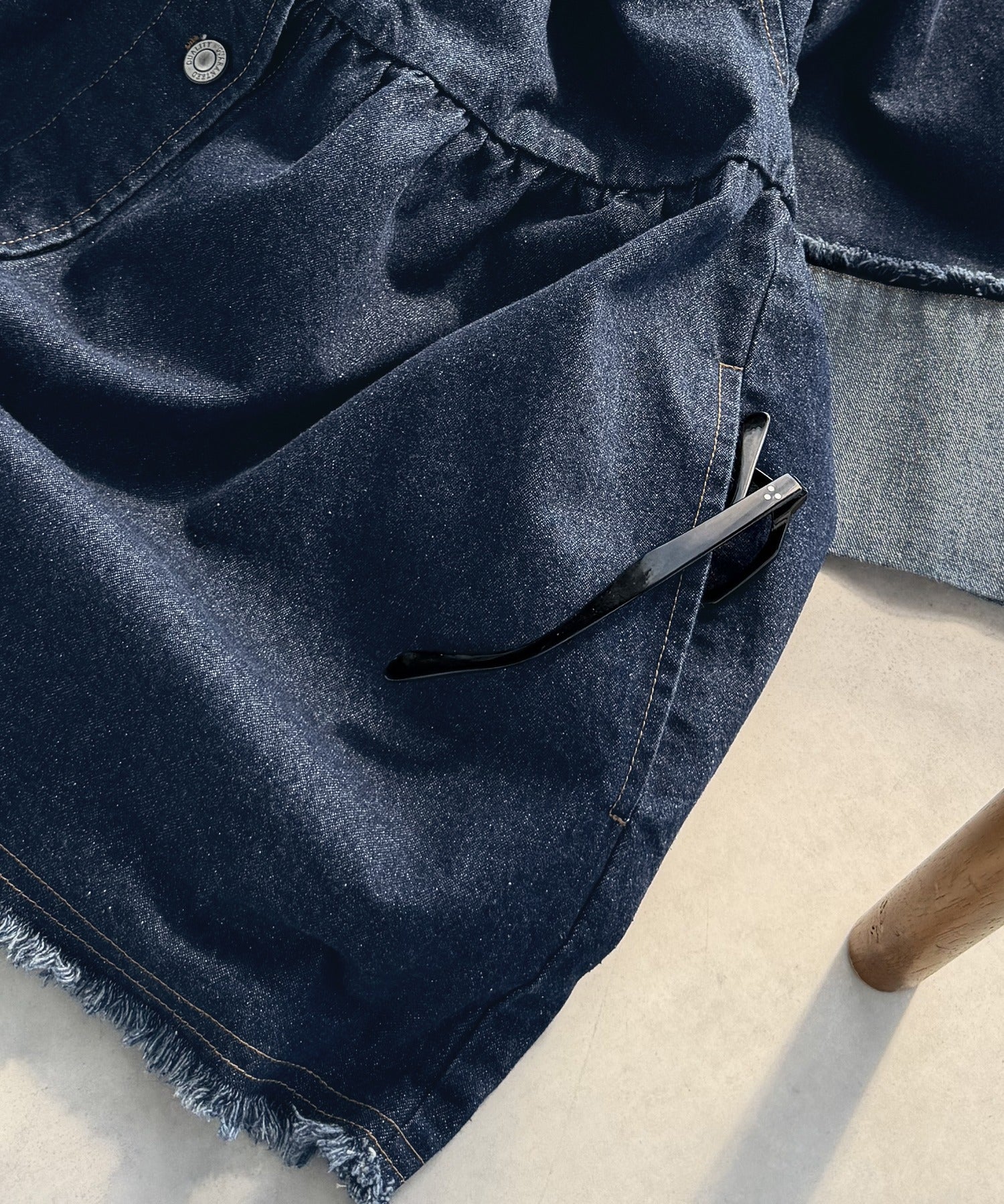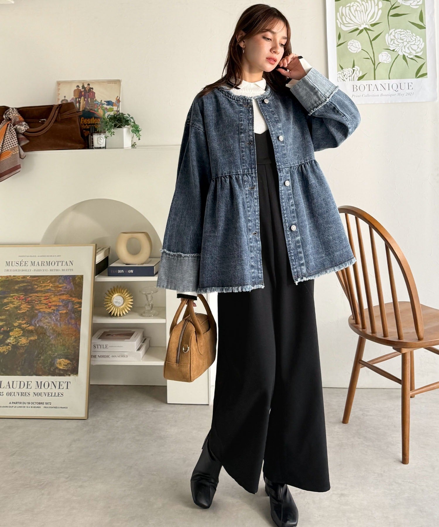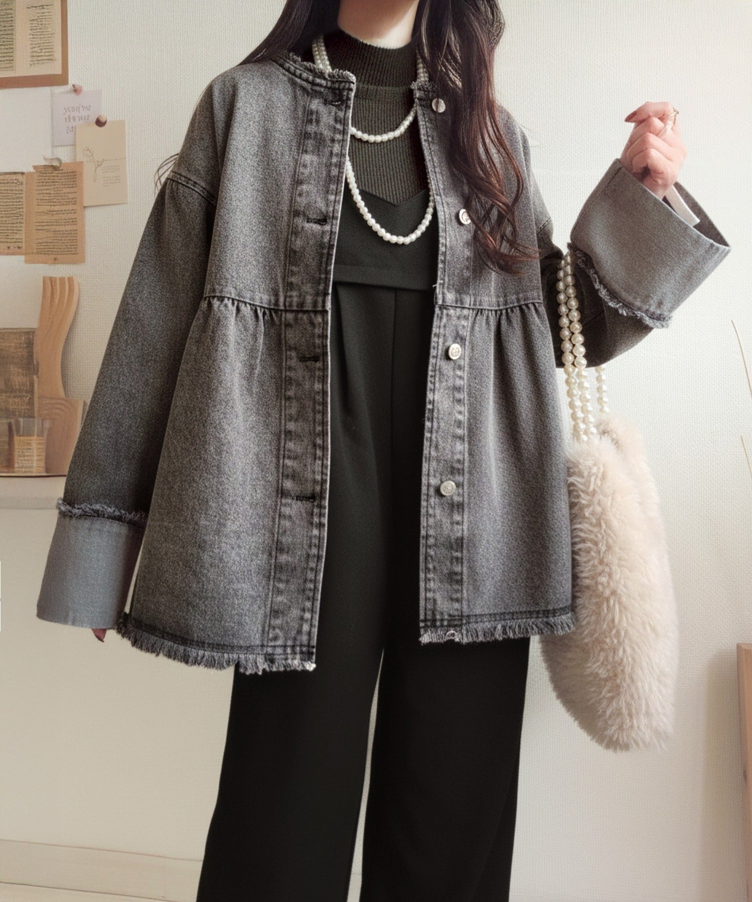 《daaco×クラシカルエルフコラボ》フリンジ×デニムの最強コンビ!綿100%ペプラムノーカラーデニムジャケット ce1010515