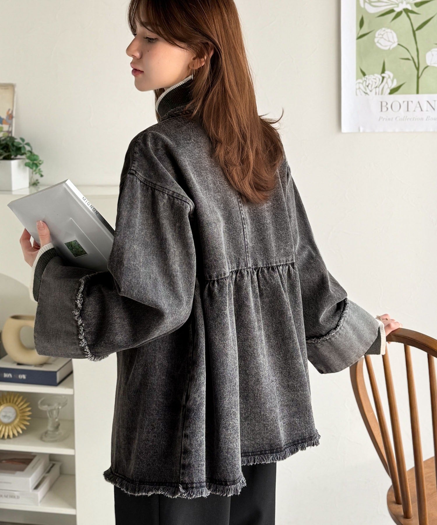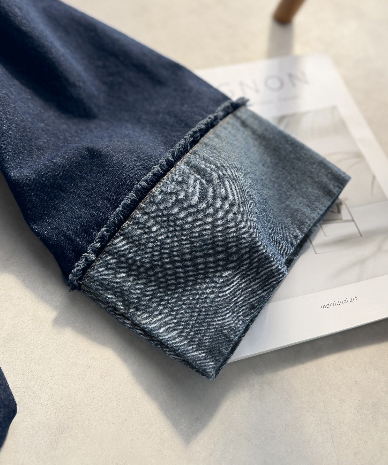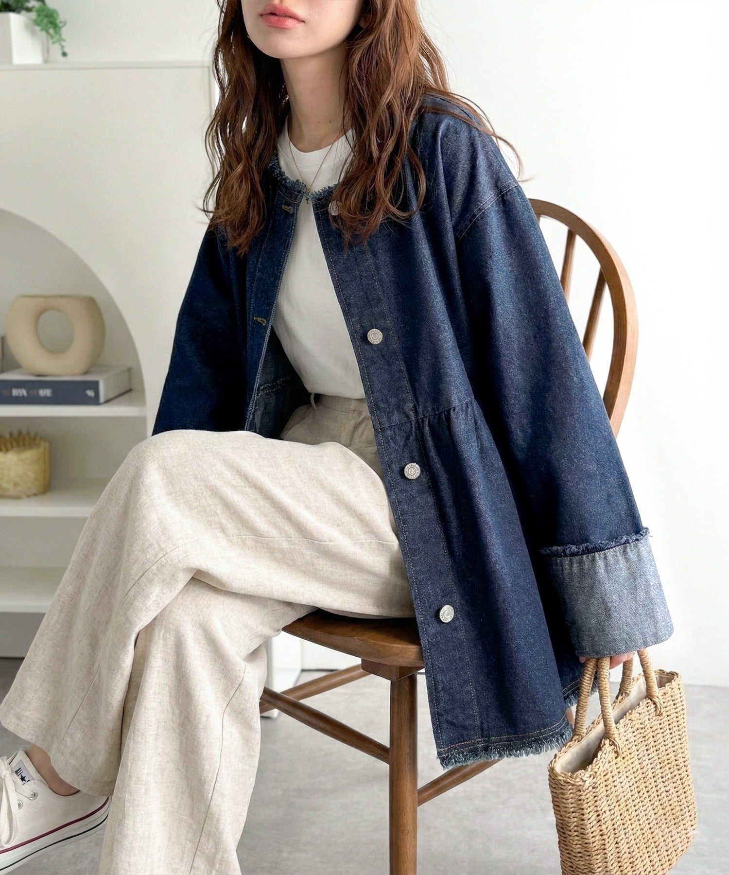 袖口は太めに折り返したデザインで、抜け感のある軽やかな印象に。