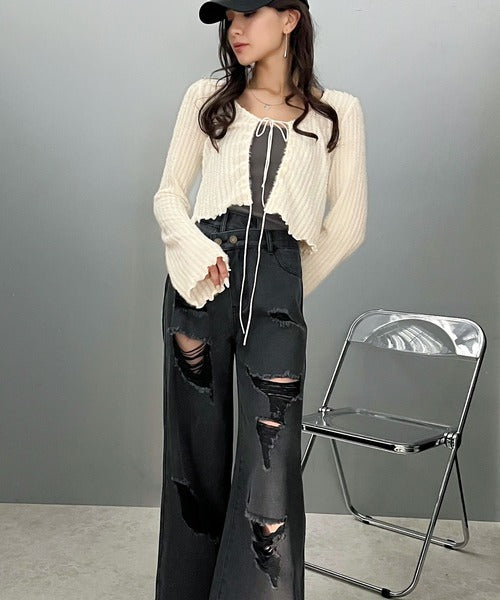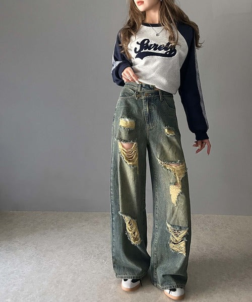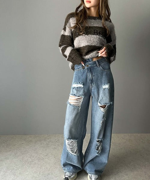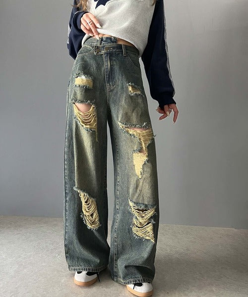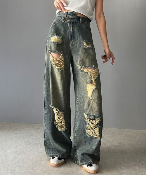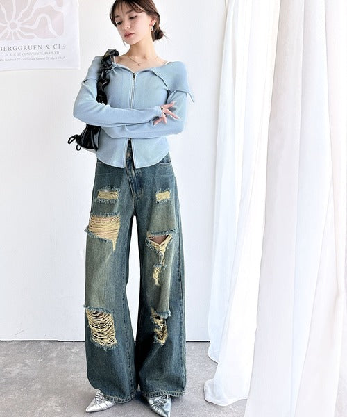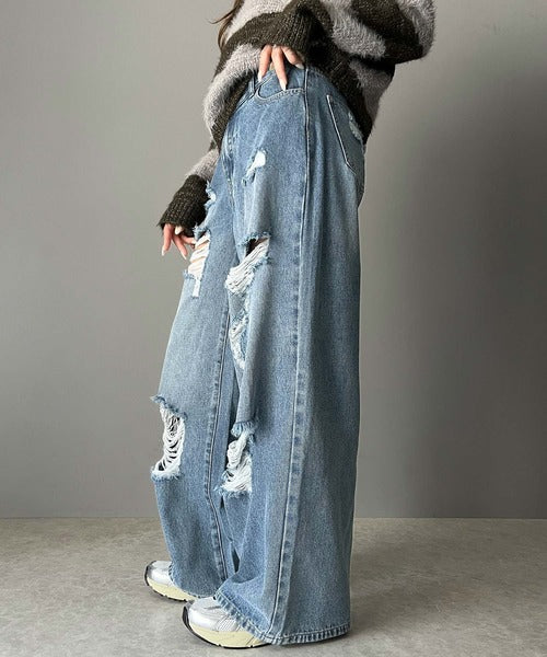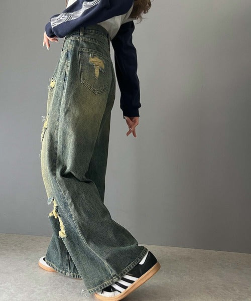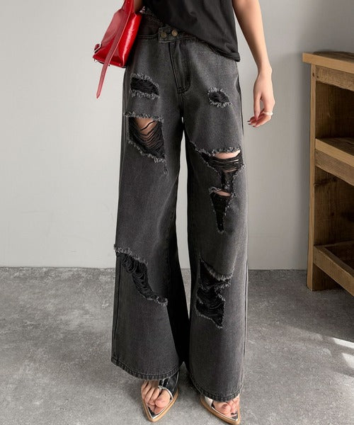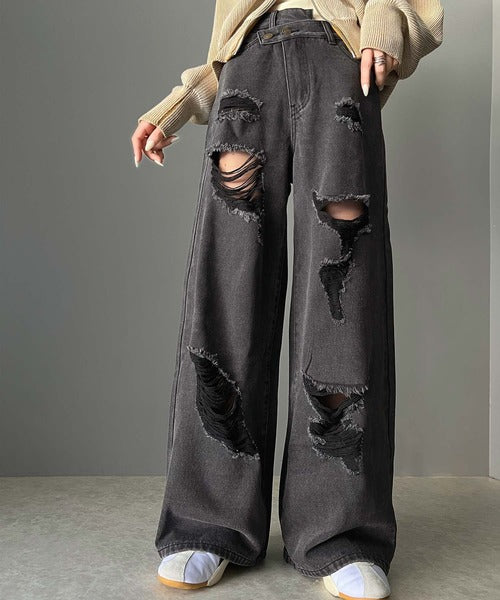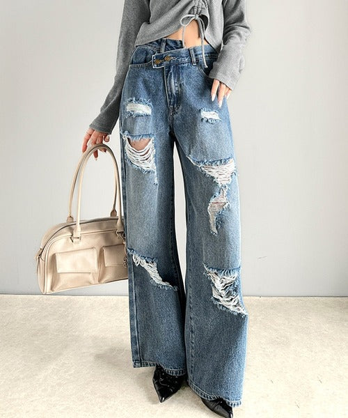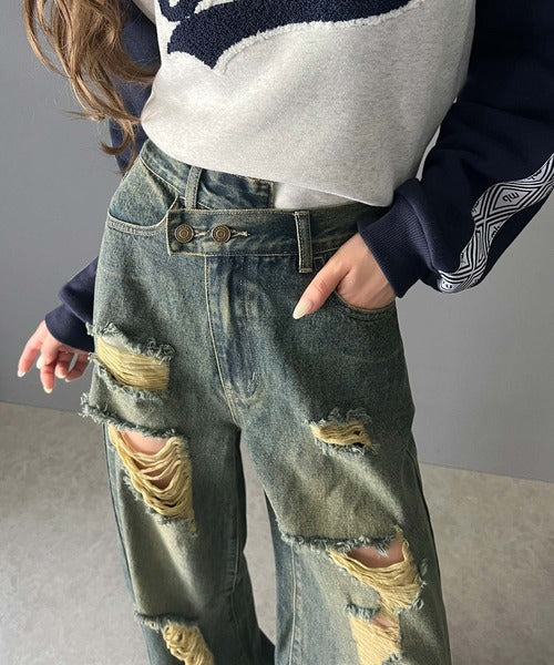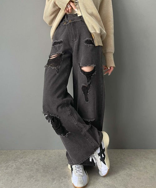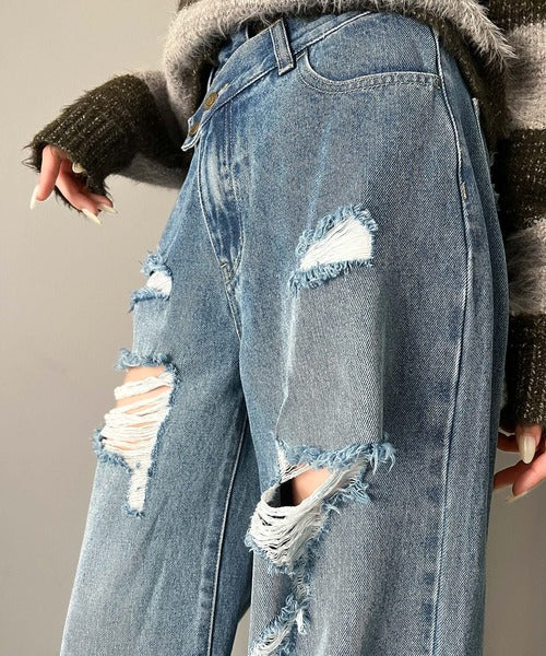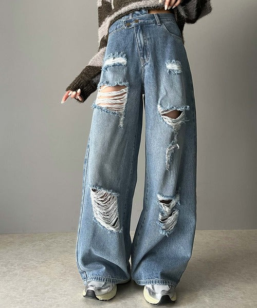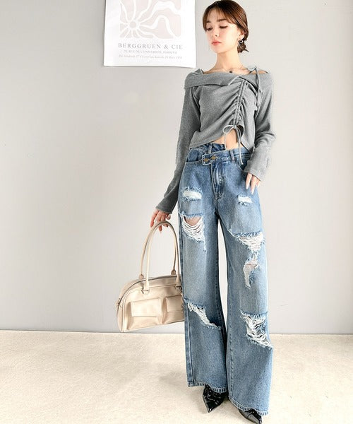 《Javaジャバコラボ》主役を飾る1本。アシメトリーウエストデザインクラッシュ加工ダメージワイドデニムパンツ jv0909004